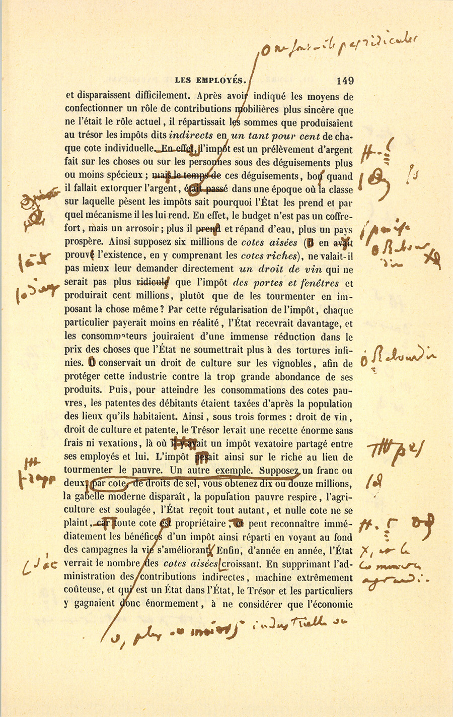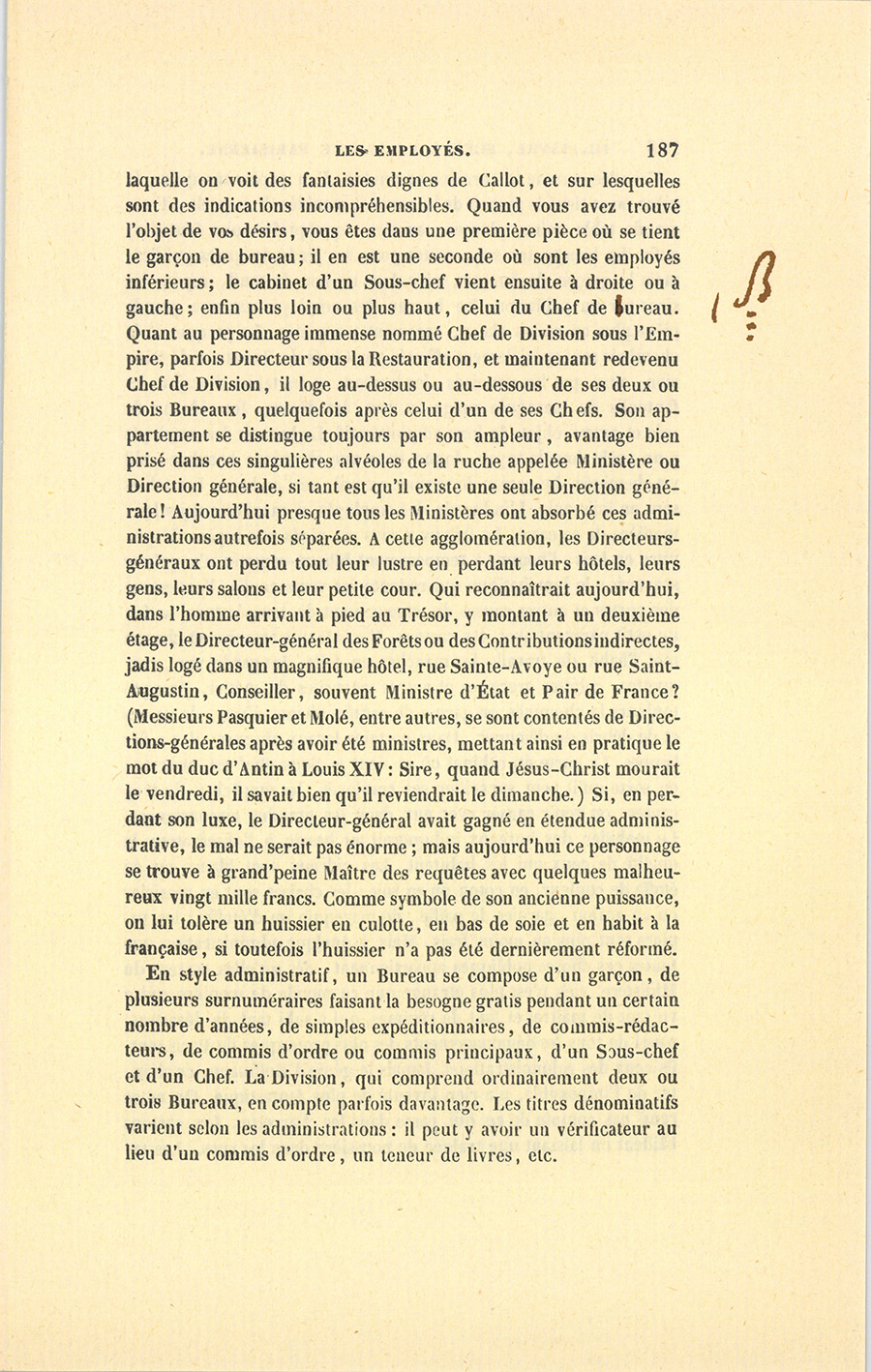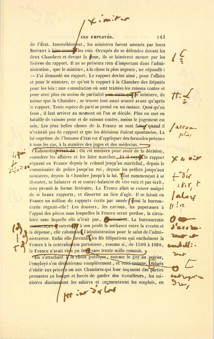 Autrefois, sous la monarchie, les armées bureaucratiques n’existaient point. Peu nombreux, les employés obéissaient à un premier ministre toujours en communication avec le souverain, et servaient ainsi presque directement le roi. Les chefs de ces serviteurs zélés étaient simplement nommés des premiers commis. Dans les parties d’administration que le roi ne régissait pas lui-même, comme les Fermes, les employés étaient à leurs chefs ce que les commis d’une maison de commerce sont à leurs patrons : ils apprenaient une science qui devait leur servir à se faire une fortune. Ainsi, le moindre point de la circonférence se rattachait au centre et en recevait la vie. Il y avait donc dévouement et foi. Depuis 1789, l’État, la patrie si l’on veut, a remplacé le Prince. Au lieu de relever directement d’un premier magistrat politique, les commis sont devenus, malgré nos belles idées sur la patrie, des employés du gouvernement, et leurs chefs flottent à tous les vents d’un pouvoir appelé Ministère qui ne sait pas la veille s’il existera le lendemain. Le courant des affaires devant toujours s’expédier, il surnage une certaine quantité de commis indispensables quoique congéables à merci et qui veulent rester en place. La bureaucratie, pouvoir gigantesque mis en mouvement par des nains, est née ainsi. Si en subordonnant toute chose et tout homme à sa volonté, Napoléon avait retardé pour un moment l’influence de la bureaucratie, ce rideau pesant placé entre le bien à faire et celui qui peut l’ordonner, elle s’était définitivement organisée sous le gouvernement constitutionnel, inévitablement ami des médiocrités, grand amateur de pièces probantes et de comptes, enfin tracassier comme une petite bourgeoise. Heureux de voir les ministres en lutte constante avec quatre cents petits esprits, avec dix ou douze têtes ambitieuses et de mauvaise foi, les Bureaux se hâtèrent de se rendre nécessaires en se substituant à l’action vivante par l’action écrite, et ils créèrent une puissance d’inertie appelée le Rapport. Expliquons le Rapport.