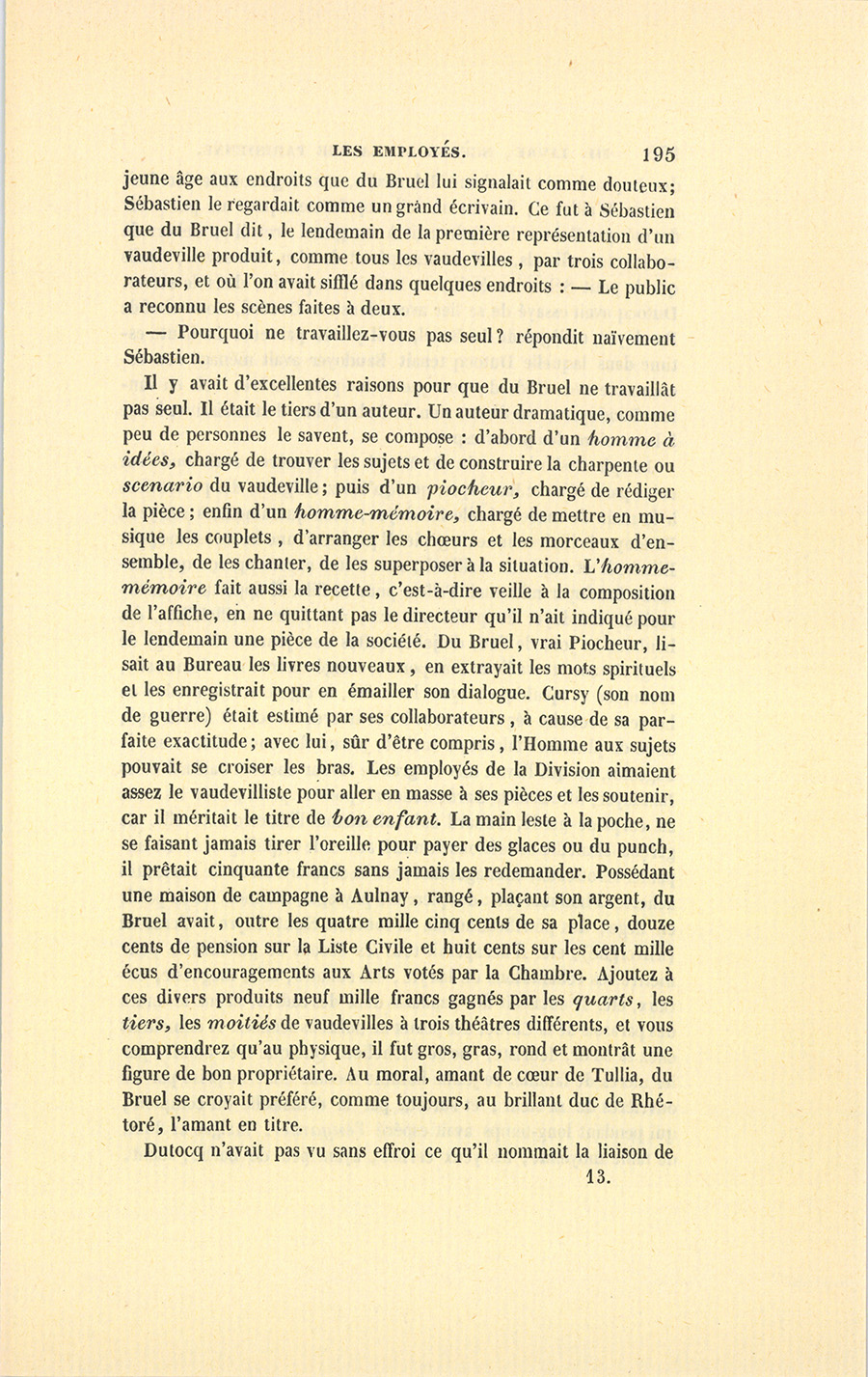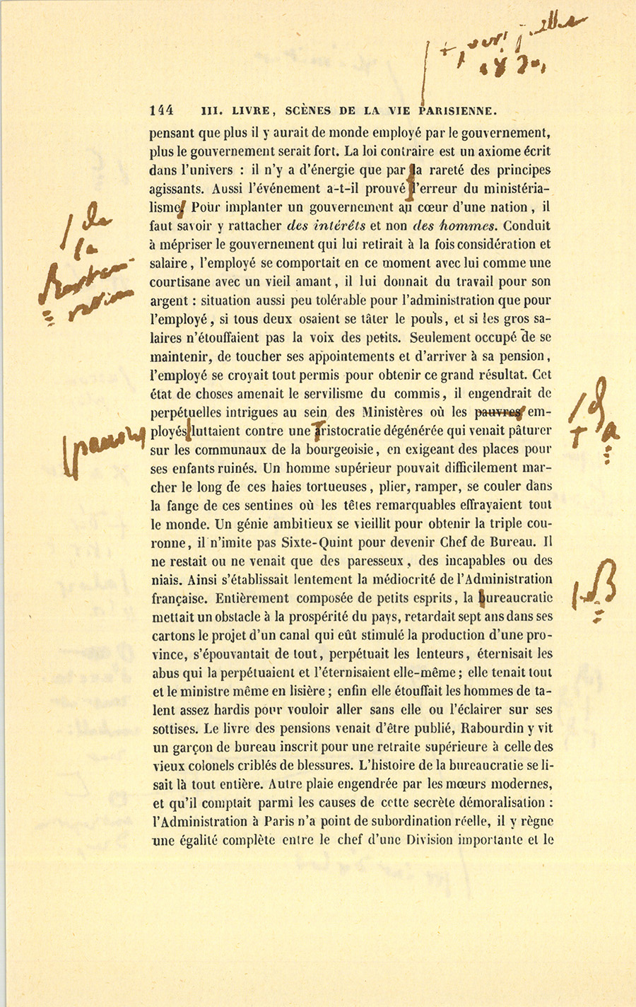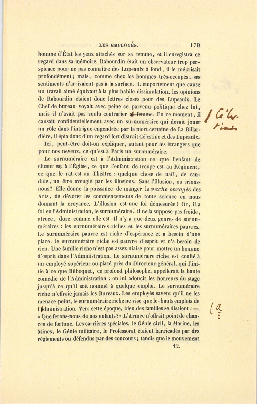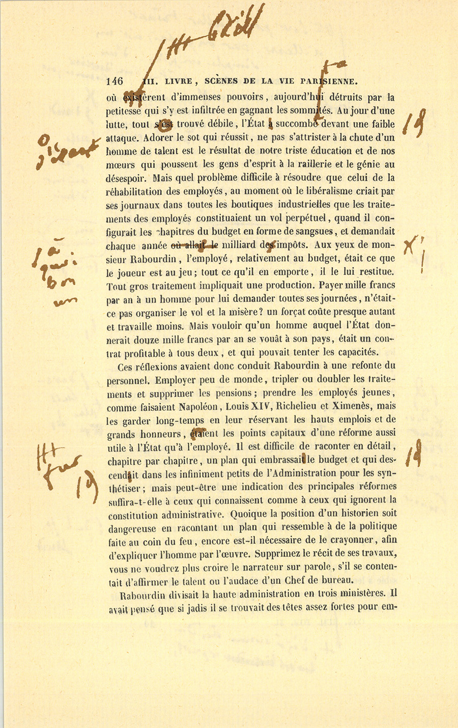 Selon monsieur Rabourdin, cent employés à douze mille francs {p. 330} feraient mieux et plus promptement que mille employés à douze cents francs.