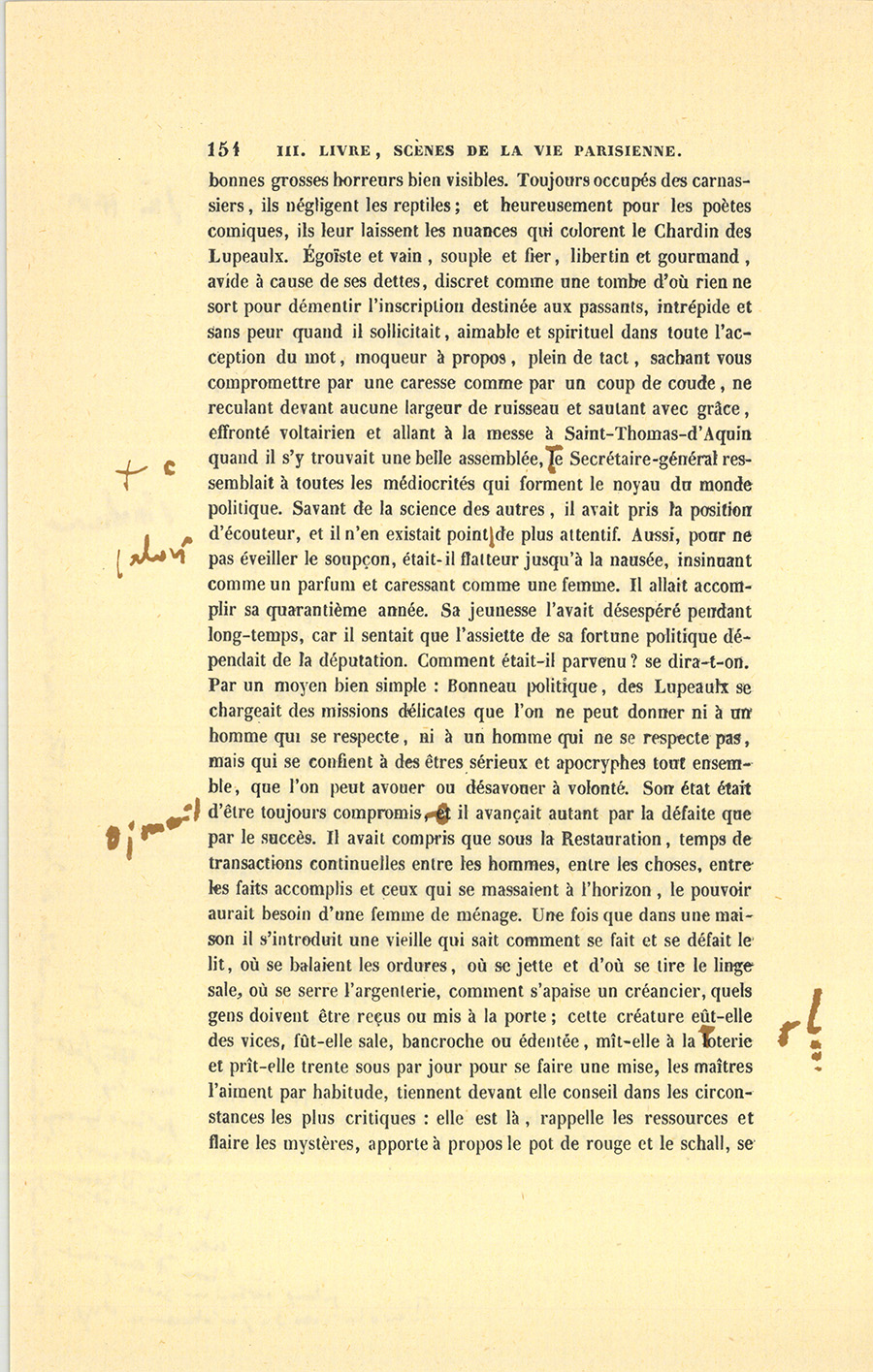 Les moralistes déploient ordinairement leur verve sur les abominations transcendantes. Pour eux, les crimes sont à la cour d’Assises ou à la Police correctionnelle, mais les finesses sociales leur échappent ; l’habileté qui triomphe sous les armes du Code est au-dessus ou au-dessous d’eux, ils n’ont ni loupe ni longue-vue ; il leur faut de {p. 154} bonnes grosses horreurs bien visibles. Toujours occupés des carnassiers, ils négligent les reptiles ; et heureusement pour les poètes comiques, ils leur laissent les nuances qui colorent le Chardin des Lupeaulx. Égoïste et vain, souple et fier, libertin et gourmand, avide à cause de ses dettes, discret comme une tombe d’où rien ne sort pour démentir l’inscription destinée aux passants, intrépide et sans peur quand il sollicitait, aimable et spirituel dans toute l’acception du mot, moqueur à propos, plein de tact, sachant vous compromettre par une caresse comme par un coup de coude, ne reculant devant aucune largeur de ruisseau et sautant avec grâce, effronté voltairien et allant à la messe à Saint-Thomas-d’Aquin quand il s’y trouvait une belle assemblée, ce Secrétaire-général ressemblait à toutes les médiocrités qui forment le noyau du monde politique. Savant de la science des autres, il avait pris la position d’écouteur, et il n’en existait point alors de plus attentif. Aussi, pour ne pas éveiller le soupçon, était-il flatteur jusqu’à la nausée, insinuant comme un parfum et caressant comme une femme. Il allait accomplir sa quarantième année. Sa jeunesse l’avait désespéré pendant long-temps, car il sentait que l’assiette de sa fortune politique dépendait de la députation. Comment était-il parvenu ? se dira-t-on. Par un moyen bien simple : Bonneau politique, des Lupeaulx se chargeait des missions délicates que l’on ne peut donner ni à un homme qui se respecte, ni à un homme qui ne se respecte pas, mais qui se confient à des êtres sérieux et apocryphes tout ensemble, que l’on peut avouer ou désavouer à volonté. Son état était d’être toujours compromis ; mais il avançait autant par la défaite que par le succès. Il avait compris que sous la Restauration, temps de transactions continuelles entre les hommes, entre les choses, entre les faits accomplis et ceux qui se massaient à l’horizon, le pouvoir aurait besoin d’une femme de ménage. Une fois que dans une maison il s’introduit une vieille qui sait comment se fait et se défait le lit, où se balaient les ordures, où se jette et d’où se tire le linge sale, où se serre l’argenterie, comment s’apaise un créancier, quels gens doivent être reçus ou mis à la porte ; cette créature eût-elle des vices, fût-elle sale, bancroche ou édentée, mît-elle à la Loterie et prît-elle trente sous par jour pour se faire une mise, les maîtres l’aiment par habitude, tiennent devant elle conseil dans les circonstances les plus critiques : elle est là, rappelle les ressources et flaire les mystères, apporte à propos le pot de rouge et le schall, se {p. 155} laisse gronder, rouler par les escaliers, et le lendemain, au réveil présente gaiement un excellent consommé. Quelque grand que soit un homme d’État, il a besoin d’une femme de ménage avec laquelle il puisse être faible, indécis, disputailleur avec son propre destin, s’interroger, se répondre et s’enhardir au combat. N’est-ce pas comme le bois mou des Sauvages, qui, frotté contre du bois dur, donne le feu ? Beaucoup de génies s’allument ainsi. Napoléon faisait ménage avec Berthier, et Richelieu avec le père Joseph. Des Lupeaulx faisait ménage avec tout le monde. Il restait l’ami des ministres déchus en se constituant leur intermédiaire auprès de ceux qui arrivaient, embaumant ainsi la dernière flatterie et parfumant le premier compliment. Il entendait d’ailleurs admirablement les petites choses auxquelles un homme d’état n’a pas le loisir de songer : il comprenait une nécessité, il obéissait bien ; il relevait sa bassesse en en plaisantant le premier afin d’en relever tout le prix, et choisissait toujours dans les services à rendre celui que l’on n’oublierait pas. Ainsi, quand il fallut franchir le fossé qui sépara l’Empire de la Restauration, quand chacun cherchait une planche pour le passer, au moment où les roquets de l’Empire se ruaient dans un dévouement de paroles, des Lupeaulx passait la frontière après avoir emprunté de fortes sommes à des usuriers. Jouant le tout pour le tout, il racheta les créances les plus criardes sur le roi Louis XVIII, et liquida par ce moyen, lui le premier, près de trois millions à vingt pour cent ; car il eut le bonheur d’opérer à cheval sur 1814 et sur 1815. Les bénéfices furent dévorés par les sieurs Gobseck, Werbrust et Gigonnet, croupiers de l’entreprise ; mais des Lupeaulx les leur avait promis, il ne jouait pas une mise, il jouait toute la banque, en sachant bien que Louis XVIII n’était pas homme à oublier cette lessive. Des Lupeaulx fut nommé Maître des requêtes, chevalier de Saint-Louis et officier de la Légion-d’Honneur. Une fois grimpé, l’homme habile chercha les moyens de se maintenir sur son échelon ; car, dans la place forte où il s’était introduit, les généraux ne conservent pas long-temps les bouches inutiles. Aussi, à son métier de ménagère et d’entremetteur, avait-il joint la consultation gratuite dans les maladies secrètes du pouvoir. Après avoir reconnu chez les prétendues supériorités de la Restauration une profonde infériorité relativement aux événements qui les dominaient, il imposa leur médiocrité politique en leur apportant, leur vendant au milieu {p. 156} d’une crise ce mot d’ordre que les gens de talent écoutent dans l’avenir. Ne croyez point que ceci vînt de lui-même ; autrement, des Lupeaulx eût été un homme de génie, et ce n’était qu’un 