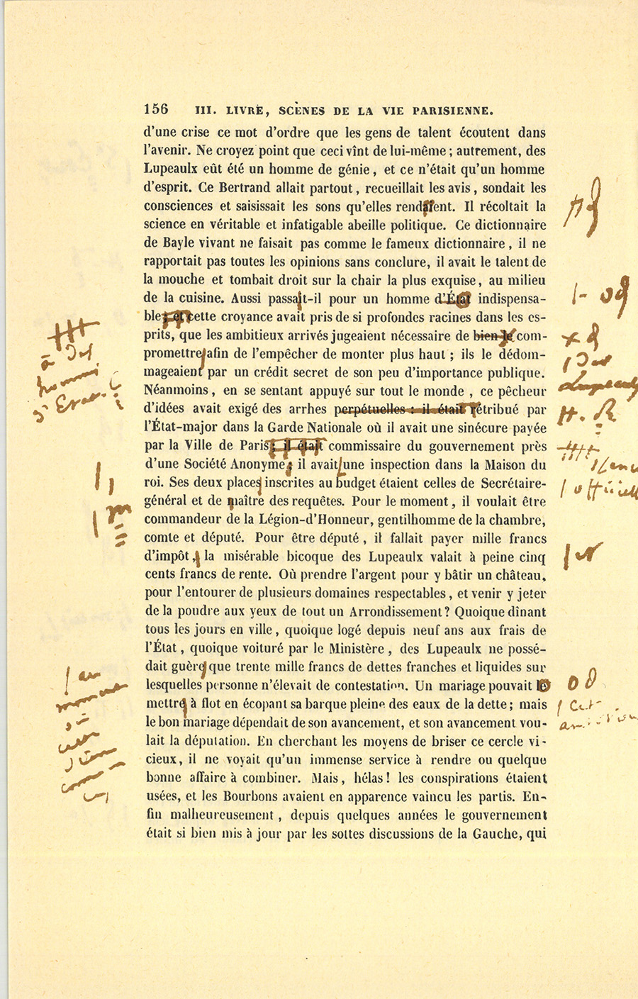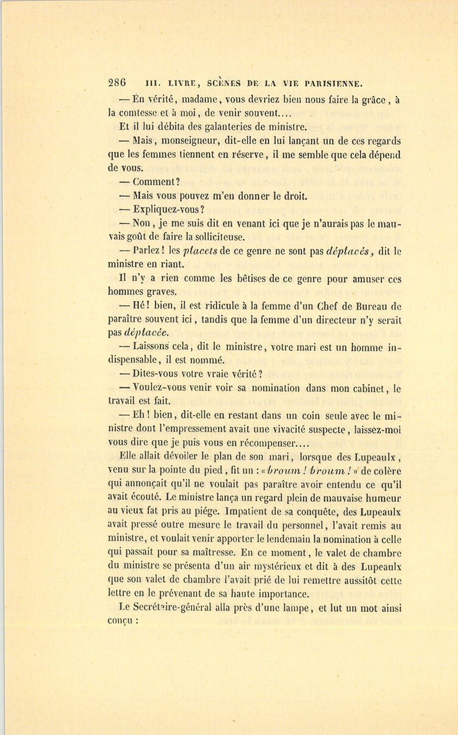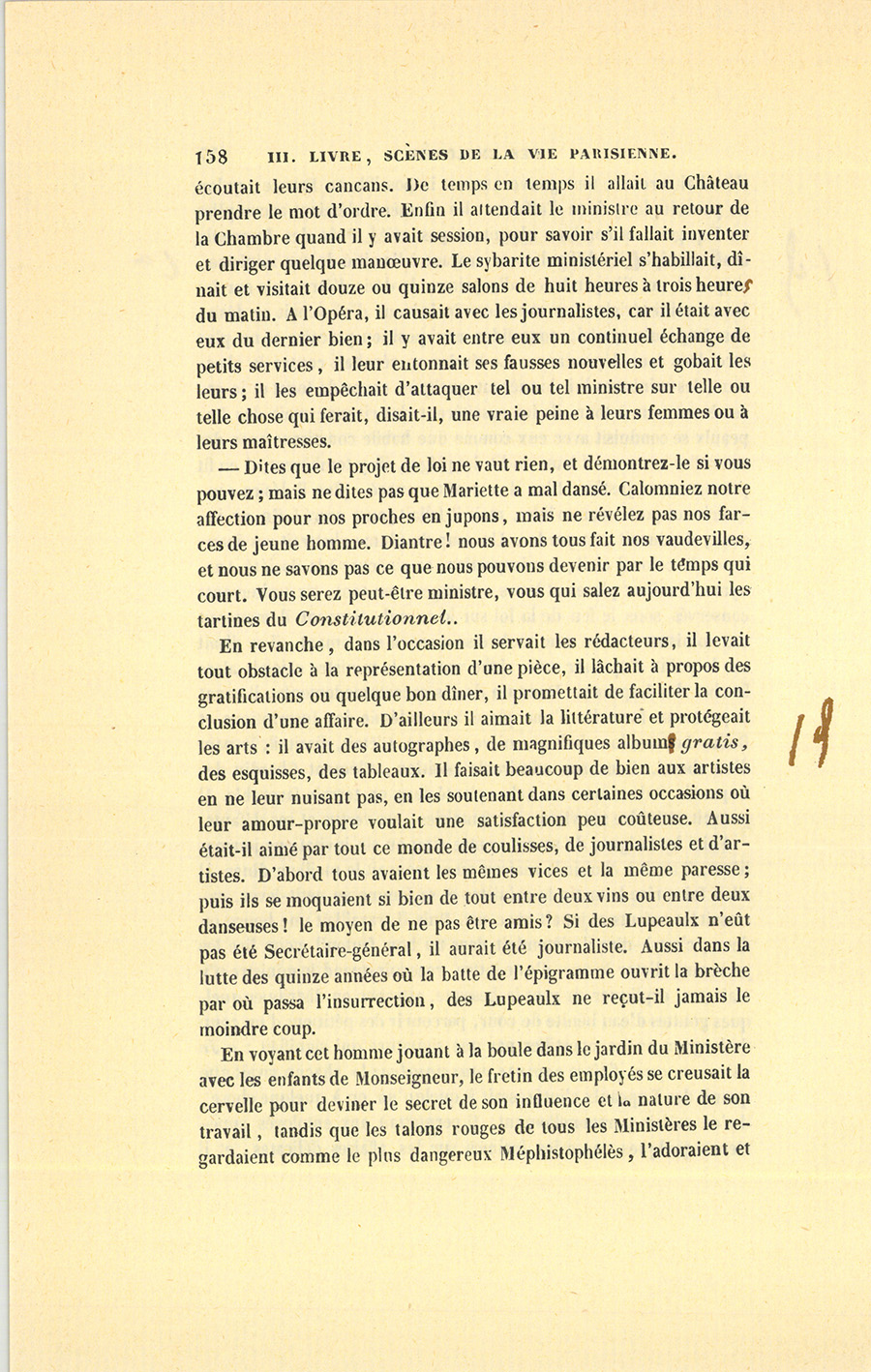 Voici les fatigues de sa vie : entre cinq ou six invitations journalières, il avait à choisir la maison où se trouvait le meilleur dîner. Il allait faire rire le matin le ministre et sa femme au petit-lever, caressait les enfants et jouait avec eux. Puis il travaillait une heure ou deux, c’est-à-dire il s’étendait dans un bon fauteuil pour lire les journaux, dicter le sens d’une lettre, recevoir quand le ministre n’y était pas, expliquer en gros la besogne, attraper ou distribuer quelques gouttes d’eau bénite de cour, parcourir des pétitions d’un coup de lorgnon ou les apostiller par une signature qui signifiait : « Je m’en moque, faites comme vous voudrez ! » chacun savait que quand des Lupeaulx s’intéressait à quelqu’un ou à quelque chose, il s’en mêlait personnellement. Il permettait aux employés supérieurs quelques causeries intimes sur les affaires délicates, et il {p. 158} écoutait leurs cancans. De temps en temps il allait au Château prendre le mot d’ordre. Enfin il attendait le ministre au retour de la Chambre quand il y avait session, pour savoir s’il fallait inventer et diriger quelque manœuvre. Le sybarite ministériel s’habillait, dînait et visitait douze ou quinze salons de huit heures à trois heures du matin. À l’Opéra, il causait avec les journalistes, car il était avec eux du dernier bien ; il y avait entre eux un continuel échange de petits services, il leur entonnait ses fausses nouvelles et gobait les leurs ; il les empêchait d’attaquer tel ou tel ministre sur telle ou telle chose qui ferait, disait-il, une vraie peine à leurs femmes ou à leurs maîtresses.