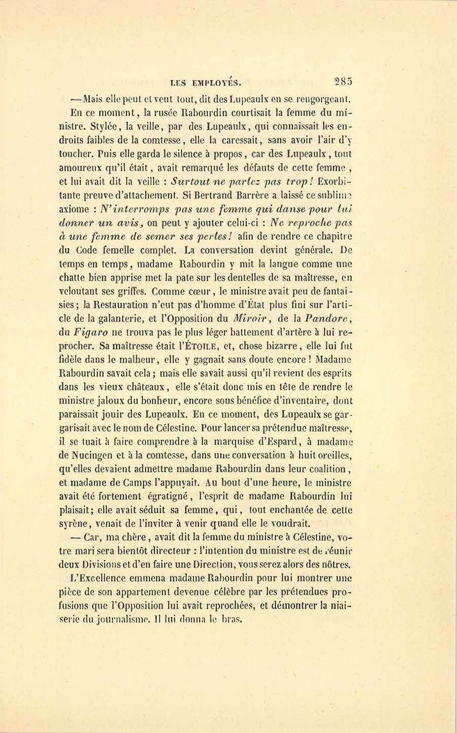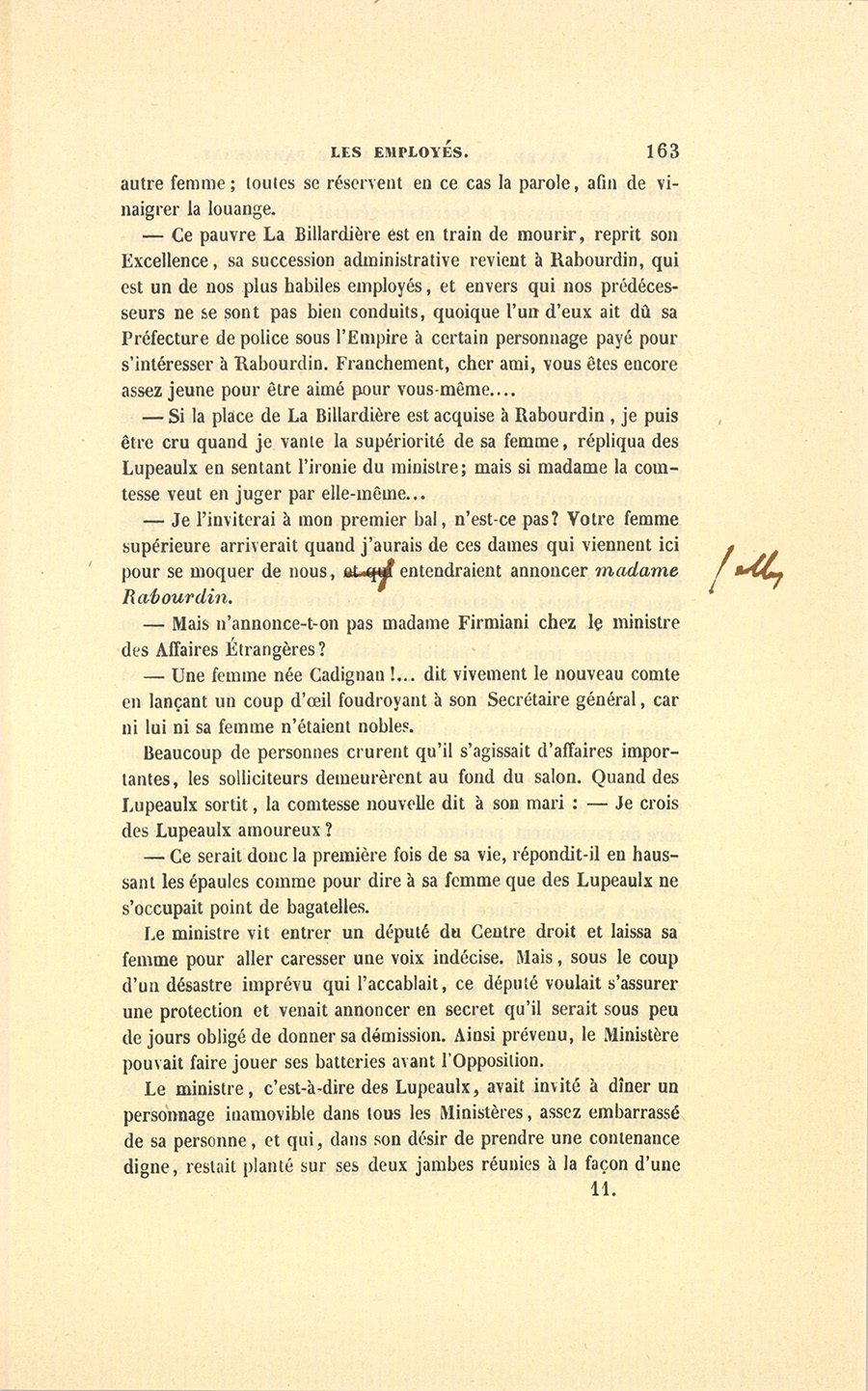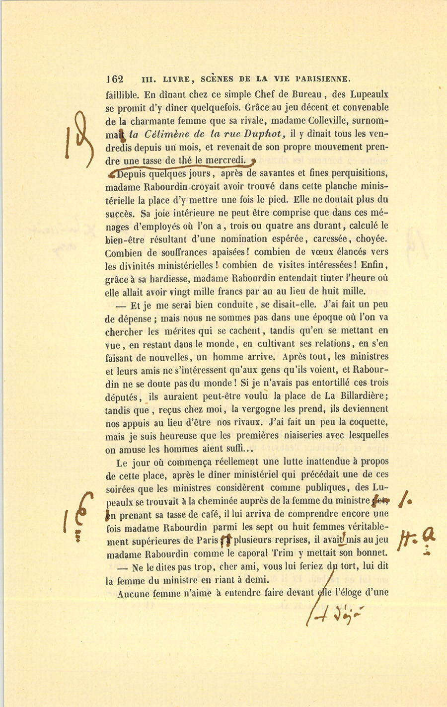 À onze heures, au moment où tout était calme à la Place-Royale, monsieur des Lupeaulx quittait l’Opéra pour venir rue Duphot. Ce mercredi fut un des plus brillants de madame Rabourdin. Plusieurs de ses habitués revinrent du théâtre et augmentèrent les groupes formés dans ses salons et où se remarquaient plusieurs célébrités : Canalis le poète, le peintre Schinner, le docteur Bianchon, Lucien de Rubempré, Octave de Camps, le comte de Granville, le vicomte de Fontaine, du Bruel le vaudevilliste, Andoche Finot le journaliste, Derville, une des plus fortes têtes du palais, le comte4 du Châtelet, député, du Tillet le banquier, des jeunes gens élégants comme Paul de Manerville et le jeune vicomte de Portenduère. Célestine servait le thé quand le Secrétaire-général entra. Sa toilette lui allait bien ce soir-là : elle avait une robe de velours noir sans ornement, une écharpe de gaze noire, les cheveux bien lissés, relevés par une natte ronde, et de chaque côté les boucles tombant à l’anglaise. Ce qui distinguait cette femme, était le laissez-aller italien de l’artiste, {p. 178} une facile compréhension de toute chose, et la grâce avec laquelle elle souhaitait la bienvenue au moindre désir de ses amis. La nature lui avait donné une taille svelte pour se retourner lestement au premier mot d’interrogation, des yeux noirs fendus à l’orientale et inclinés comme ceux des Chinoises pour voir de côté ; elle savait ménager sa voix insinuante et douce de manière à répandre un charme caressant sur toute parole, même celle jetée au hasard ; elle avait de ces pieds que l’on ne voit que dans les portraits où les peintres mentent à leur aise en chaussant leur modèle, seule flatterie qui ne compromette pas l’Anatomie. Son teint, un peu jaune au jour comme est celui des brunes, jetait un vif éclat aux lumières qui faisaient briller ses cheveux et ses yeux noirs. Enfin ses formes minces et découpées rappelaient à l’artiste celles de la Vénus du Moyen-Âge trouvée par Jean Goujon, l’illustre statuaire de Diane de Poitiers.