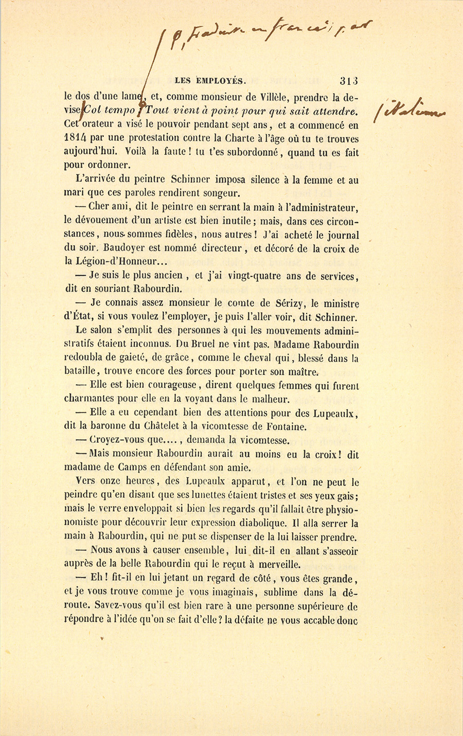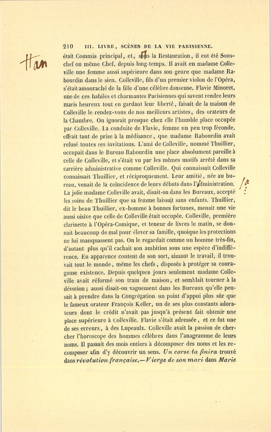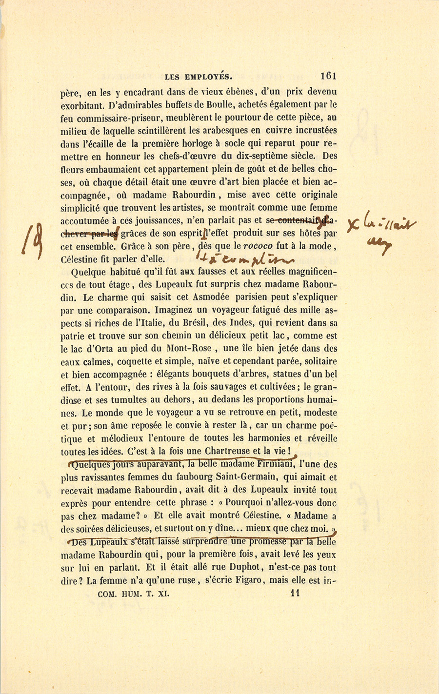 À onze heures, au moment où tout était calme à la Place-Royale, monsieur des Lupeaulx quittait l’Opéra pour venir rue Duphot. Ce mercredi fut un des plus brillants de madame Rabourdin. Plusieurs de ses habitués revinrent du théâtre et augmentèrent les groupes formés dans ses salons et où se remarquaient plusieurs célébrités : Canalis le poète, le peintre Schinner, le docteur Bianchon, Lucien de Rubempré, Octave de Camps, le comte de Granville, le vicomte de Fontaine, du Bruel le vaudevilliste, Andoche Finot le journaliste, Derville, une des plus fortes têtes du palais, le comte4 du Châtelet, député, du Tillet le banquier, des jeunes gens élégants comme Paul de Manerville et le jeune vicomte de Portenduère. Célestine servait le thé quand le Secrétaire-général entra. Sa toilette lui allait bien ce soir-là : elle avait une robe de velours noir sans ornement, une écharpe de gaze noire, les cheveux bien lissés, relevés par une natte ronde, et de chaque côté les boucles tombant à l’anglaise. Ce qui distinguait cette femme, était le laissez-aller italien de l’artiste, {p. 178} une facile compréhension de toute chose, et la grâce avec laquelle elle souhaitait la bienvenue au moindre désir de ses amis. La nature lui avait donné une taille svelte pour se retourner lestement au premier mot d’interrogation, des yeux noirs fendus à l’orientale et inclinés comme ceux des Chinoises pour voir de côté ; elle savait ménager sa voix insinuante et douce de manière à répandre un charme caressant sur toute parole, même celle jetée au hasard ; elle avait de ces pieds que l’on ne voit que dans les portraits où les peintres mentent à leur aise en chaussant leur modèle, seule flatterie qui ne compromette pas l’Anatomie. Son teint, un peu jaune au jour comme est celui des brunes, jetait un vif éclat aux lumières qui faisaient briller ses cheveux et ses yeux noirs. Enfin ses formes minces et découpées rappelaient à l’artiste celles de la Vénus du Moyen-Âge trouvée par Jean Goujon, l’illustre statuaire de Diane de Poitiers.