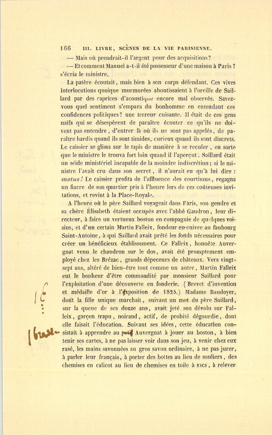 À l’heure où le père Saillard voyageait dans Paris, son gendre et sa chère Élisabeth étaient occupés avec l’abbé Gaudron, leur directeur, à faire un vertueux boston en compagnie de quelques voisins, et d’un certain Martin Falleix, fondeur en cuivre au faubourg Saint-Antoine, à qui Saillard avait prêté les fonds nécessaires pour créer un bénéficieux établissement. Ce Falleix, honnête Auvergnat venu le chaudron sur le dos, avait été promptement employé chez les Brézac, grands dépeceurs de châteaux. Vers vingt-sept ans, altéré de bien-être tout comme un autre, Martin Falleix eut le bonheur d’être commandité par monsieur Saillard pour l’exploitation d’une découverte en fonderie. (Brevet d’invention et médaille d’or à l’Exposition de 1825.) Madame Baudoyer, dont la fille unique marchait, suivant un mot du père Saillard, sur la queue de ses douze ans, avait jeté son dévolu sur Falleix, garçon trapu, noiraud, actif, de probité dégourdie, dont elle faisait l’éducation. Suivant ses idées, cette éducation consistait à apprendre au brave Auvergnat à jouer au boston, à bien tenir ses cartes, à ne pas laisser voir dans son jeu, à venir chez eux rasé, les mains savonnées au gros savon ordinaire, à ne pas jurer, à parler leur français, à porter des bottes au lieu de souliers, des chemises en calicot au lieu de chemises en toile à sacs, à relever {p. 167} ses cheveux au lieu de les tenir plats. Depuis huit jours, Élisabeth avait décidé Falleix à ôter de ses oreilles deux énormes anneaux plats, qui ressemblaient à des cerceaux.