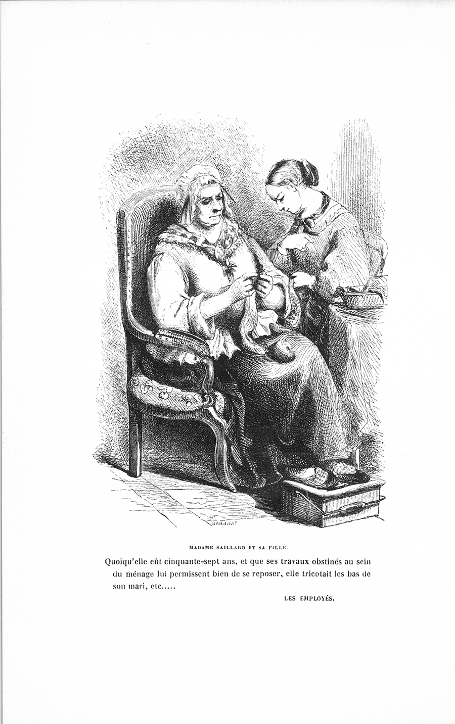 Au milieu de toutes ces reliques, madame Saillard habitait une bergère d’acajou moderne, les pieds sur une chaufferette brûlée à chaque trou, près d’une cheminée pleine de cendres et sans feu, sur laquelle se voyaient un cartel, des bronzes antiques, des candélabres à fleurs, mais sans bougies, car elle s’éclairait avec un martinet en cuivre d’où s’élevait une haute chandelle cannelée par différents coulages. Madame Saillard montrait un visage où, malgré ses rides, se peignaient l’entêtement et la sévérité, l’étroitesse de ses idées, une probité quadrangulaire, une religion sans pitié, une avarice naïve et la paix d’une conscience nette. Dans certains tableaux flamands, vous voyez des femmes de bourgmestres ainsi composées par la nature et bien reproduites par le pinceau ; mais elles ont de belles robes en velours ou d’étoffes précieuses, tandis que madame Saillard n’avait pas de robes, mais ce vêtement antique nommé, dans la Touraine et dans la Picardie, des cottes, ou plus généralement en France, des cotillons, espèce de jupes plissées derrière et sur les côtés, mises les unes sur les autres. Son corsage était serré dans un casaquin, autre mode d’un autre âge ! Elle conservait le bonnet à papillon et les souliers à talons hauts. Quoiqu’elle eût cinquante-sept ans et que ses travaux obstinés au sein du ménage lui permissent bien de se reposer, elle tricotait les bas de son mari, les siens et ceux d’un oncle, comme tricotent les femmes de la campagne, en marchant, en parlant, en se promenant dans le jardin, en allant voir ce qui se passait à sa cuisine. [ill.]