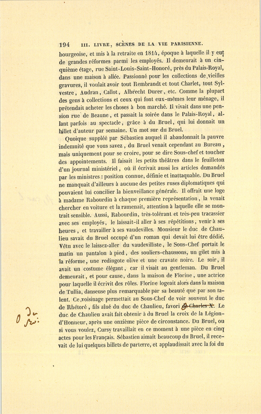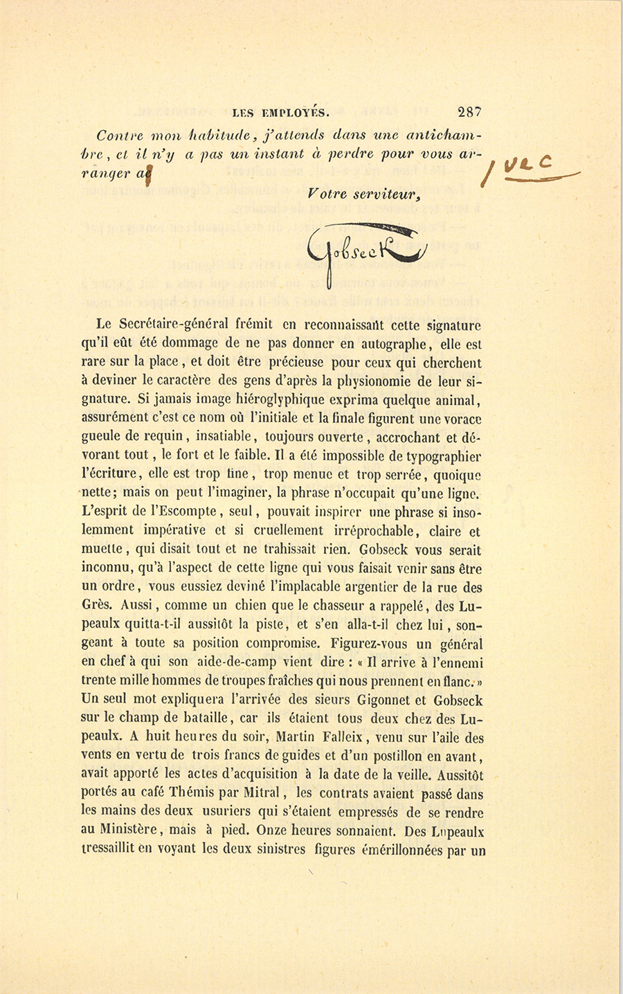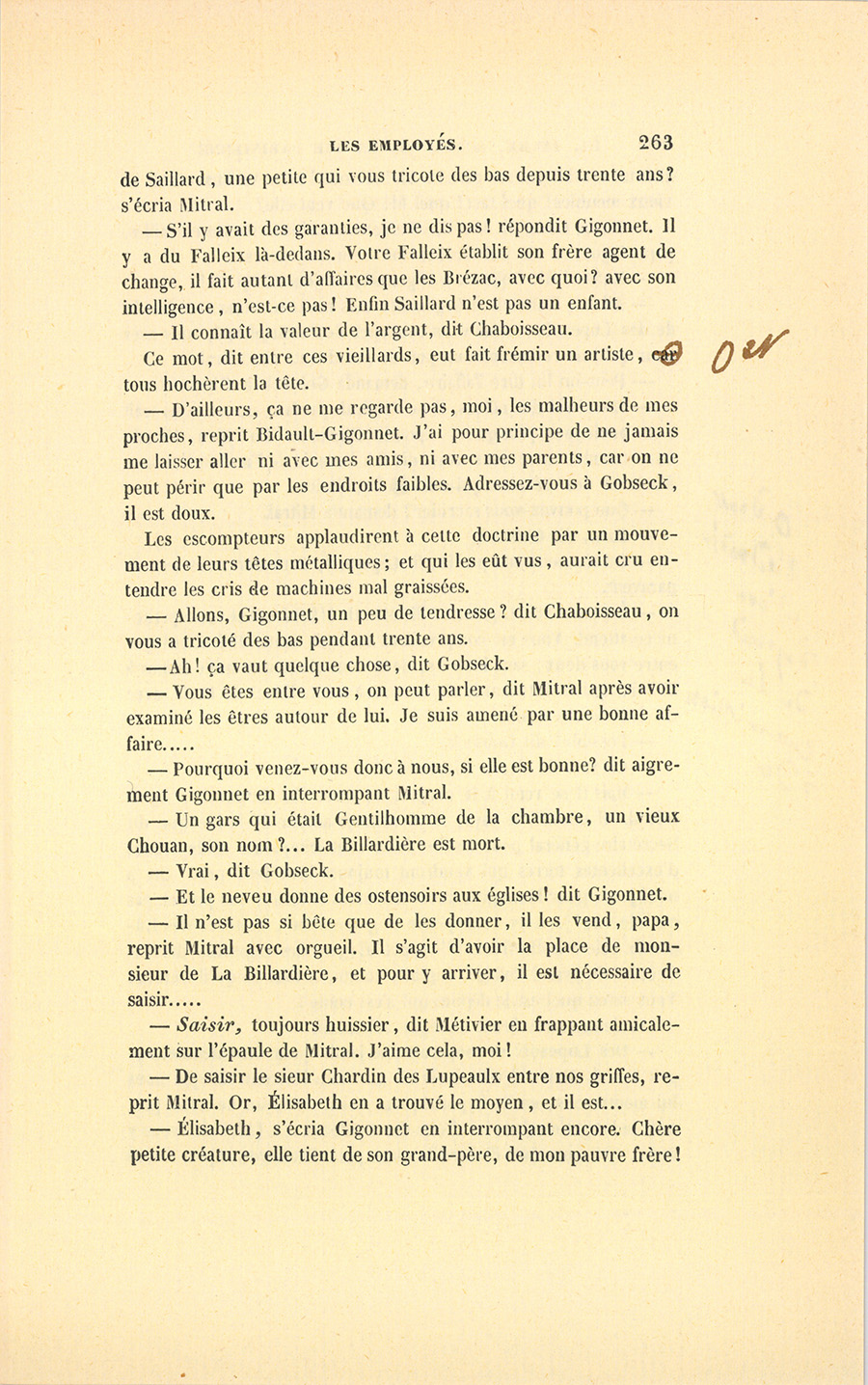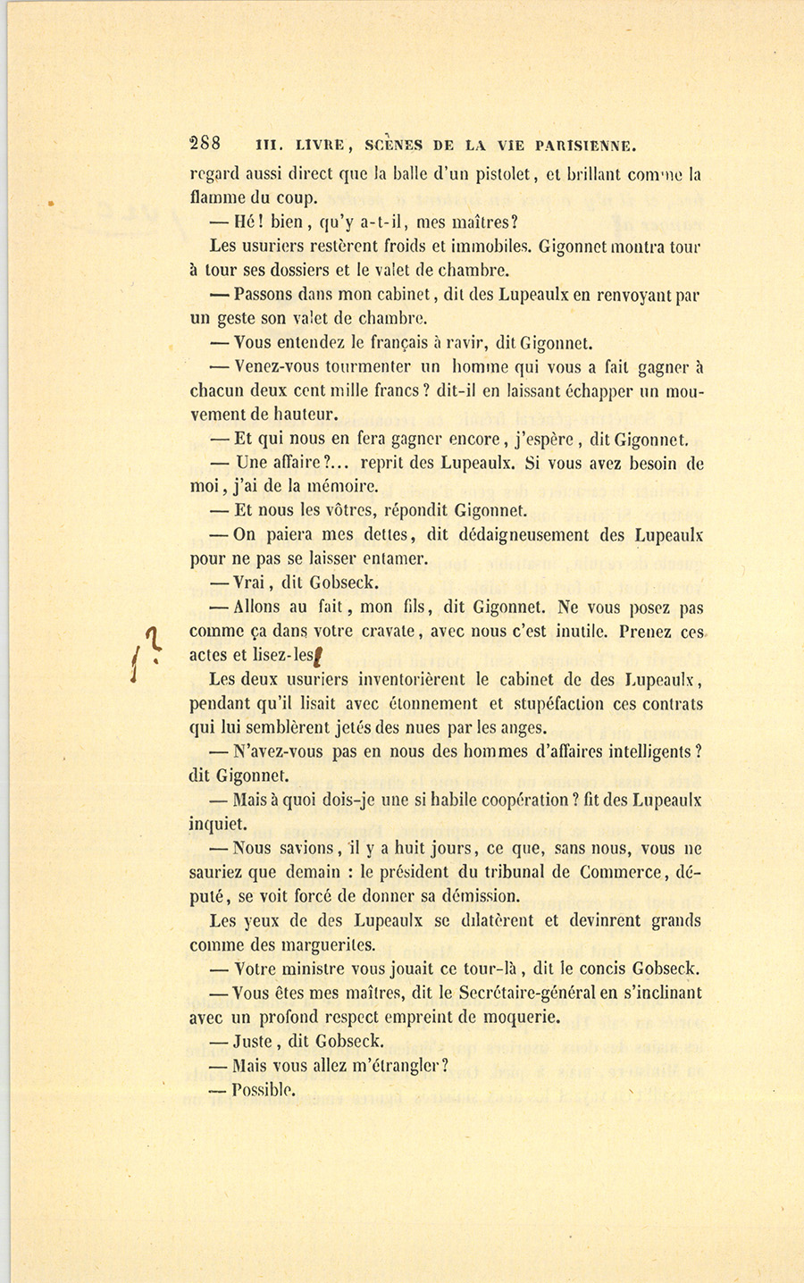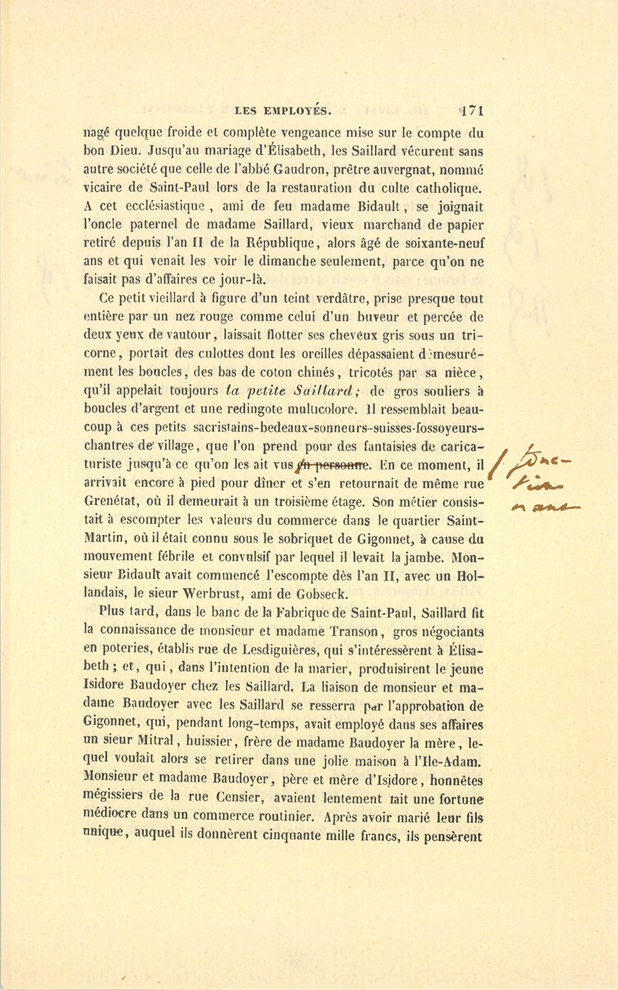 Ce petit vieillard à figure d’un teint verdâtre, prise presque tout entière par un nez rouge comme celui d’un buveur et percée de deux yeux de vautour, laissait flotter ses cheveux gris sous un tricorne, portait des culottes dont les oreilles dépassaient démesurément les boucles, des bas de coton chinés, tricotés par sa nièce, qu’il appelait toujours la petite Saillard ; de gros souliers à boucles d’argent et une redingote multicolore. Il ressemblait beaucoup à ces petits sacristains-bedeaux-sonneurs-suisses-fossoyeurs-chantres de village, que l’on prend pour des fantaisies de caricaturiste jusqu’à ce qu’on les ait vus fonctionnant. [ill.] En ce moment, il arrivait encore à pied pour dîner et s’en retournait de même rue Greneta3, où il demeurait à un troisième étage. Son métier consistait à escompter les valeurs du commerce dans le quartier Saint-Martin, où il était connu sous le sobriquet de Gigonnet, à cause du mouvement fébrile et convulsif par lequel il levait la jambe. Monsieur Bidault avait commencé l’escompte dès l’an II, avec un Hollandais, le sieur Werbrust, ami de Gobseck.