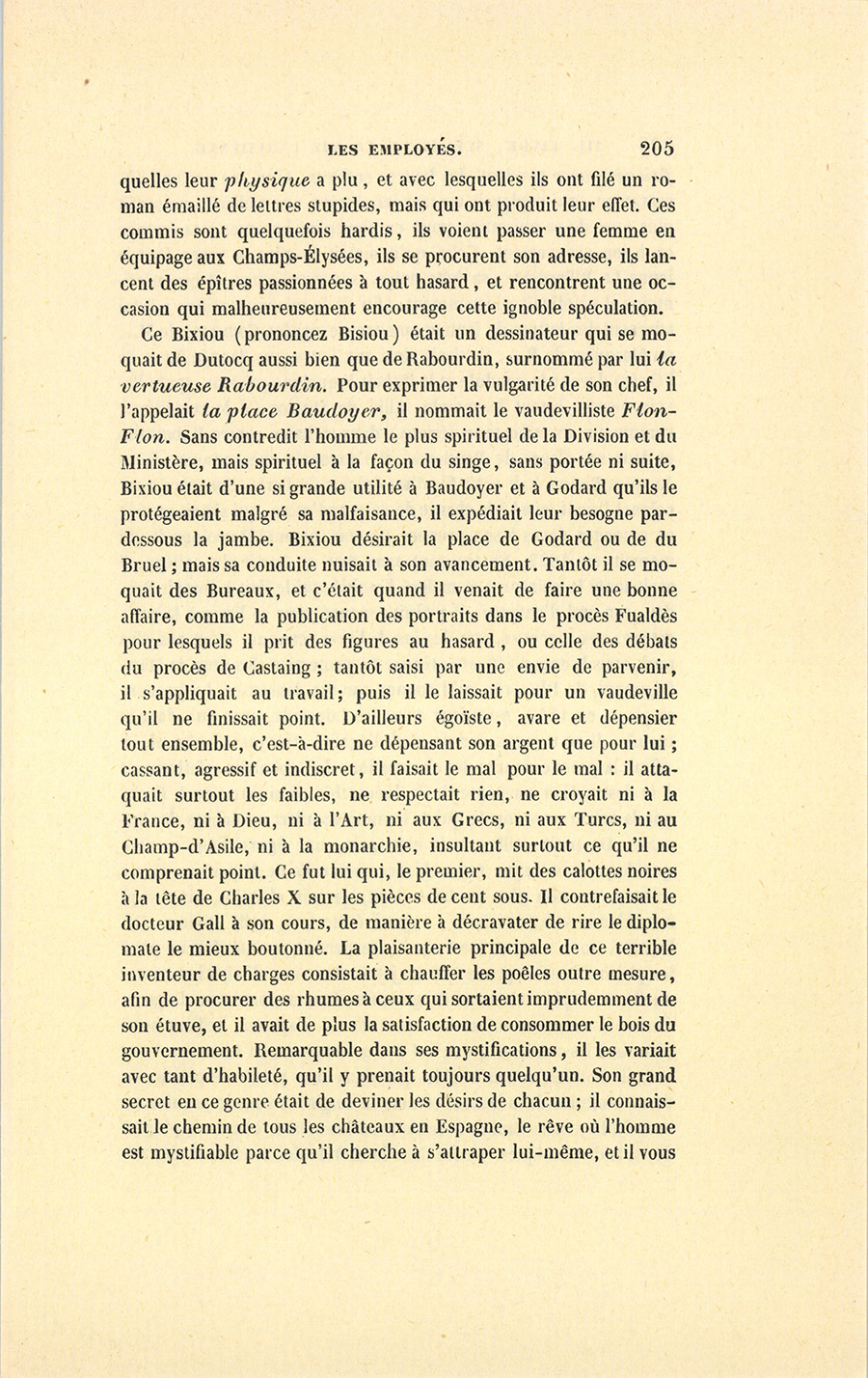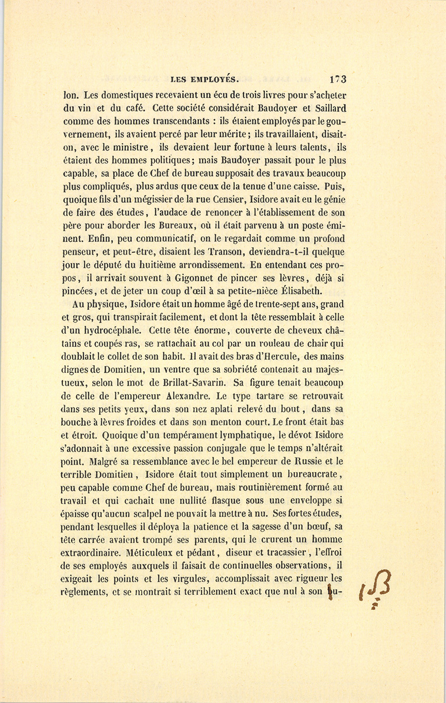 Au physique, Isidore était un homme âgé de trente-sept ans, grand et gros, qui transpirait facilement, et dont la tête ressemblait à celle d’un hydrocéphale. Cette tête énorme, couverte de cheveux châtains et coupés ras, se rattachait au col par un rouleau de chair qui doublait le collet de son habit. Il avait des bras d’Hercule, des mains dignes de Domitien, un ventre que sa sobriété contenait au majestueux, selon le mot de Brillat-Savarin. Sa figure tenait beaucoup de celle de l’empereur Alexandre. Le type tartare se retrouvait dans ses petits yeux, dans son nez aplati relevé du bout, dans sa bouche à lèvres froides et dans son menton court. Le front était bas et étroit. Quoique d’un tempérament lymphatique, le dévot Isidore s’adonnait à une excessive passion conjugale que le temps n’altérait point. Malgré sa ressemblance avec le bel empereur de Russie et le terrible Domitien, Isidore était tout simplement un bureaucrate, peu capable comme Chef de bureau, mais routinièrement formé au travail et qui cachait une nullité flasque sous une enveloppe si épaisse qu’aucun scalpel ne pouvait la mettre à nu. Ses fortes études, pendant lesquelles il déploya la patience et la sagesse d’un bœuf, sa tête carrée avaient trompé ses parents, qui le crurent un homme extraordinaire. Méticuleux et pédant, diseur et tracassier, l’effroi de ses employés auxquels il faisait de continuelles observations, il exigeait les points et les virgules, accomplissait avec rigueur les règlements, et se montrait si terriblement exact que nul à son {p. 174} Bureau ne manquait à s’y trouver avant lui. Baudoyer portait un habit bleu barbeau à boutons jaunes, un gilet chamois, un pantalon gris et une cravatte de couleur. Il avait de larges pieds mal chaussés. La chaîne de sa montre était ornée d’un énorme paquet de vieilles breloques parmi lesquelles il conservait en 1824 les graines d’Amérique à la mode en l’an VII.