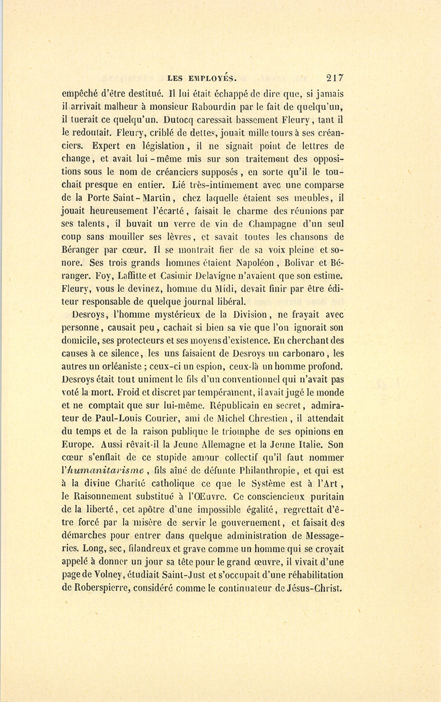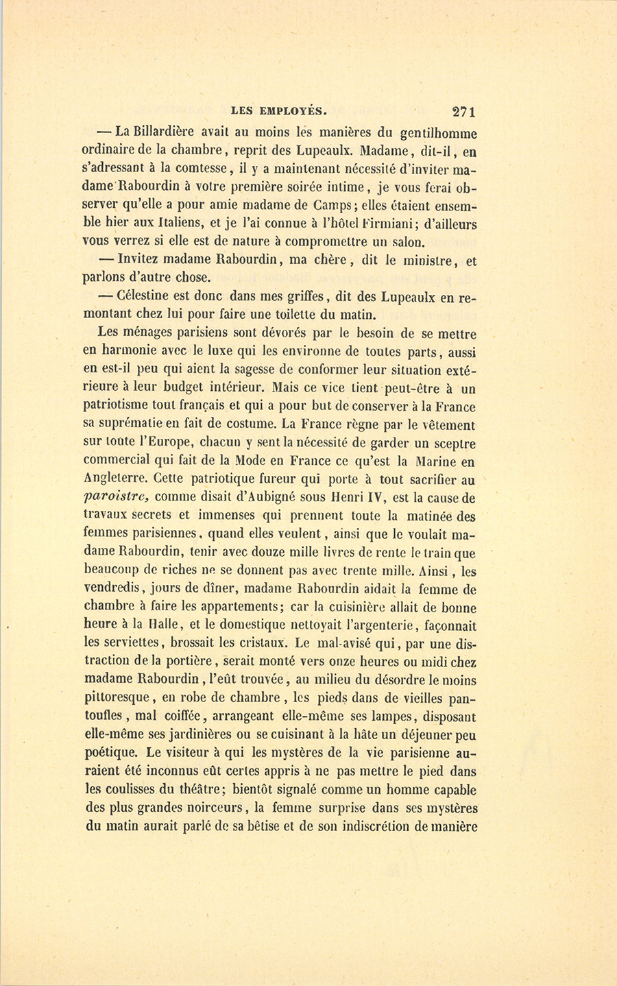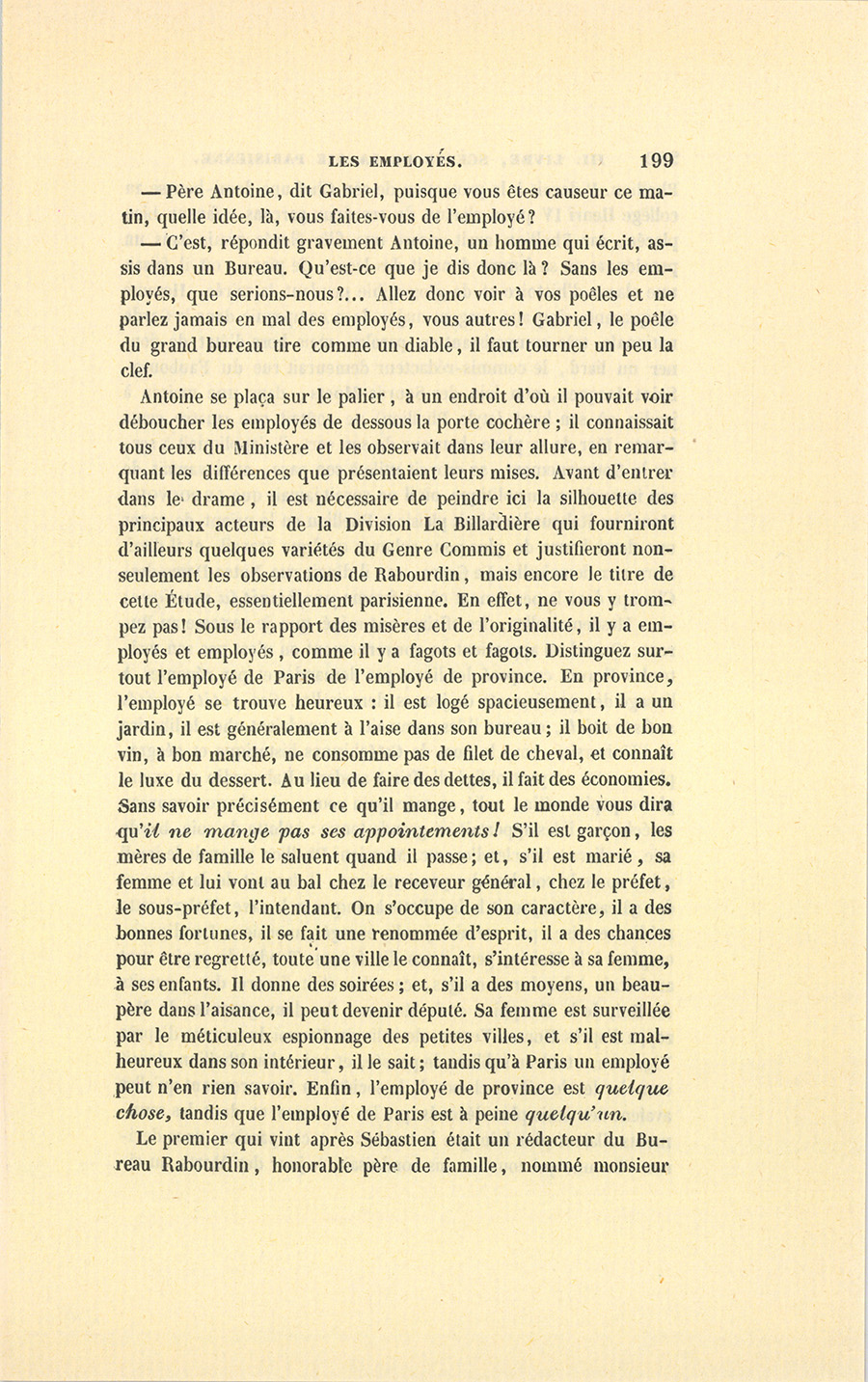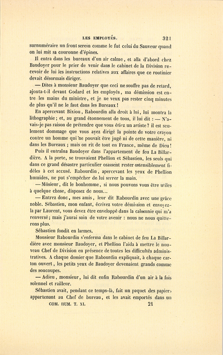 Profondément ému par les misères qu’il avait reconnues dans l’existence des employés, Xavier s’était demandé d’où venait leur croissante déconsidération ; il en avait recherché les {p. 142} causes, et les avait trouvées dans ces petites révolutions partielles qui furent comme le remous de la tempête de 1789 et que les historiens des grands mouvements sociaux négligent d’examiner, quoiqu’en définitif elles ayent fait nos mœurs ce qu’elles sont.