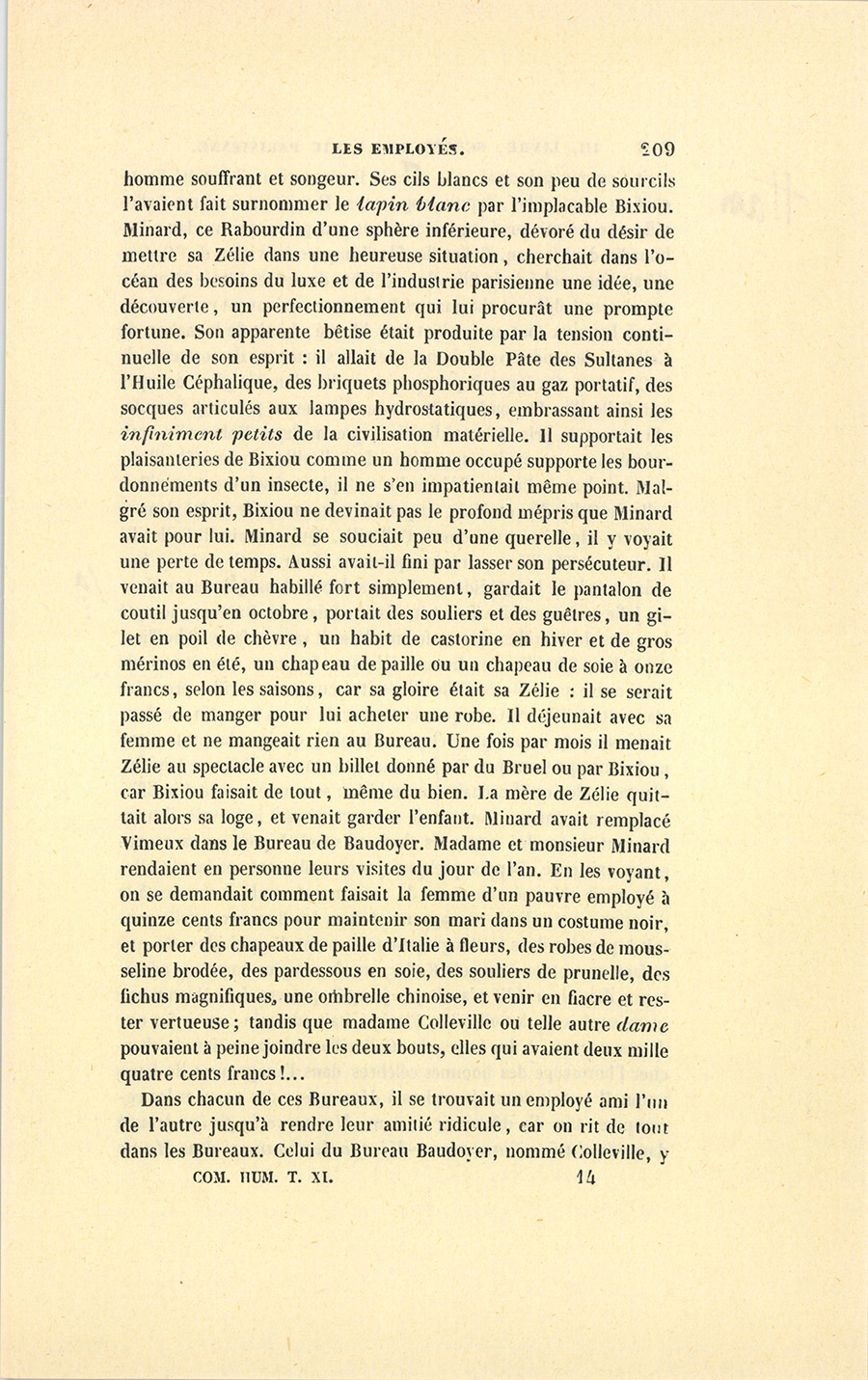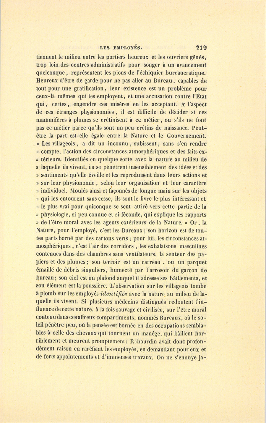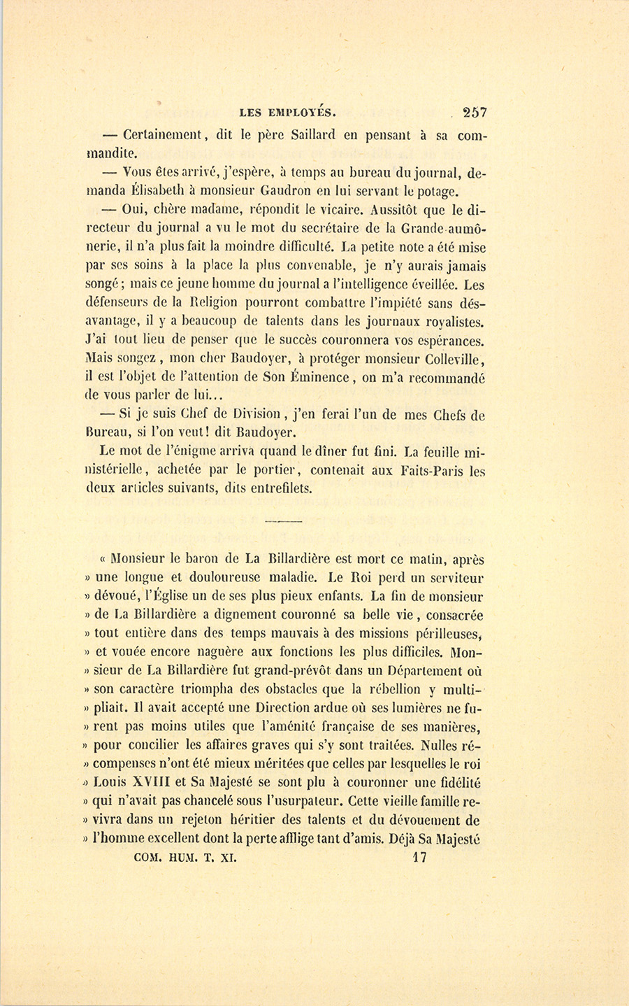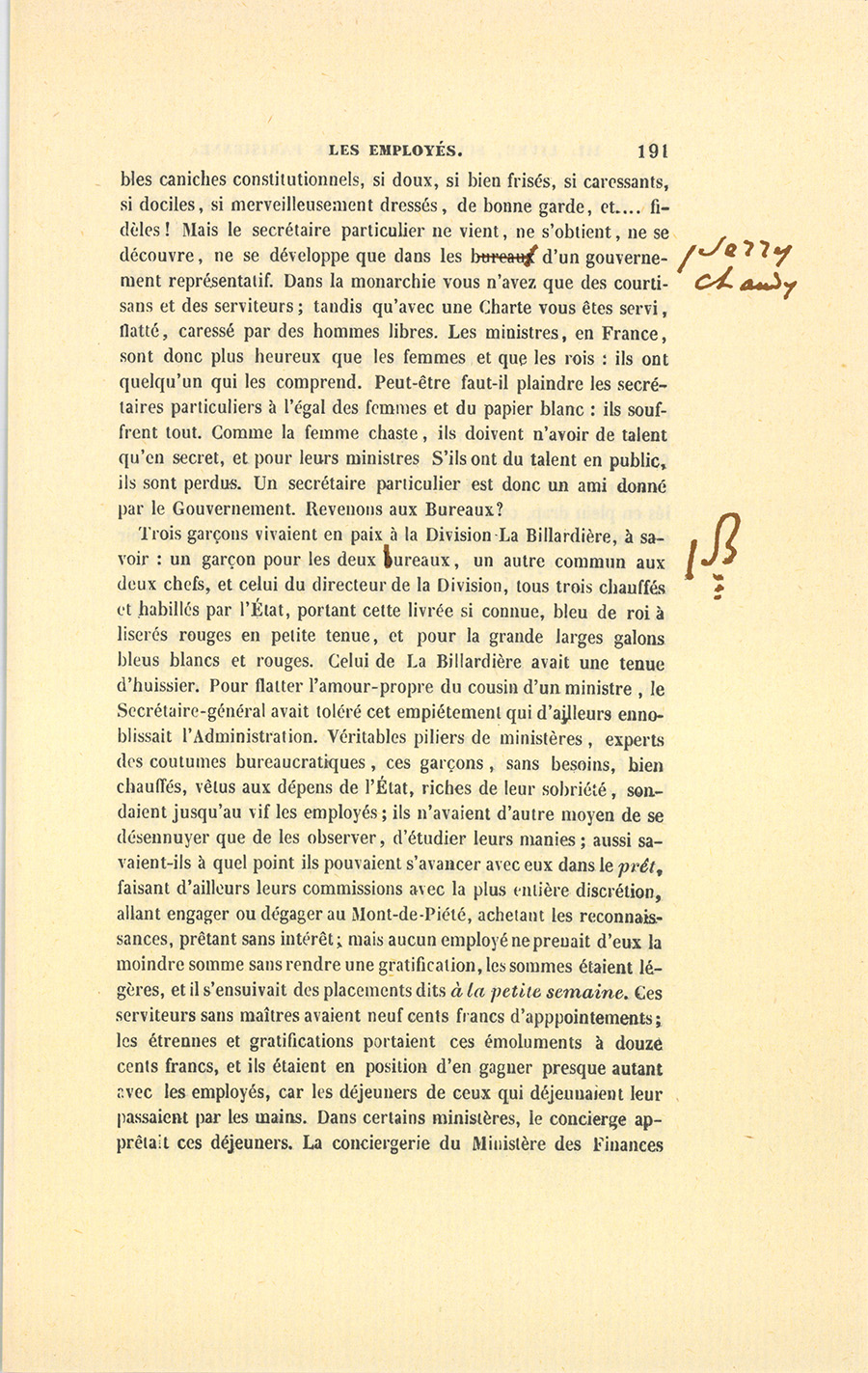 Profondément ému par les misères qu’il avait reconnues dans l’existence des employés, Xavier s’était demandé d’où venait leur croissante déconsidération ; il en avait recherché les {p. 142} causes, et les avait trouvées dans ces petites révolutions partielles qui furent comme le remous de la tempête de 1789 et que les historiens des grands mouvements sociaux négligent d’examiner, quoiqu’en définitif elles ayent fait nos mœurs ce qu’elles sont.