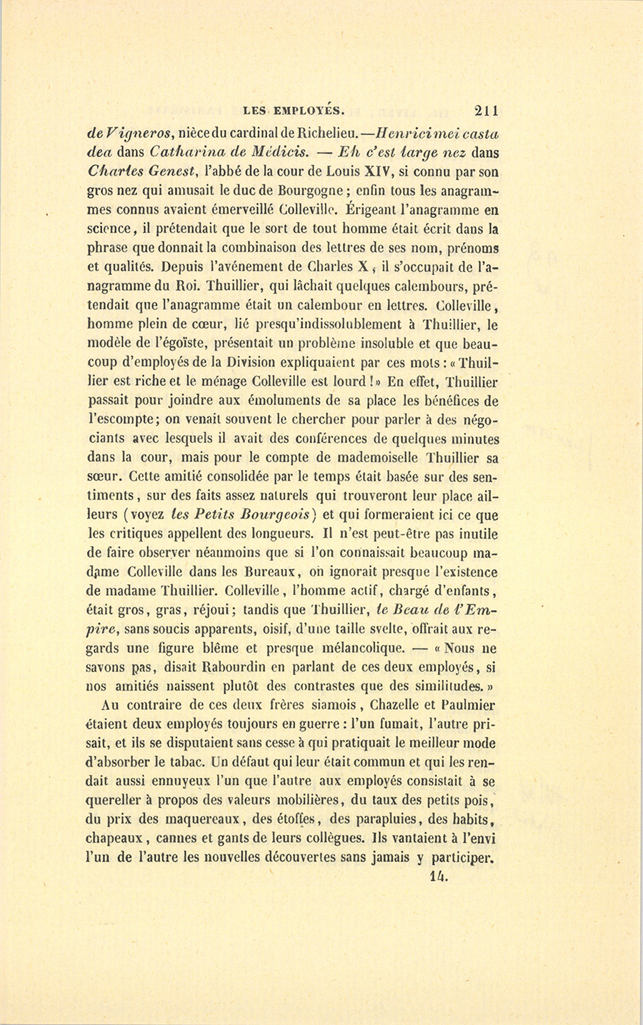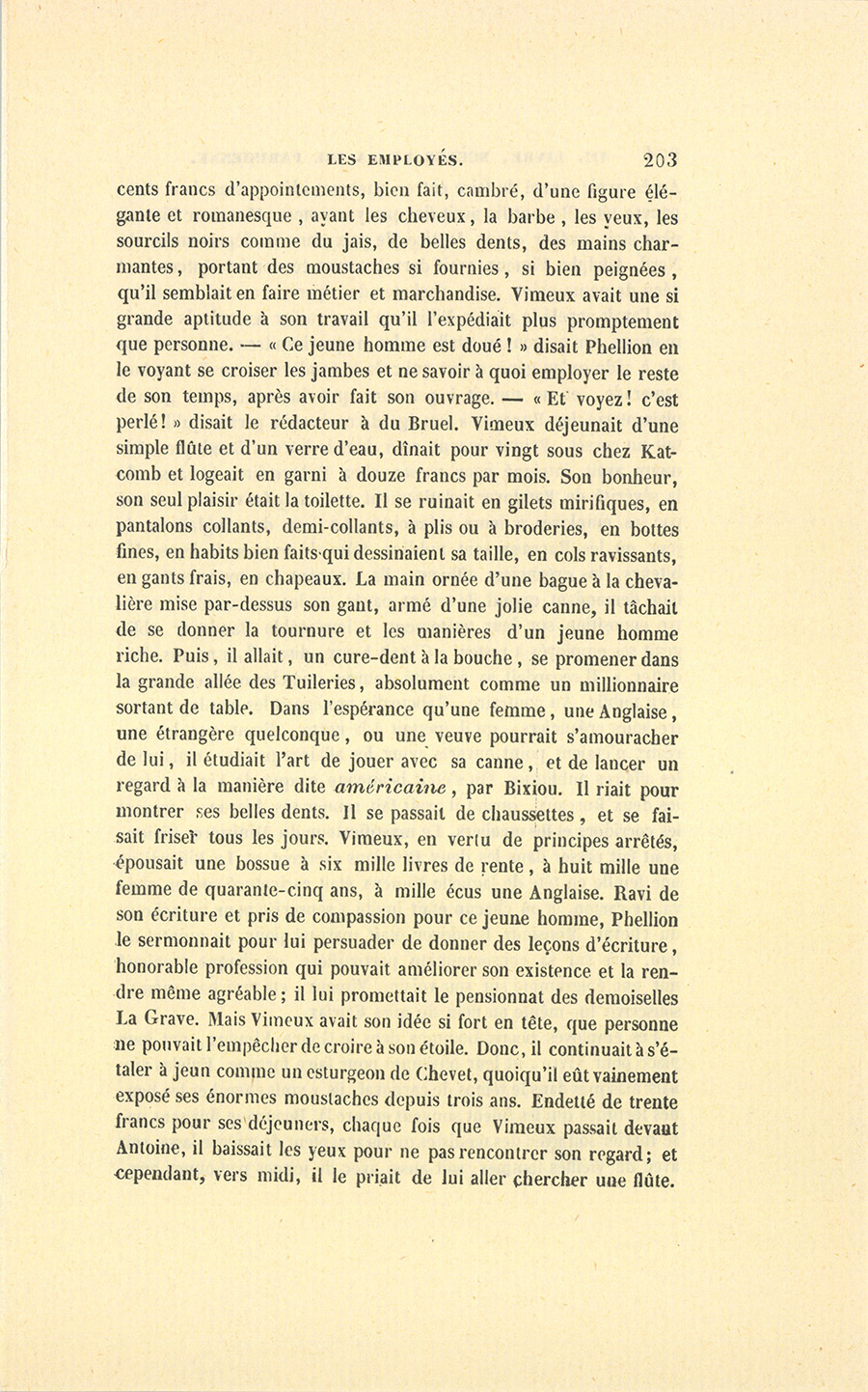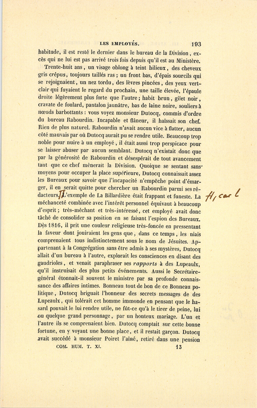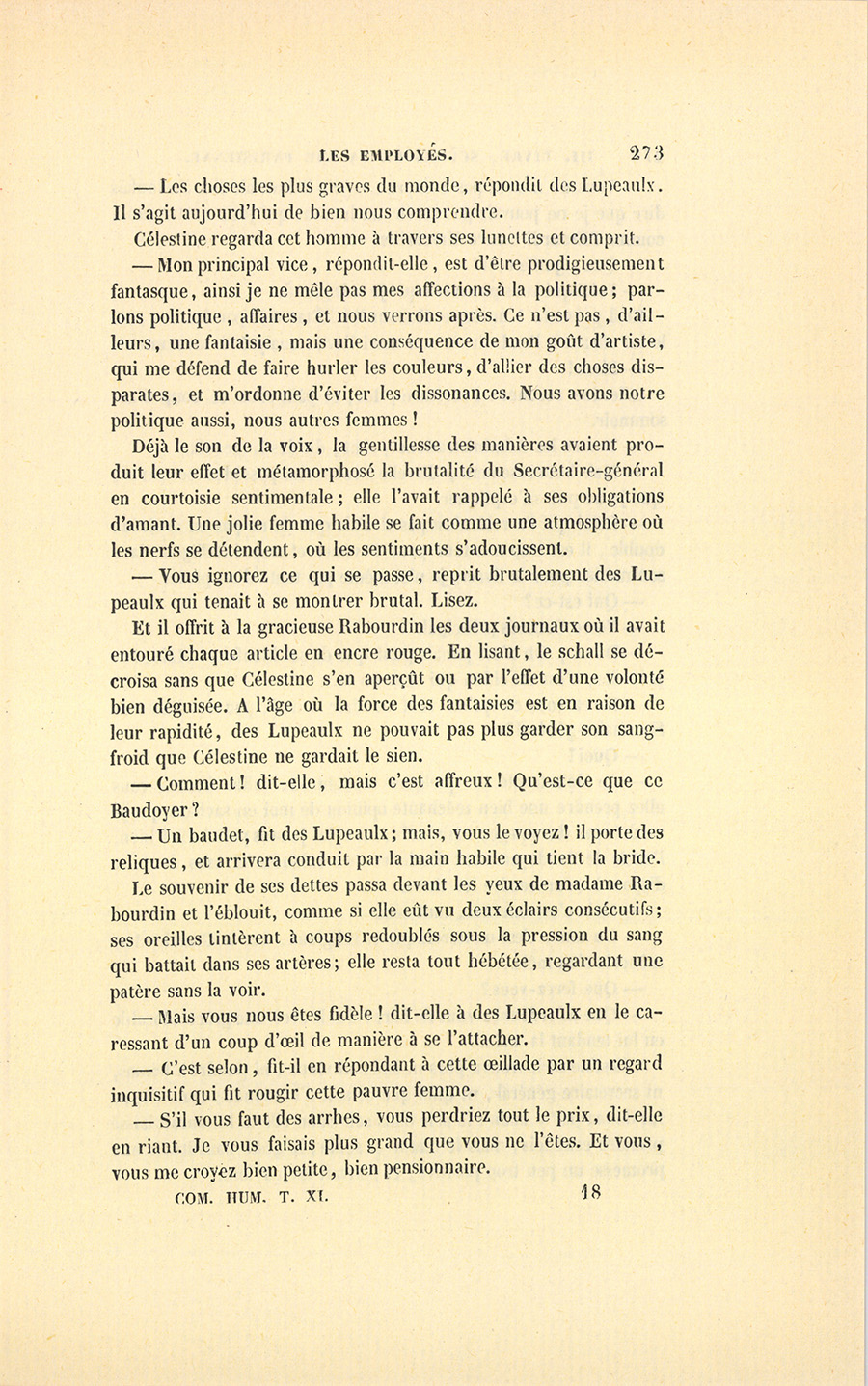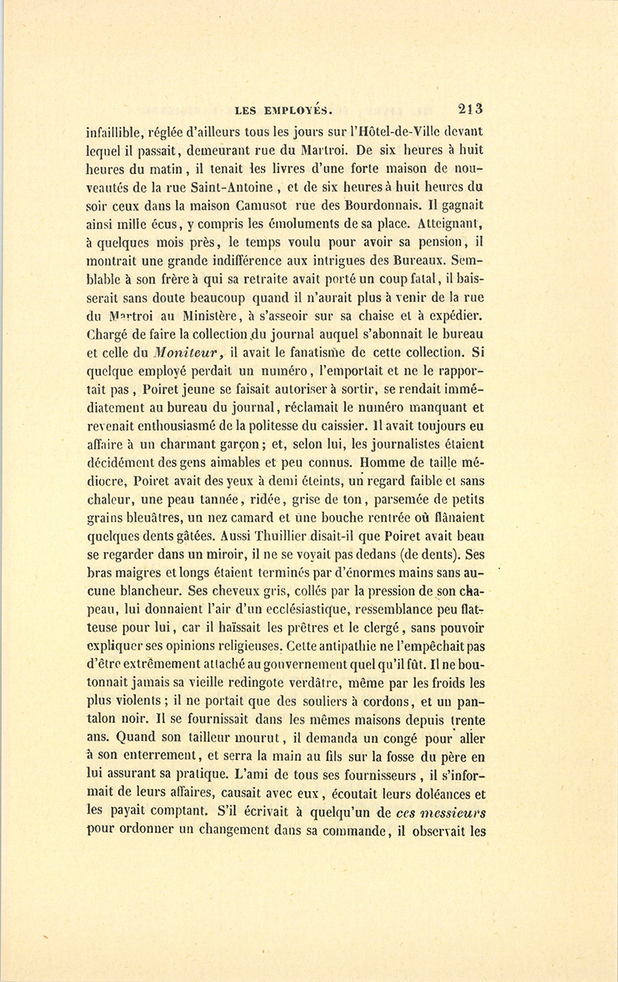 Profondément ému par les misères qu’il avait reconnues dans l’existence des employés, Xavier s’était demandé d’où venait leur croissante déconsidération ; il en avait recherché les {p. 142} causes, et les avait trouvées dans ces petites révolutions partielles qui furent comme le remous de la tempête de 1789 et que les historiens des grands mouvements sociaux négligent d’examiner, quoiqu’en définitif elles ayent fait nos mœurs ce qu’elles sont.