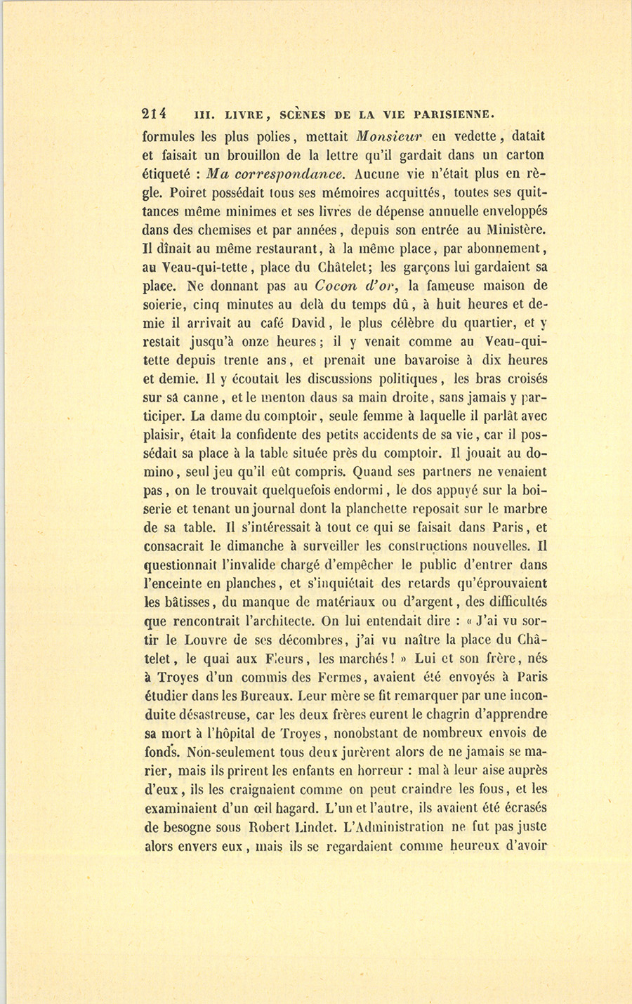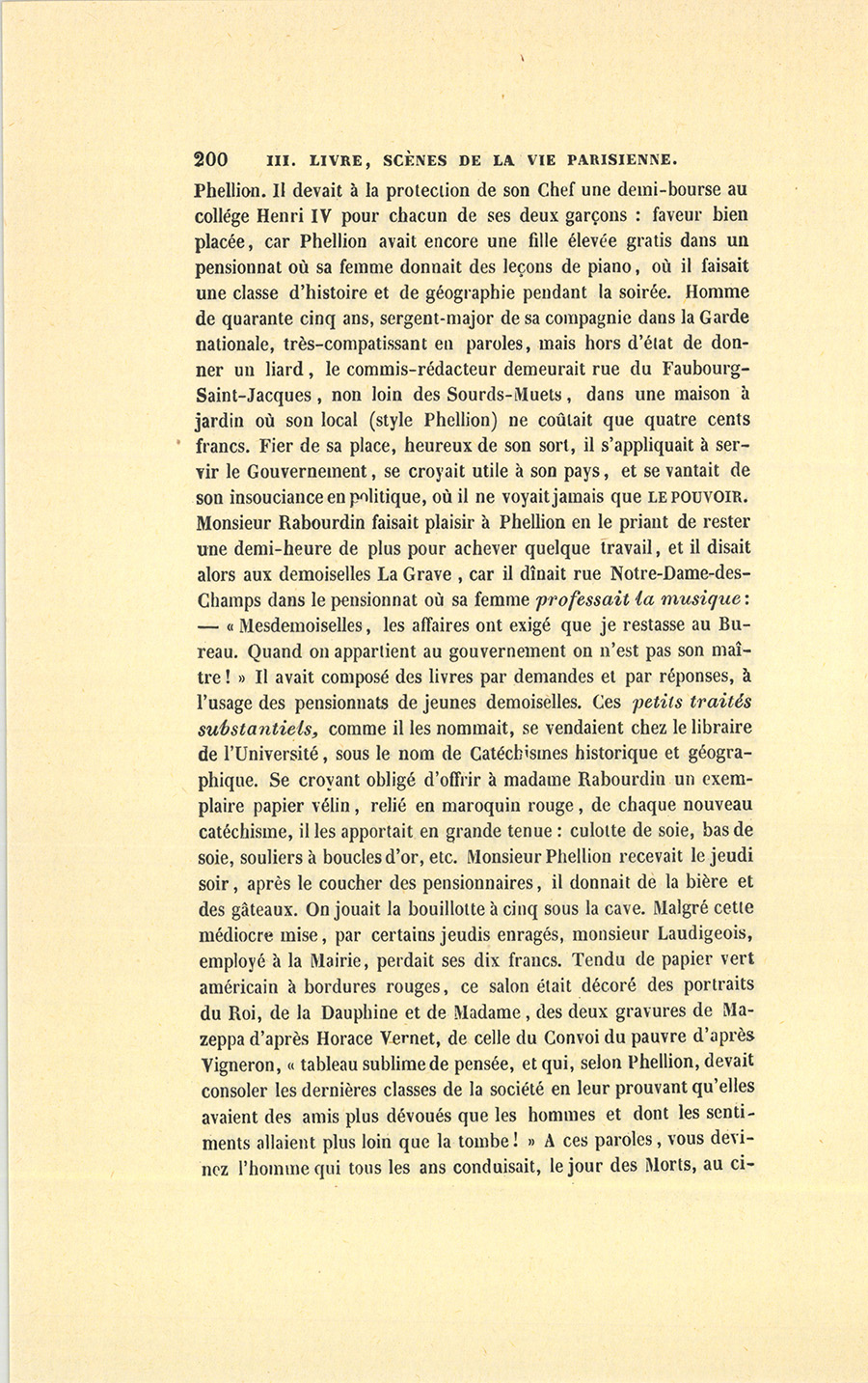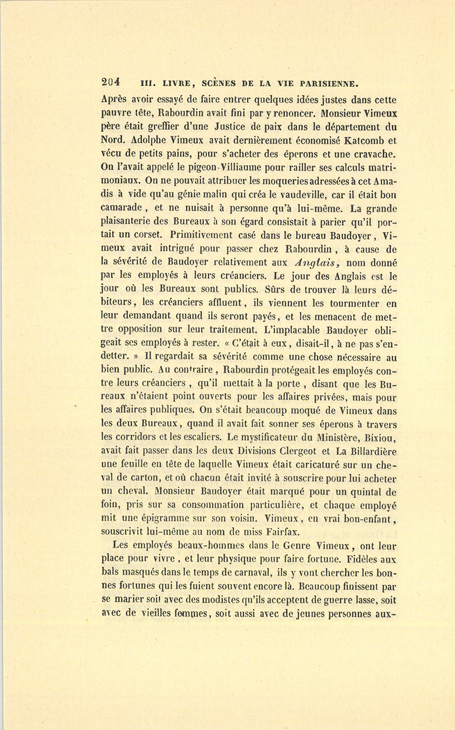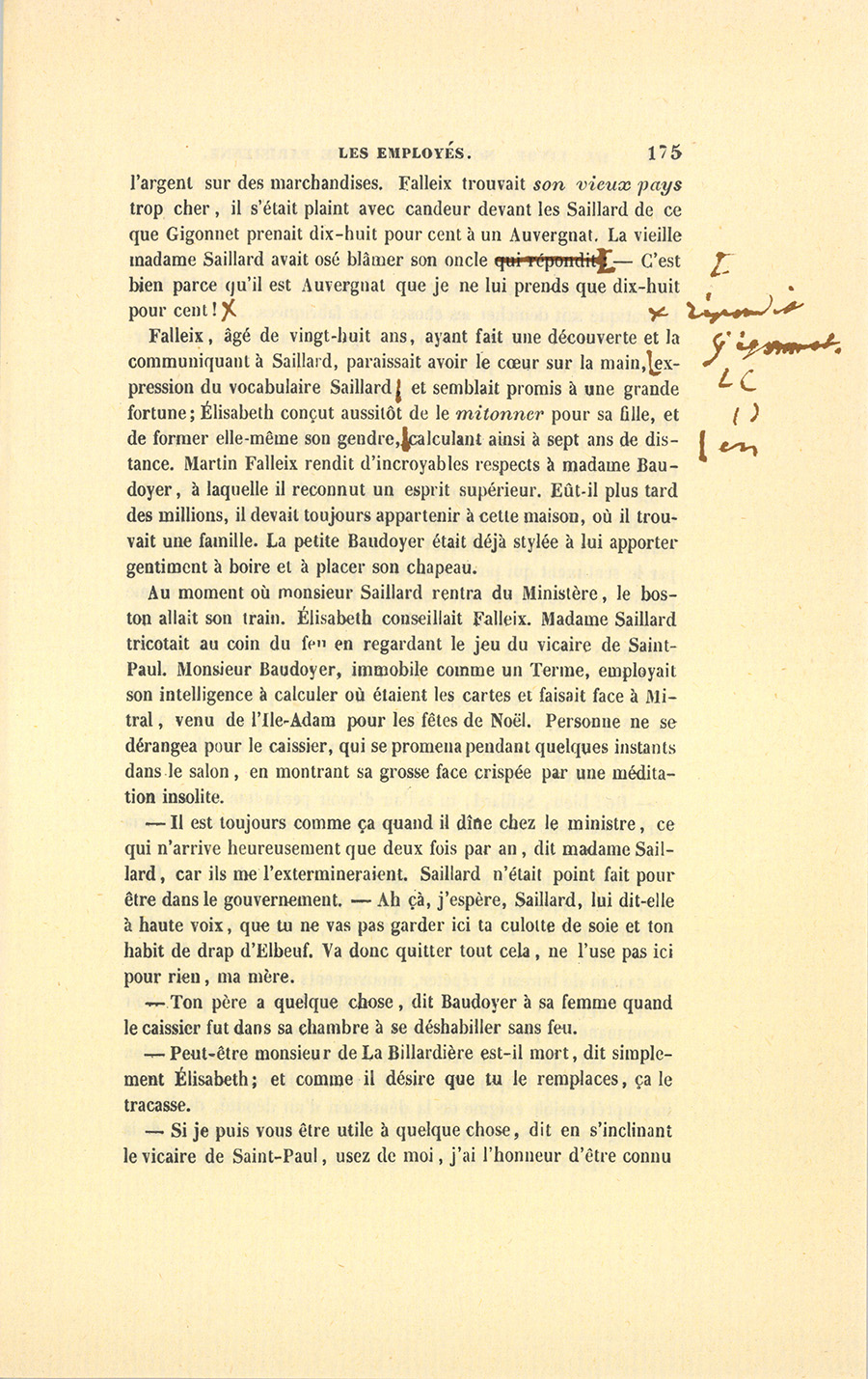 Profondément ému par les misères qu’il avait reconnues dans l’existence des employés, Xavier s’était demandé d’où venait leur croissante déconsidération ; il en avait recherché les {p. 142} causes, et les avait trouvées dans ces petites révolutions partielles qui furent comme le remous de la tempête de 1789 et que les historiens des grands mouvements sociaux négligent d’examiner, quoiqu’en définitif elles ayent fait nos mœurs ce qu’elles sont.