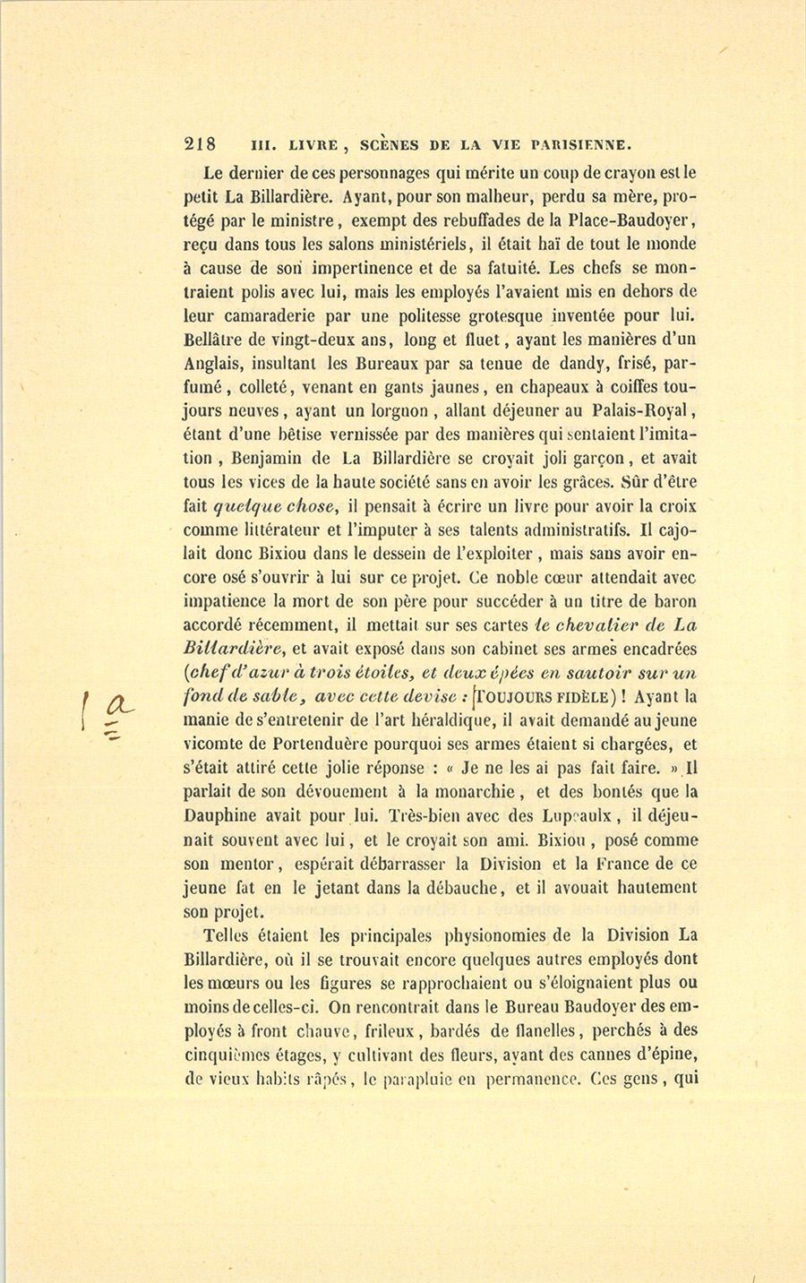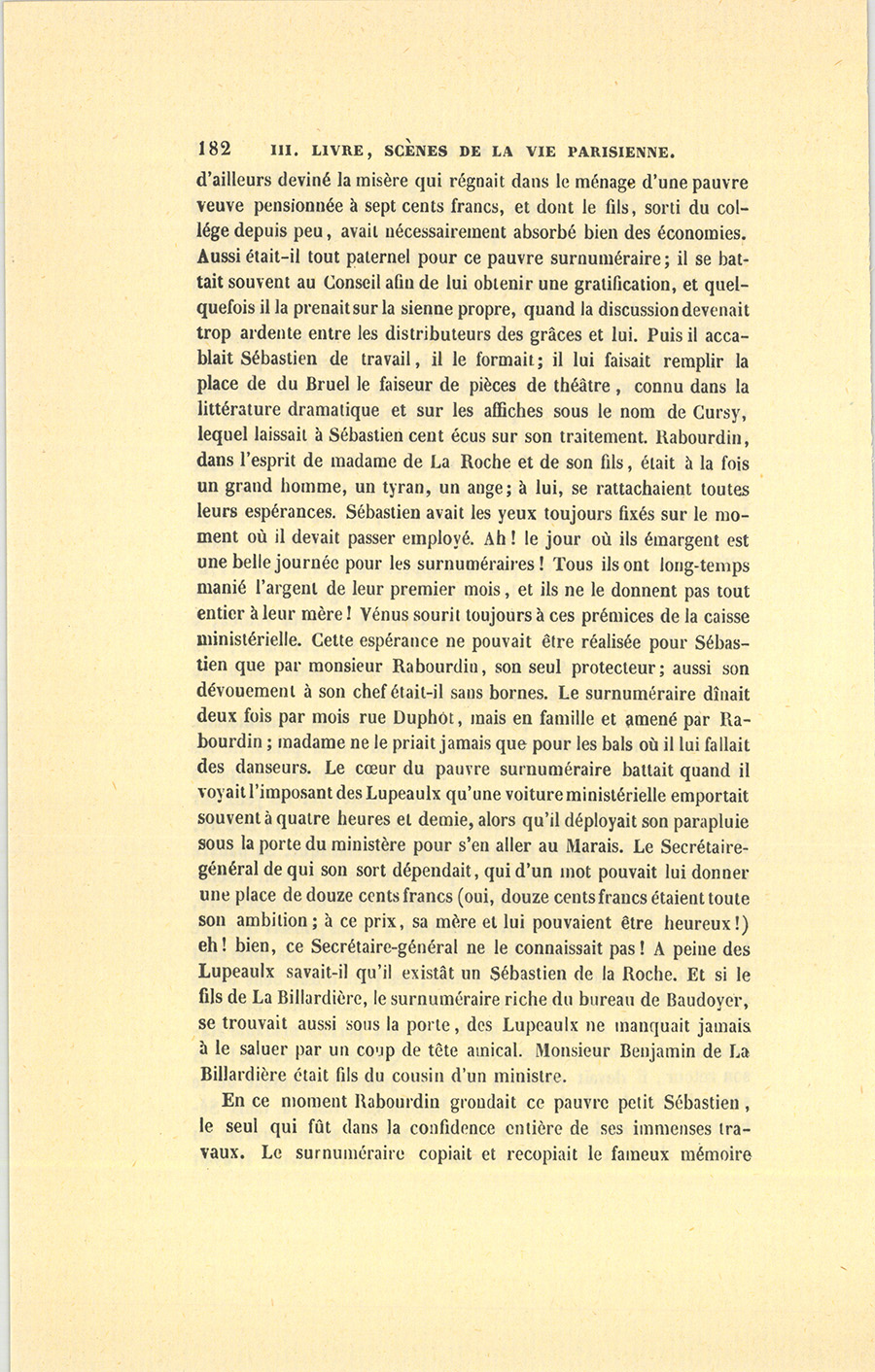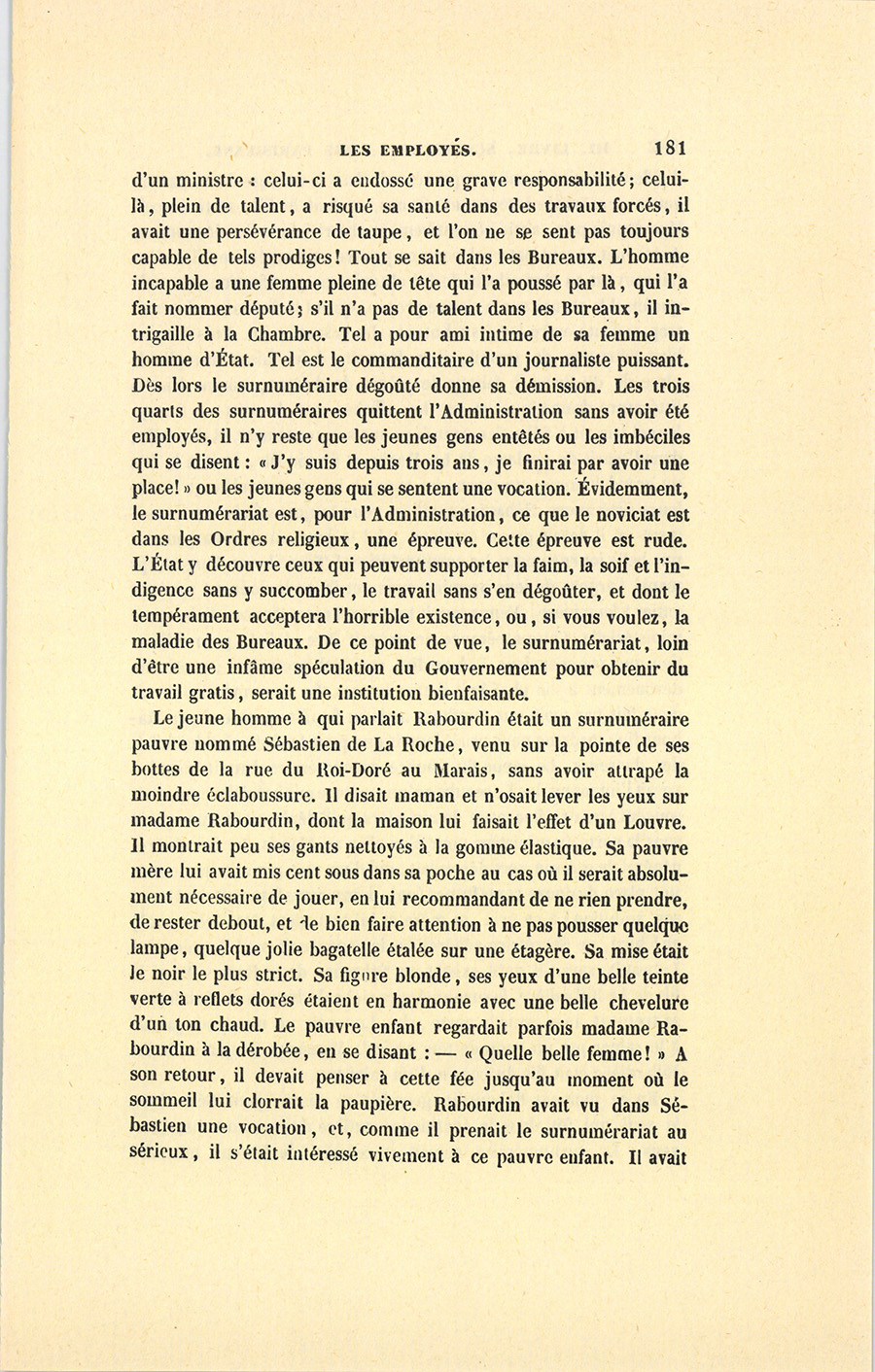 Le jeune homme à qui parlait Rabourdin était un surnuméraire pauvre nommé Sébastien de La Roche, venu sur la pointe de ses bottes de la rue du Roi-Doré au Marais, sans avoir attrapé la moindre éclaboussure. Il disait maman et n’osait lever les yeux sur madame Rabourdin, dont la maison lui faisait l’effet d’un Louvre. Il montrait peu ses gants nettoyés à la gomme élastique. Sa pauvre mère lui avait mis cent sous dans sa poche au cas où il serait absolument nécessaire de jouer, en lui recommandant de ne rien prendre, de rester debout, et de bien faire attention à ne pas pousser quelque lampe, quelque jolie bagatelle étalée sur une étagère. Sa mise était le noir le plus strict. Sa figure blonde, ses yeux d’une belle teinte verte à reflets dorés étaient en harmonie avec une belle chevelure d’un ton chaud. Le pauvre enfant regardait parfois madame Rabourdin à la dérobée, en se disant : – « Quelle belle femme ! » À son retour, il devait penser à cette fée jusqu’au moment où le sommeil lui clorait5 la paupière. Rabourdin avait vu dans Sébastien une vocation, et, comme il prenait le surnumérariat au sérieux, il s’était intéressé vivement à ce pauvre enfant. Il avait {p. 182} d’ailleurs deviné la misère qui régnait dans le ménage d’une pauvre veuve pensionnée à sept cents francs, et dont le fils, sorti du collége depuis peu, avait nécessairement absorbé bien des économies. Aussi était-il tout paternel pour ce pauvre surnuméraire ; il se battait souvent au Conseil afin de lui obtenir une gratification, et quelquefois il la prenait sur la sienne propre, quand la discussion devenait trop ardente entre les distributeurs des grâces et lui. Puis il accablait Sébastien de travail, il le formait ; il lui faisait remplir la place de du Bruel le faiseur de pièces de théâtre, connu dans la littérature dramatique et sur les affiches sous le nom de Cursy, lequel laissait à Sébastien cent écus sur son traitement. Rabourdin, dans l’esprit de madame de La Roche et de son fils, était à la fois un grand homme, un tyran, un ange ; à lui, se rattachaient toutes leurs espérances. Sébastien avait les yeux toujours fixés sur le moment où il devait passer employé. Ah ! le jour où ils émargent est une belle journée pour les surnuméraires ! Tous ils ont long-temps manié l’argent de leur premier mois, et ils ne le donnent pas tout entier à leur mère ! Vénus sourit toujours à ces prémices de la caisse ministérielle. Cette espérance ne pouvait être réalisée pour Sébastien que par monsieur Rabourdin, son seul protecteur, aussi son dévouement à son chef était-il sans bornes. Le surnuméraire dînait deux fois par mois rue Duphot, mais en famille et amené par Rabourdin ; madame ne le priait jamais que pour les bals où il lui fallait des danseurs. Le cœur du pauvre surnuméraire battait quand il voyait l’imposant des Lupeaulx qu’une voiture ministérielle emportait souvent à quatre heures et demie, alors qu’il déployait son parapluie sous la porte du ministère pour s’en aller au Marais. Le Secrétaire-général de qui son sort dépendait, qui d’un mot pouvait lui donner une place de douze cents francs (oui, douze cents francs étaient toute son ambition ; à ce prix, sa mère et lui pouvaient être heureux !) eh ! bien, ce Secrétaire-général ne le connaissait pas ! À peine des Lupeaulx savait-il qu’il existât un Sébastien de la Roche. Et si le fils de La Billardière, le surnuméraire riche du bureau de Baudoyer, se trouvait aussi sous la porte, des Lupeaulx ne manquait jamais à le saluer par un coup de tête amical. Monsieur Benjamin de La Billardière était fils du cousin d’un ministre.