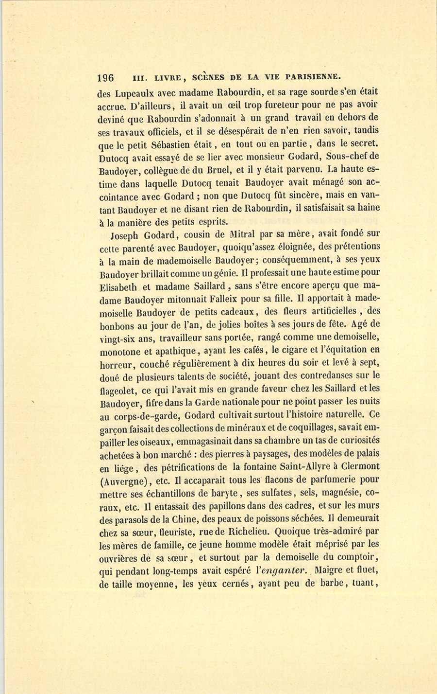 Plus tard, dans le banc de la Fabrique de Saint-Paul, Saillard fit la connaissance de monsieur et madame Transon, gros négociants en poteries, établis rue de Lesdiguières, qui s’intéressèrent à Élisabeth, et, qui, dans l’intention de la marier, produisirent le jeune Isidore Baudoyer chez les Saillard. La liaison de monsieur et madame Baudoyer avec les Saillard se resserra par l’approbation de Gigonnet, qui, pendant long-temps, avait employé dans ses affaires un sieur Mitral, huissier, frère de madame Baudoyer la mère, lequel voulait alors se retirer dans une jolie maison à L’Île-Adam. Monsieur et madame Baudoyer, père et mère d’Isidore, honnêtes mégissiers de la rue Censier, avaient lentement fait une fortune médiocre dans un commerce routinier. Après avoir marié leur fils unique, auquel ils donnèrent cinquante mille francs, ils pensèrent {p. 172} à vivre à la campagne, et choisirent le pays de L’Île-Adam où ils attirèrent Mitral ; mais ils vinrent fréquemment à Paris, où ils conservaient un pied-à-terre dans la maison de la rue Censier donnée en dot à Isidore. Les Baudoyer jouissaient encore de mille écus de rente, après avoir doté leur fils.