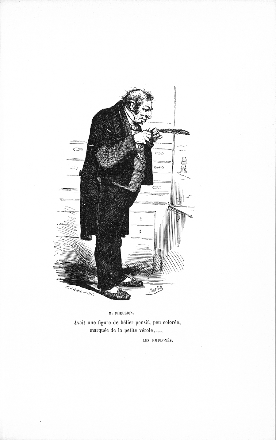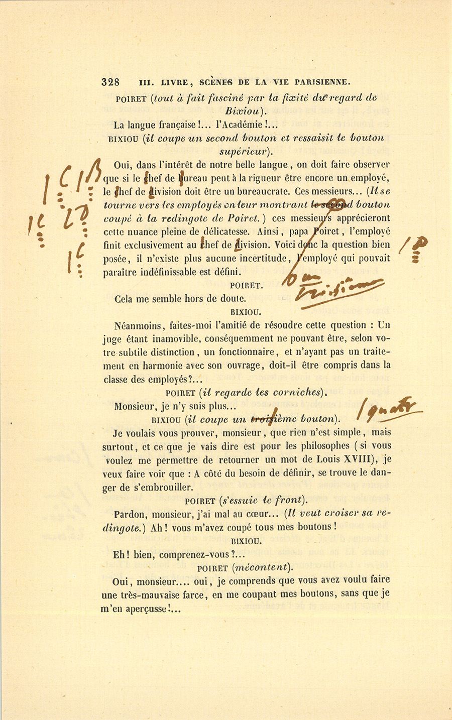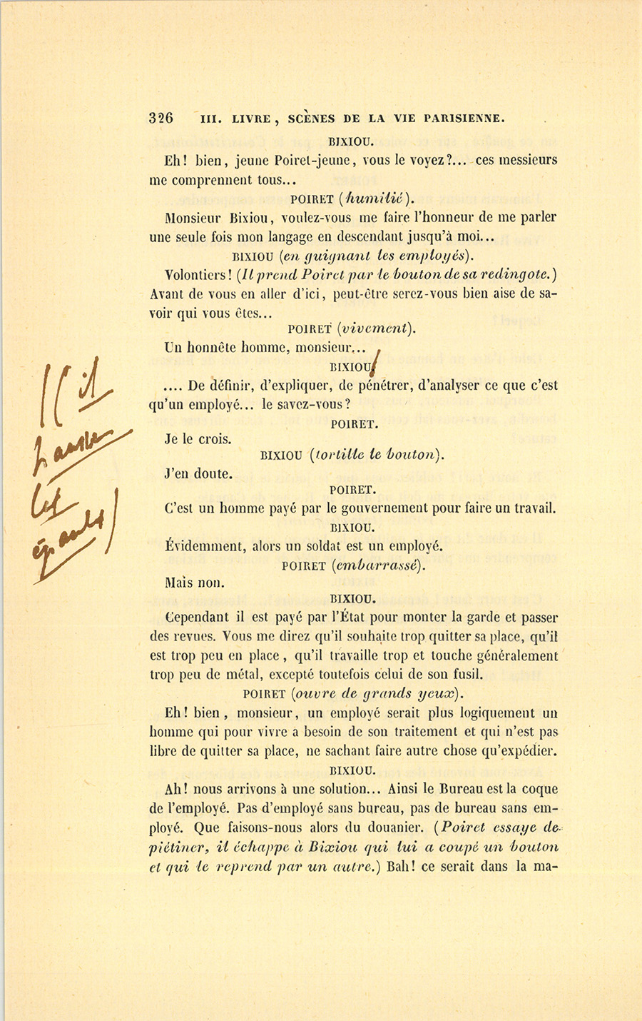 Ah ! nous arrivons à une solution… Ainsi le Bureau est la coque de l’employé. Pas d’employé sans bureau, pas de bureau sans employé. Que faisons-nous alors du douanier. (Poiret essaye de piétiner, il échappe à Bixiou qui lui a coupé un bouton et qui le reprend par un autre.) Bah ! ce serait dans la {p. 327} matière bureaucratique un être neutre. Le gabelou est à moitié employé, il est sur les confins des bureaux et des armes, comme sur les frontières : ni tout à fait soldat, ni tout à fait employé. Mais, papa, où allons-nous ? (Il tortille le bouton.) Où cesse l’employé ? Question grave ! Un préfet est-il un employé ?