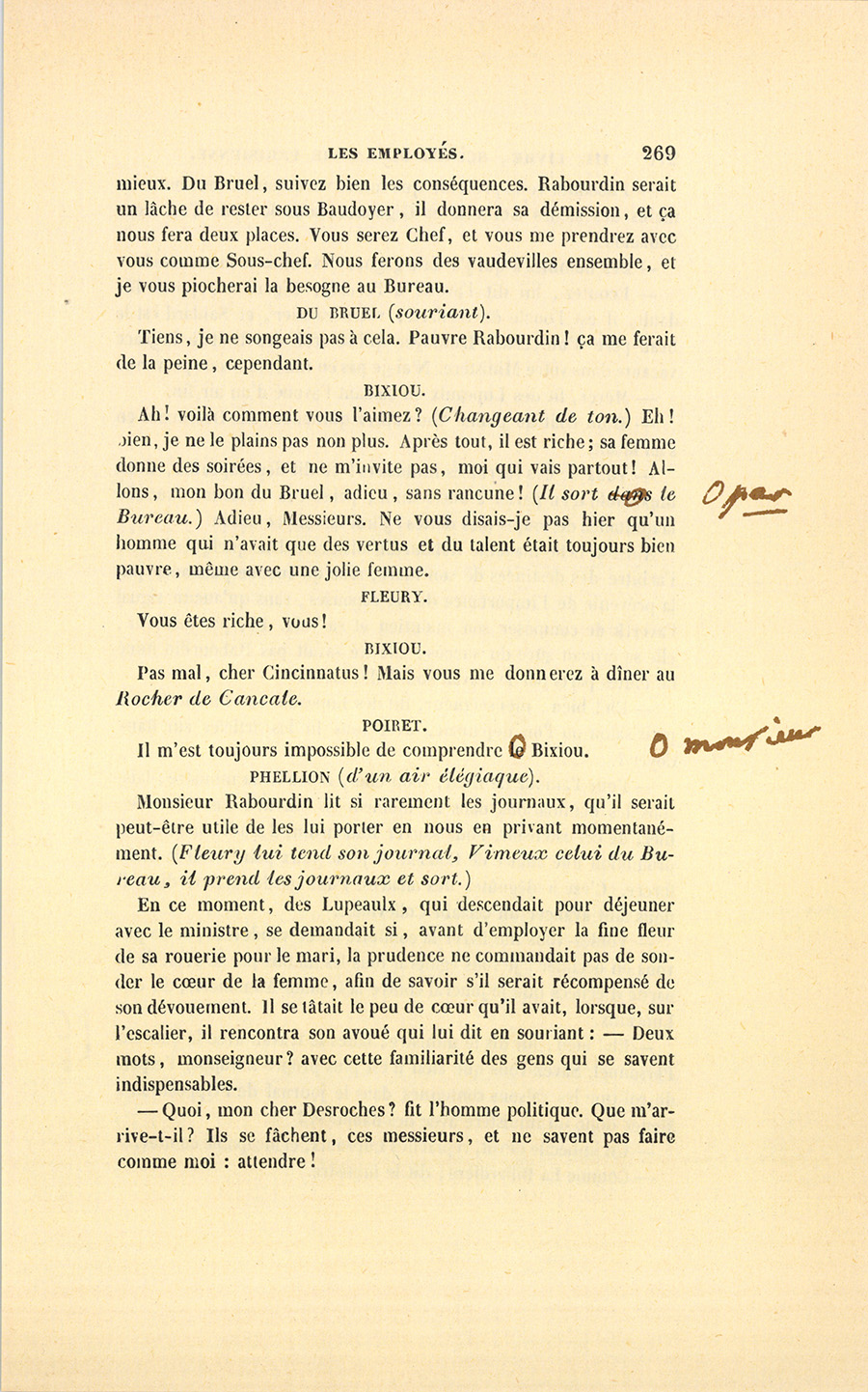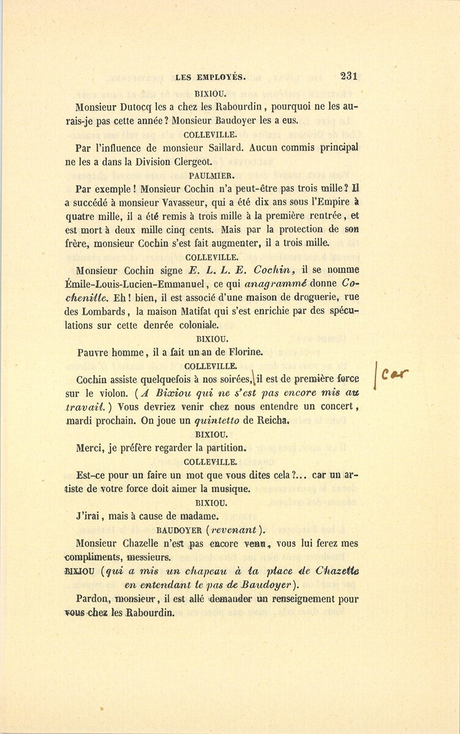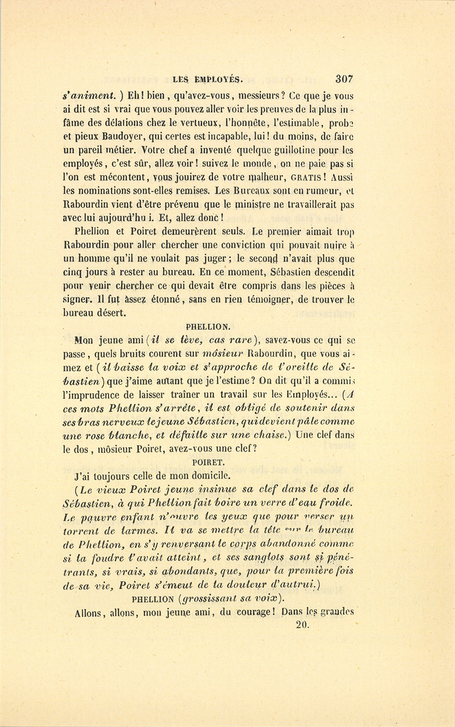 Ah ! nous arrivons à une solution… Ainsi le Bureau est la coque de l’employé. Pas d’employé sans bureau, pas de bureau sans employé. Que faisons-nous alors du douanier. (Poiret essaye de piétiner, il échappe à Bixiou qui lui a coupé un bouton et qui le reprend par un autre.) Bah ! ce serait dans la {p. 327} matière bureaucratique un être neutre. Le gabelou est à moitié employé, il est sur les confins des bureaux et des armes, comme sur les frontières : ni tout à fait soldat, ni tout à fait employé. Mais, papa, où allons-nous ? (Il tortille le bouton.) Où cesse l’employé ? Question grave ! Un préfet est-il un employé ?
