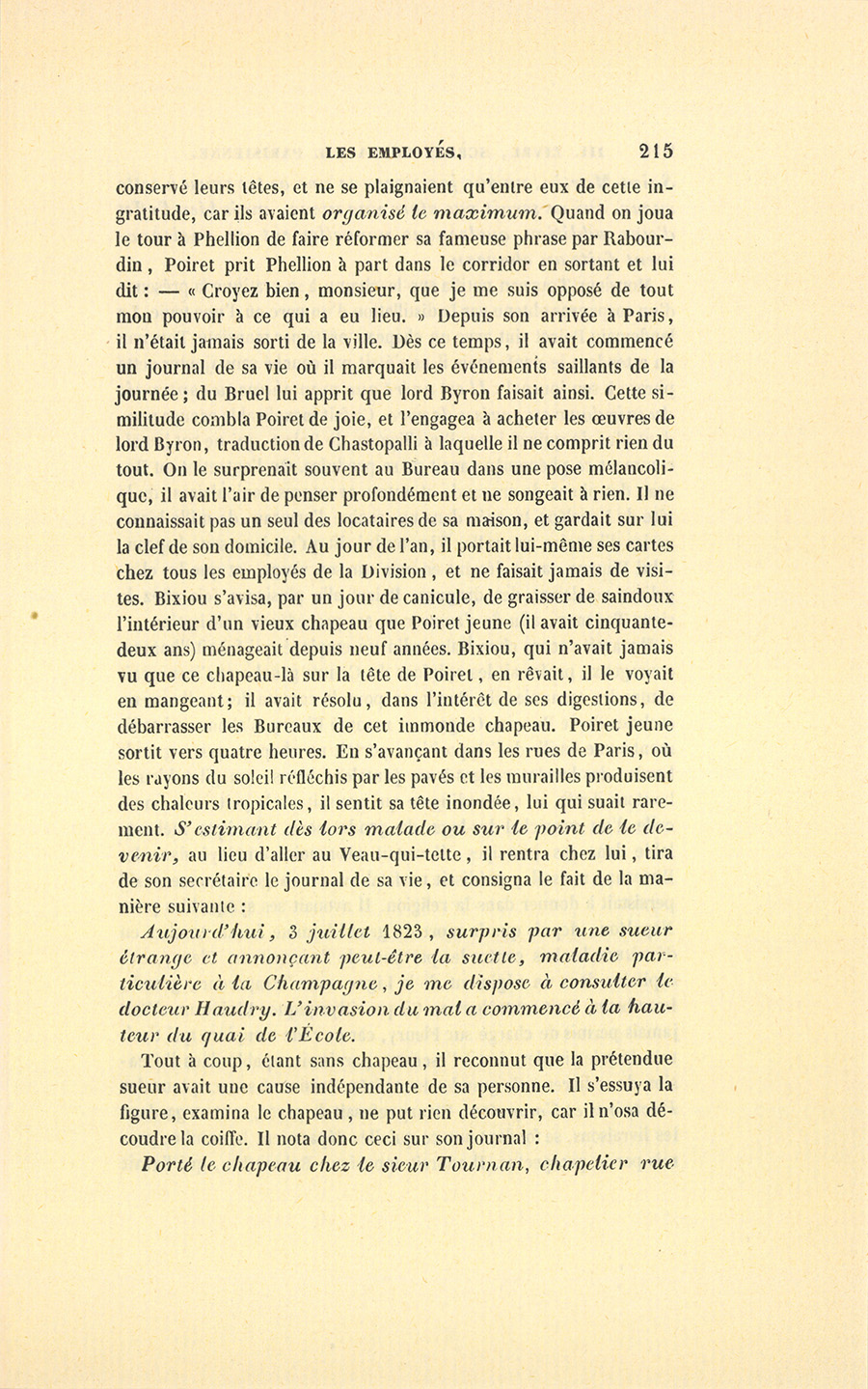Il se rencontre cependant peu d’hommes d’État parmi les préfets. Le préfet serait alors un neutre des Genres supérieurs. Il se trouverait entre l’homme d’État et l’employé, comme le douanier se trouve entre le civil et le militaire. Continuons à débrouiller ces hautes questions. (Poiret devient rouge.) Ceci ne peut-il pas se formuler par ce théorème digne de Larochefoucault : Au-dessus de vingt mille francs d’appointements, il n’y a plus d’employés. Nous pouvons mathématiquement en tirer ce premier corollaire : L’homme d’État se déclare dans la sphère des traitements supérieurs. Et ce non moins important et logique deuxième corollaire : Les Directeurs généraux peuvent être des hommes d’État. Peut-être est-ce dans ce sens que plus d’un député se dit : – C’est un bel état que d’être directeur général ! Mais, dans l’intérêt de la langue française et de l’Académie…