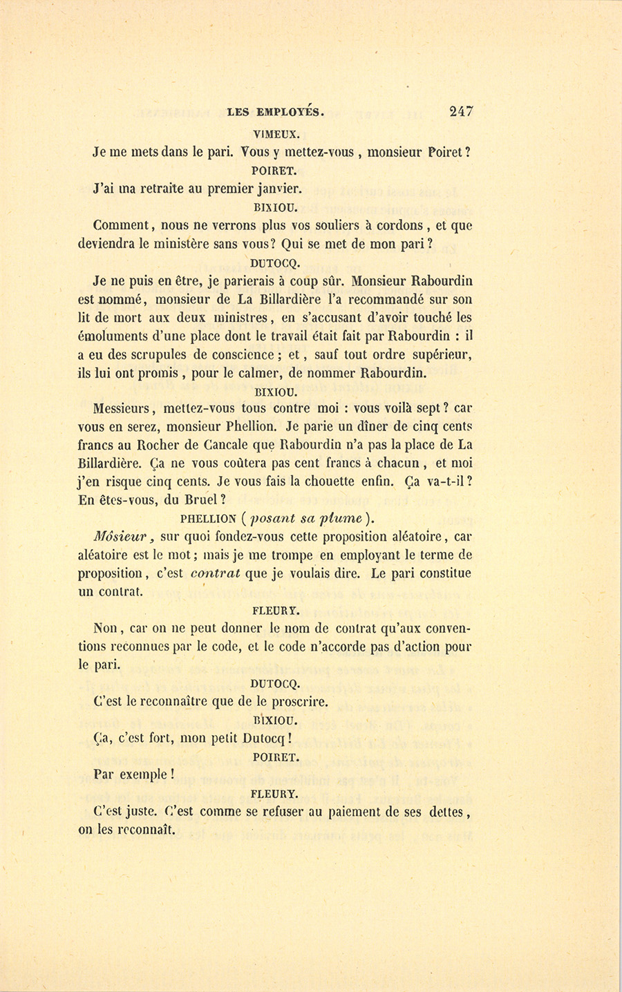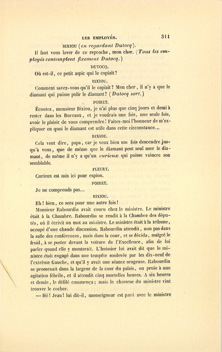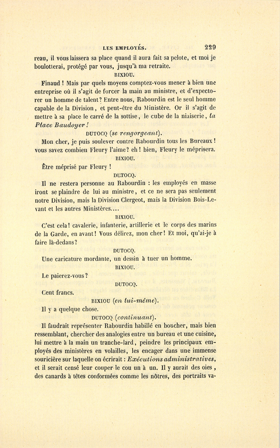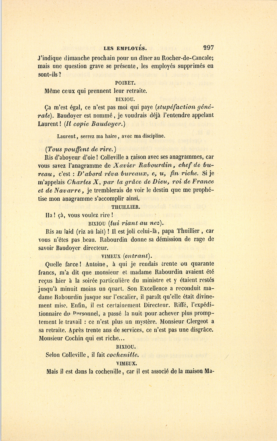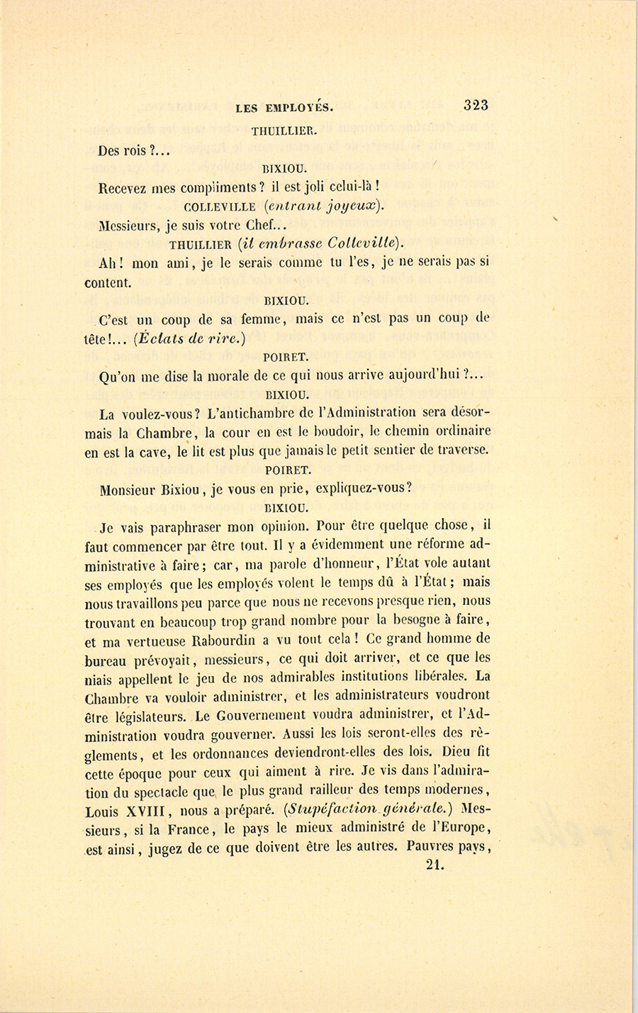 Vieillard ! vous vous trompez. J’ai voulu graver dans votre cerveau la plus vivante image possible du Gouvernement constitutionnel (tous les employés regardent Bixiou, Poiret stupéfait le contemple dans une sorte d’inquiétude) et vous tenir ainsi ma parole. J’ai pris la manière parabolique des Sauvages. (Écoutez !) Pendant que les ministres établissent à la Chambre des colloques à peu près aussi concluants, aussi utiles que le nôtre, l’Administration coupe des boutons aux contribuables.