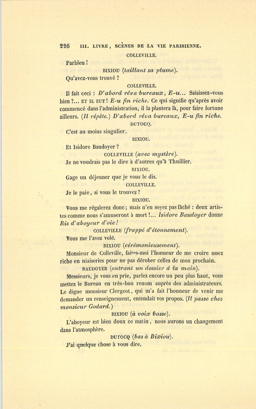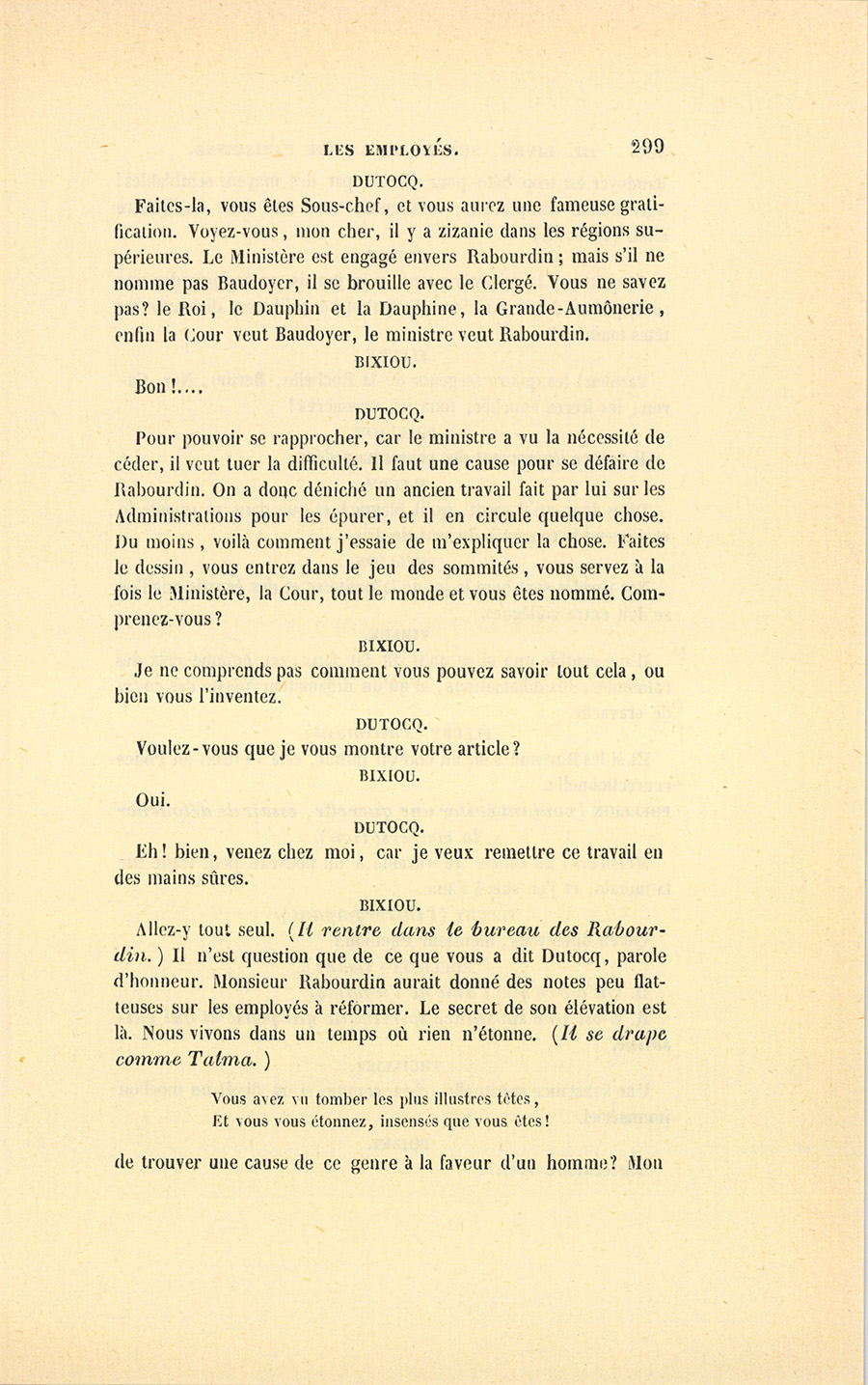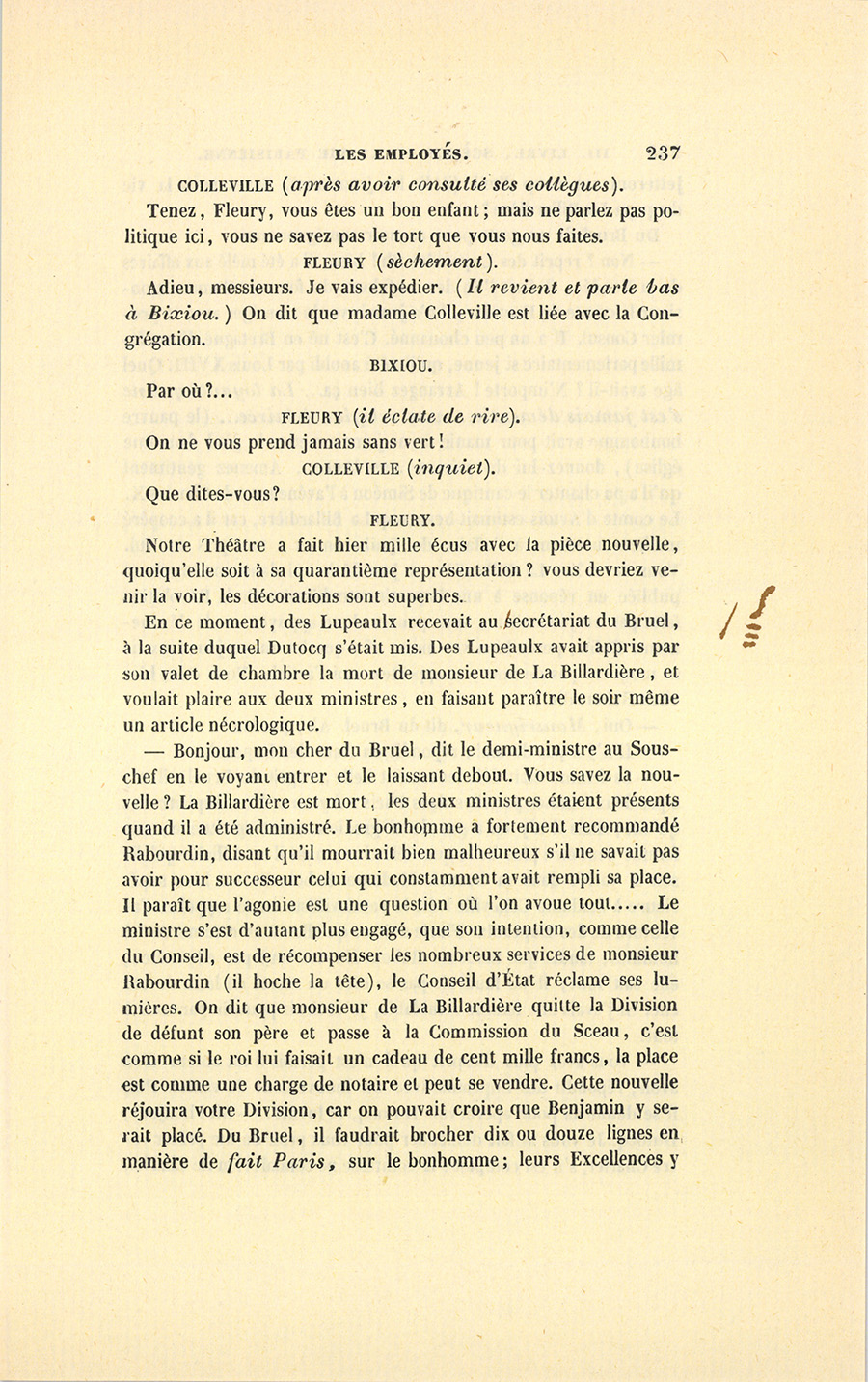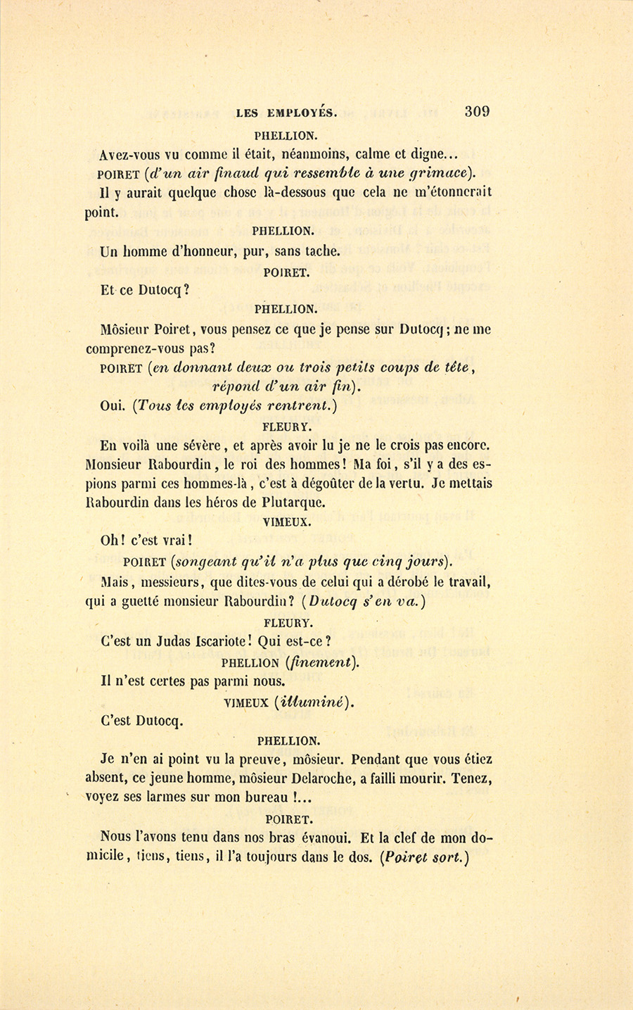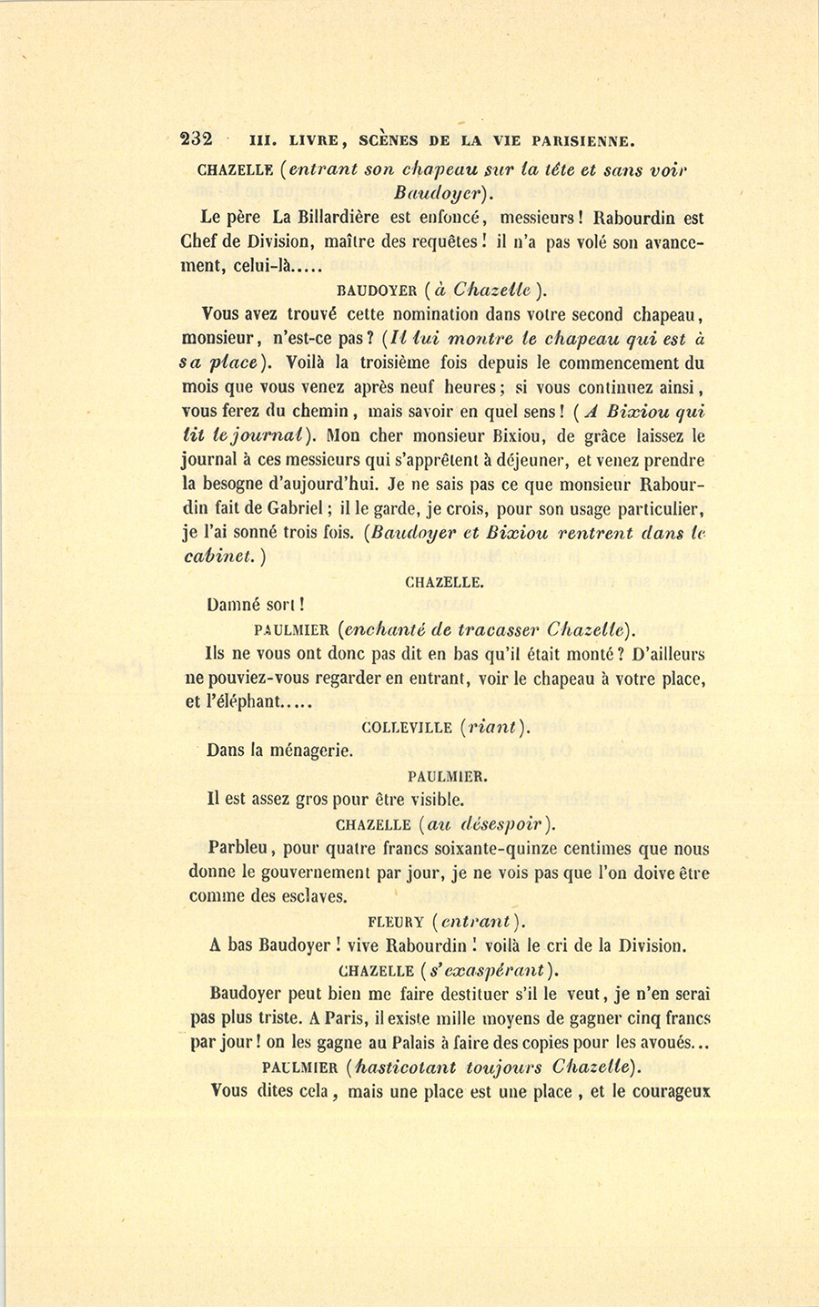 Vieillard ! vous vous trompez. J’ai voulu graver dans votre cerveau la plus vivante image possible du Gouvernement constitutionnel (tous les employés regardent Bixiou, Poiret stupéfait le contemple dans une sorte d’inquiétude) et vous tenir ainsi ma parole. J’ai pris la manière parabolique des Sauvages. (Écoutez !) Pendant que les ministres établissent à la Chambre des colloques à peu près aussi concluants, aussi utiles que le nôtre, l’Administration coupe des boutons aux contribuables.