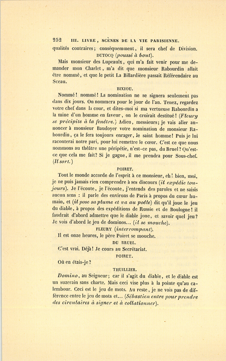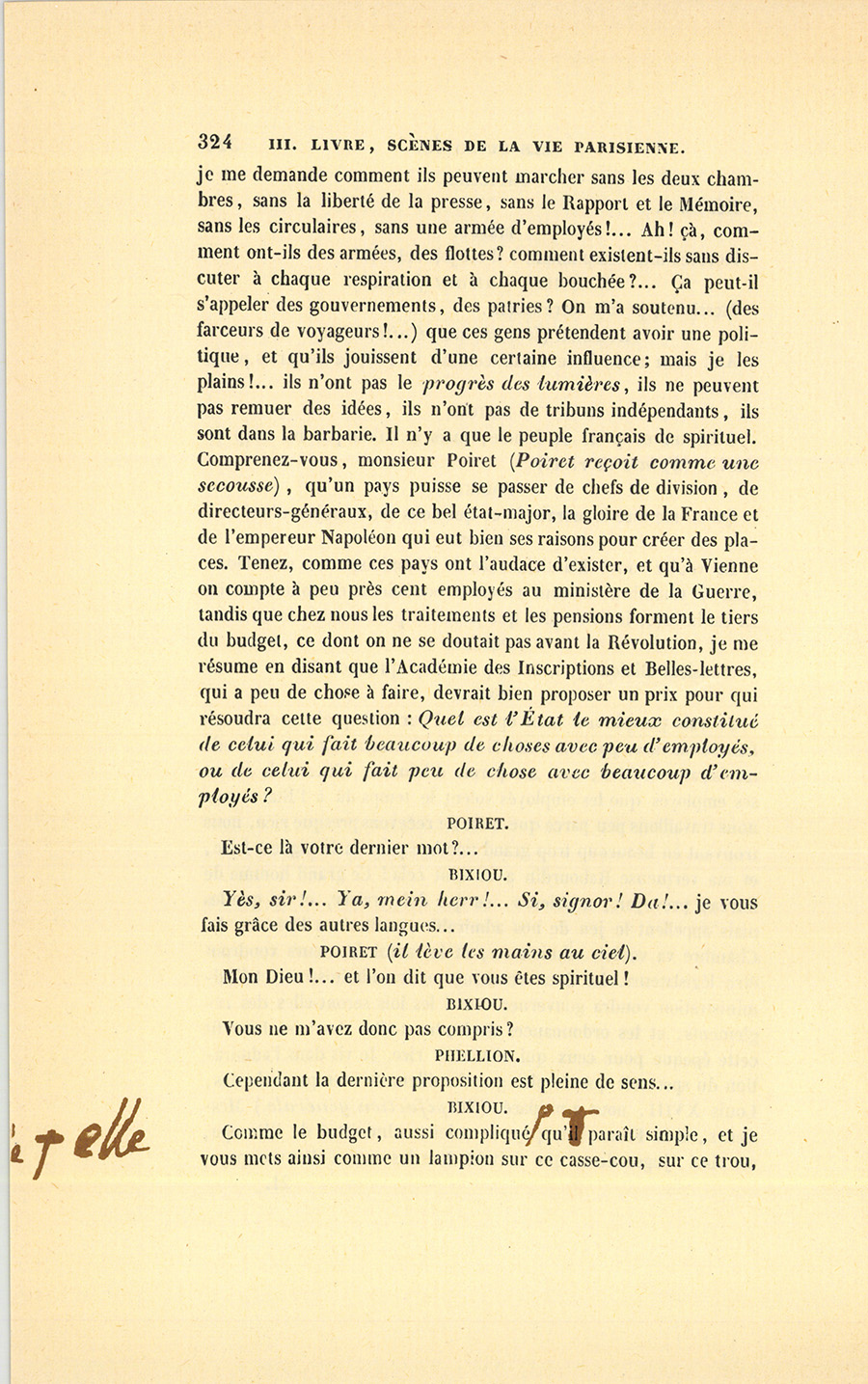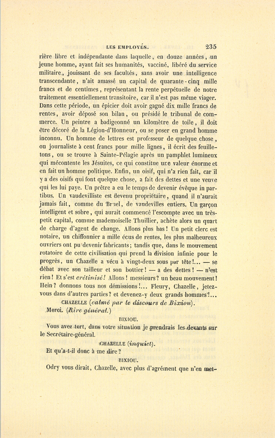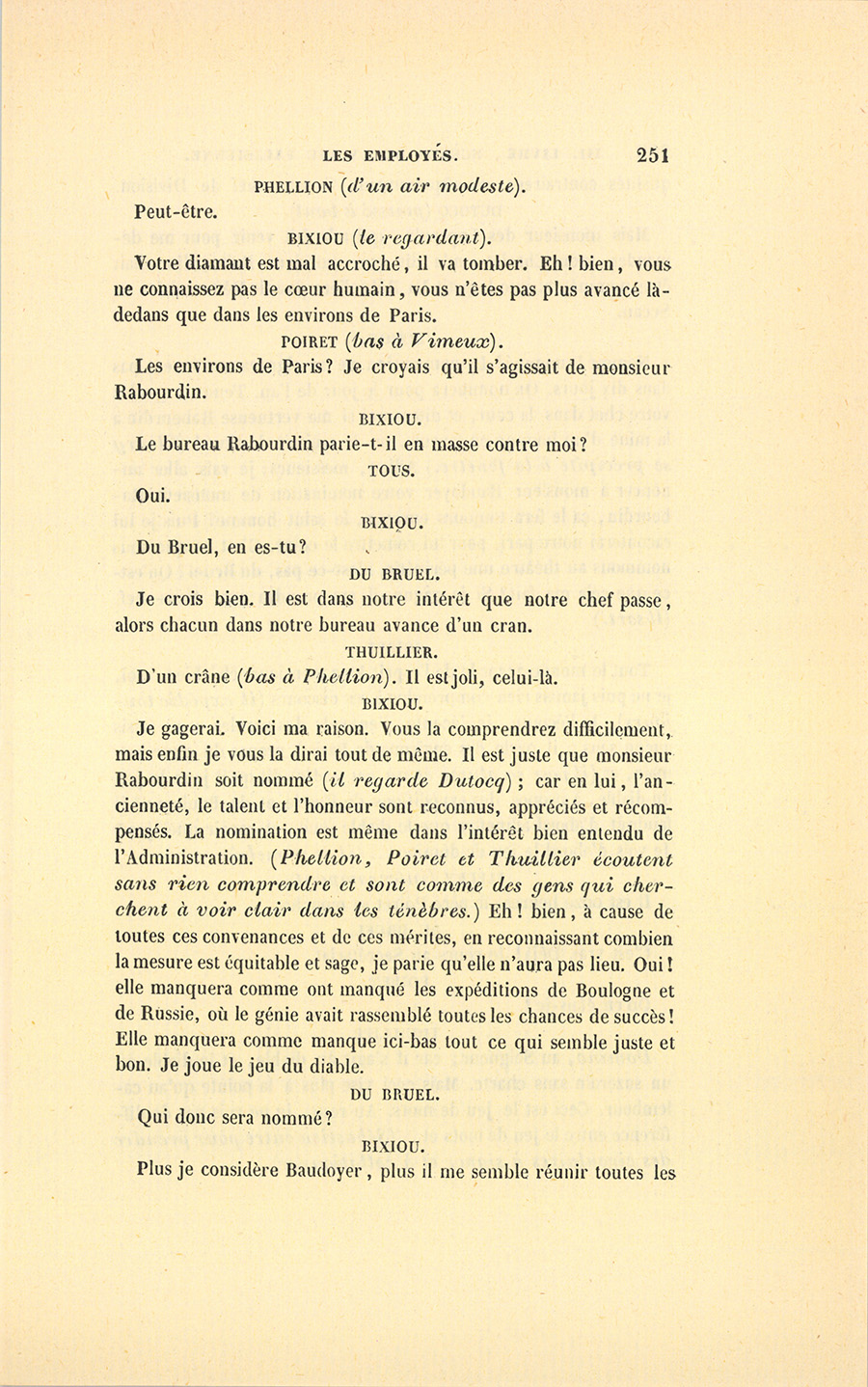 Vieillard ! vous vous trompez. J’ai voulu graver dans votre cerveau la plus vivante image possible du Gouvernement constitutionnel (tous les employés regardent Bixiou, Poiret stupéfait le contemple dans une sorte d’inquiétude) et vous tenir ainsi ma parole. J’ai pris la manière parabolique des Sauvages. (Écoutez !) Pendant que les ministres établissent à la Chambre des colloques à peu près aussi concluants, aussi utiles que le nôtre, l’Administration coupe des boutons aux contribuables.
