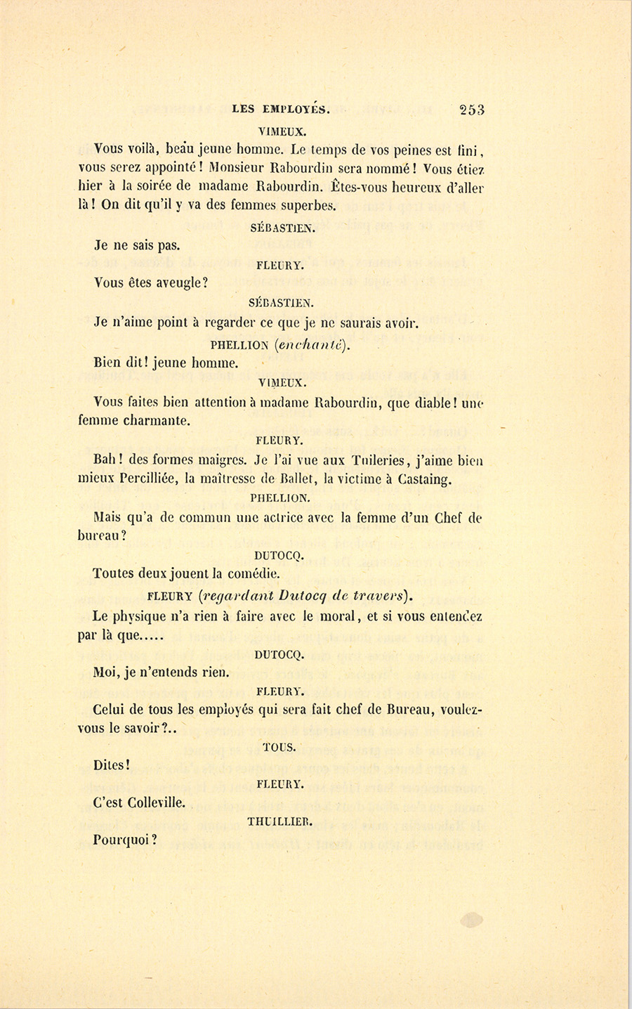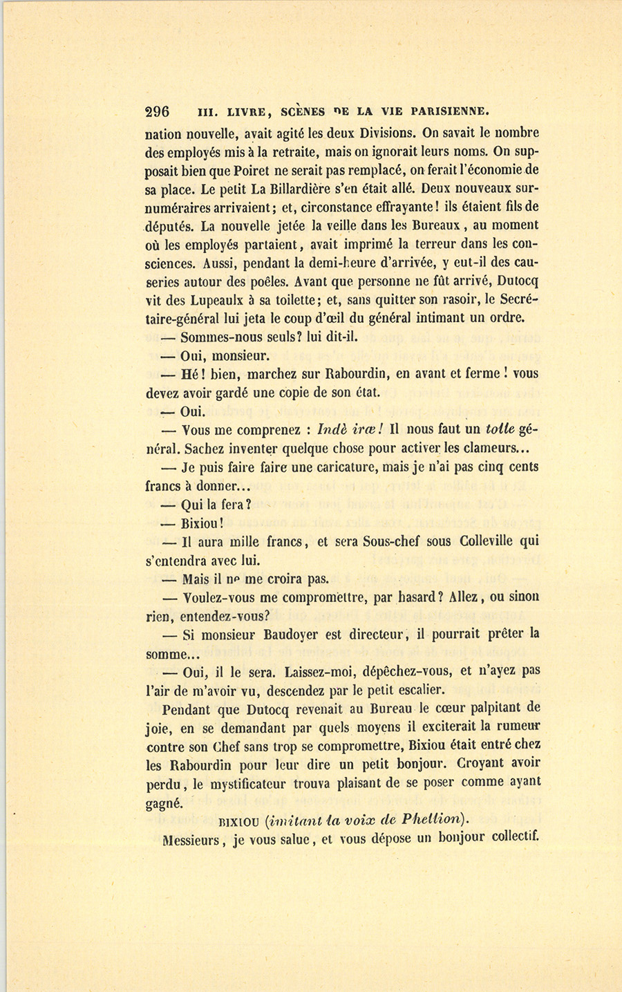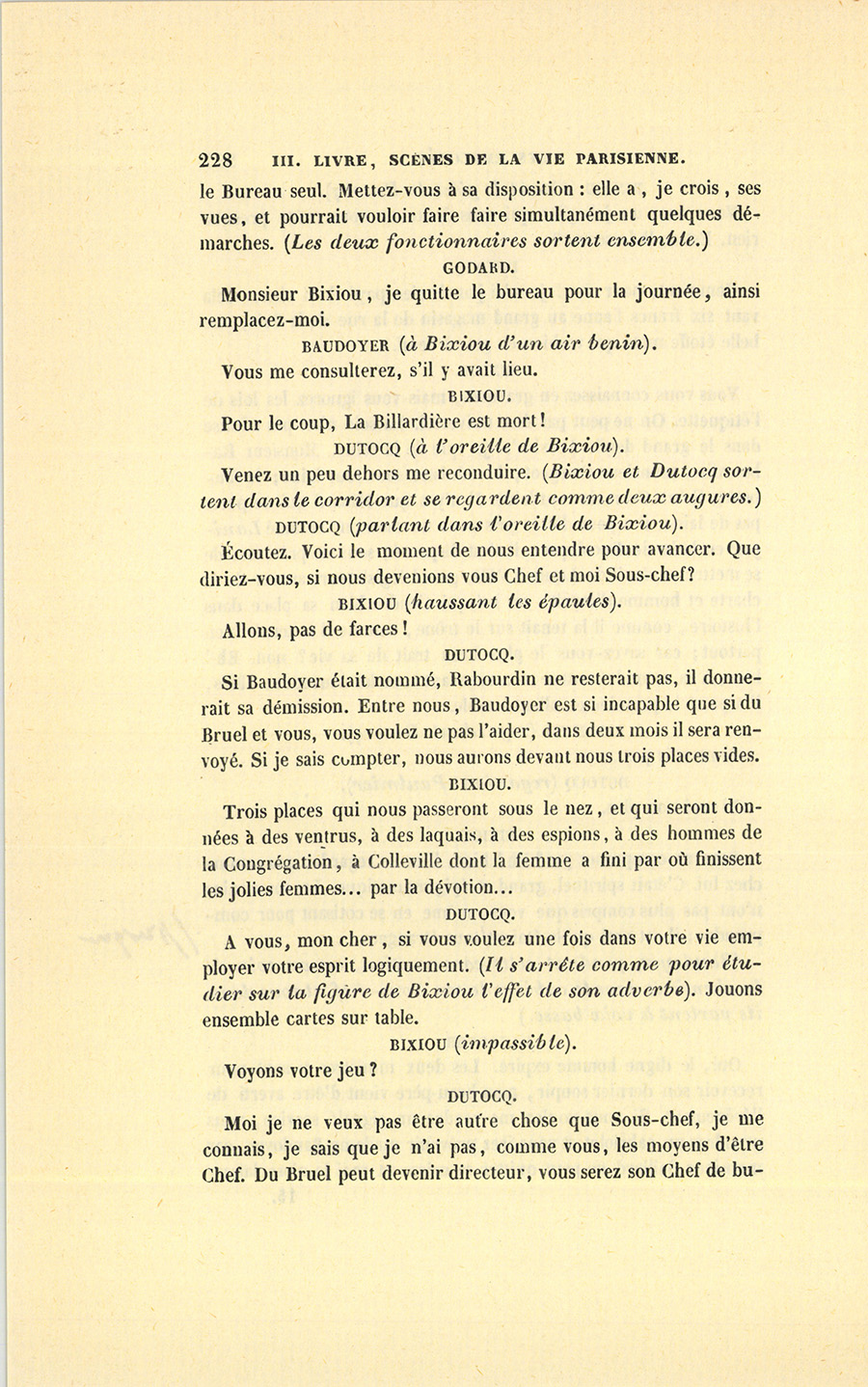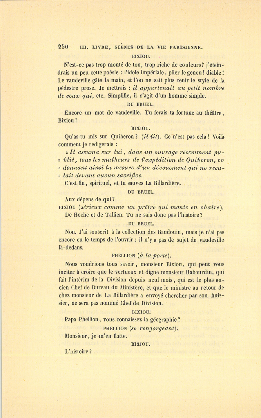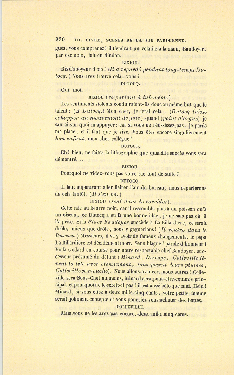 Vieillard ! vous vous trompez. J’ai voulu graver dans votre cerveau la plus vivante image possible du Gouvernement constitutionnel (tous les employés regardent Bixiou, Poiret stupéfait le contemple dans une sorte d’inquiétude) et vous tenir ainsi ma parole. J’ai pris la manière parabolique des Sauvages. (Écoutez !) Pendant que les ministres établissent à la Chambre des colloques à peu près aussi concluants, aussi utiles que le nôtre, l’Administration coupe des boutons aux contribuables.