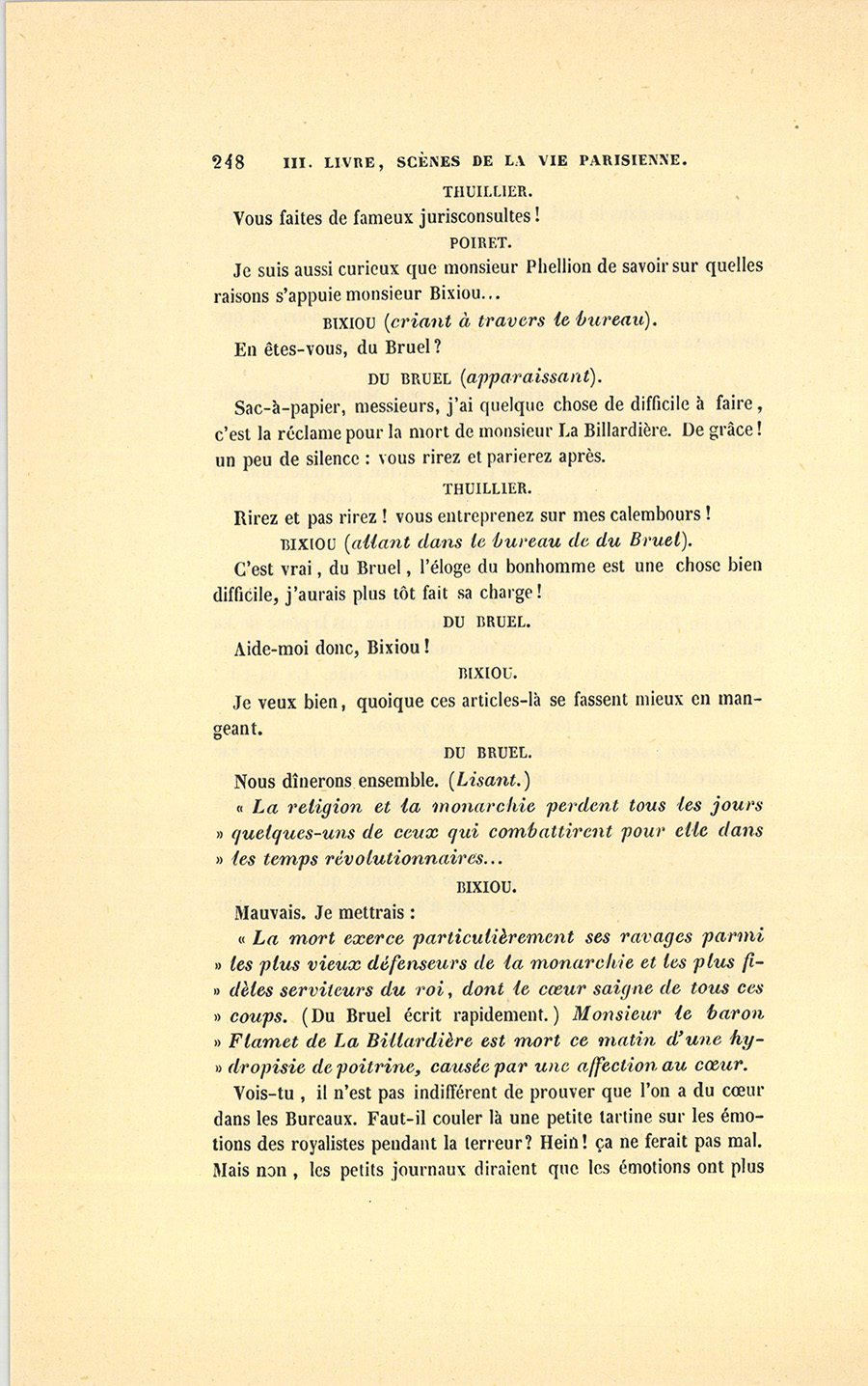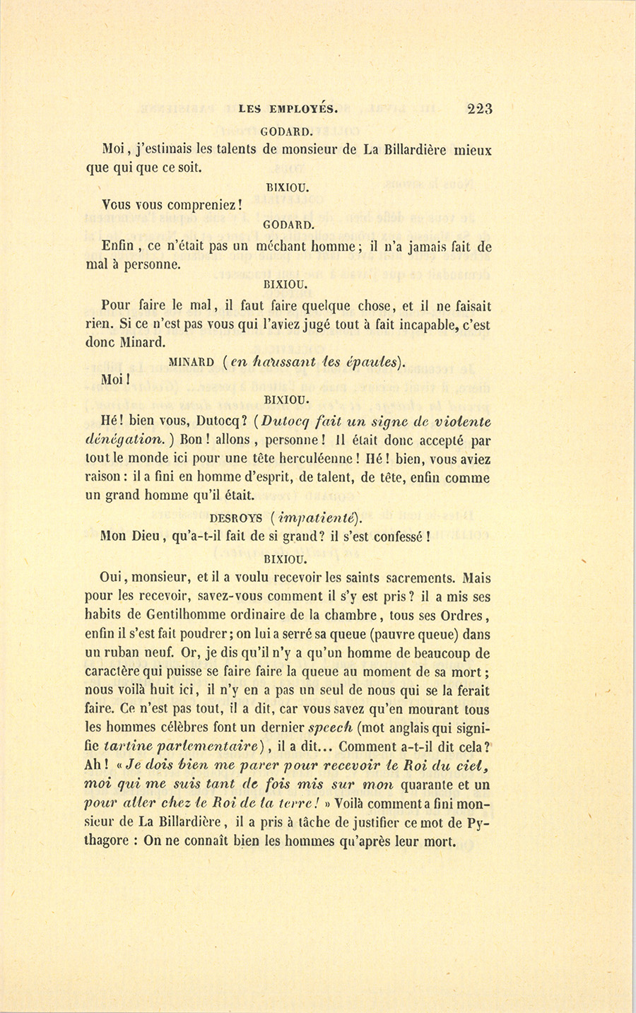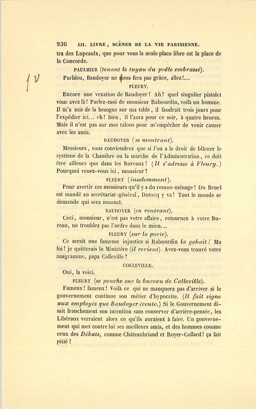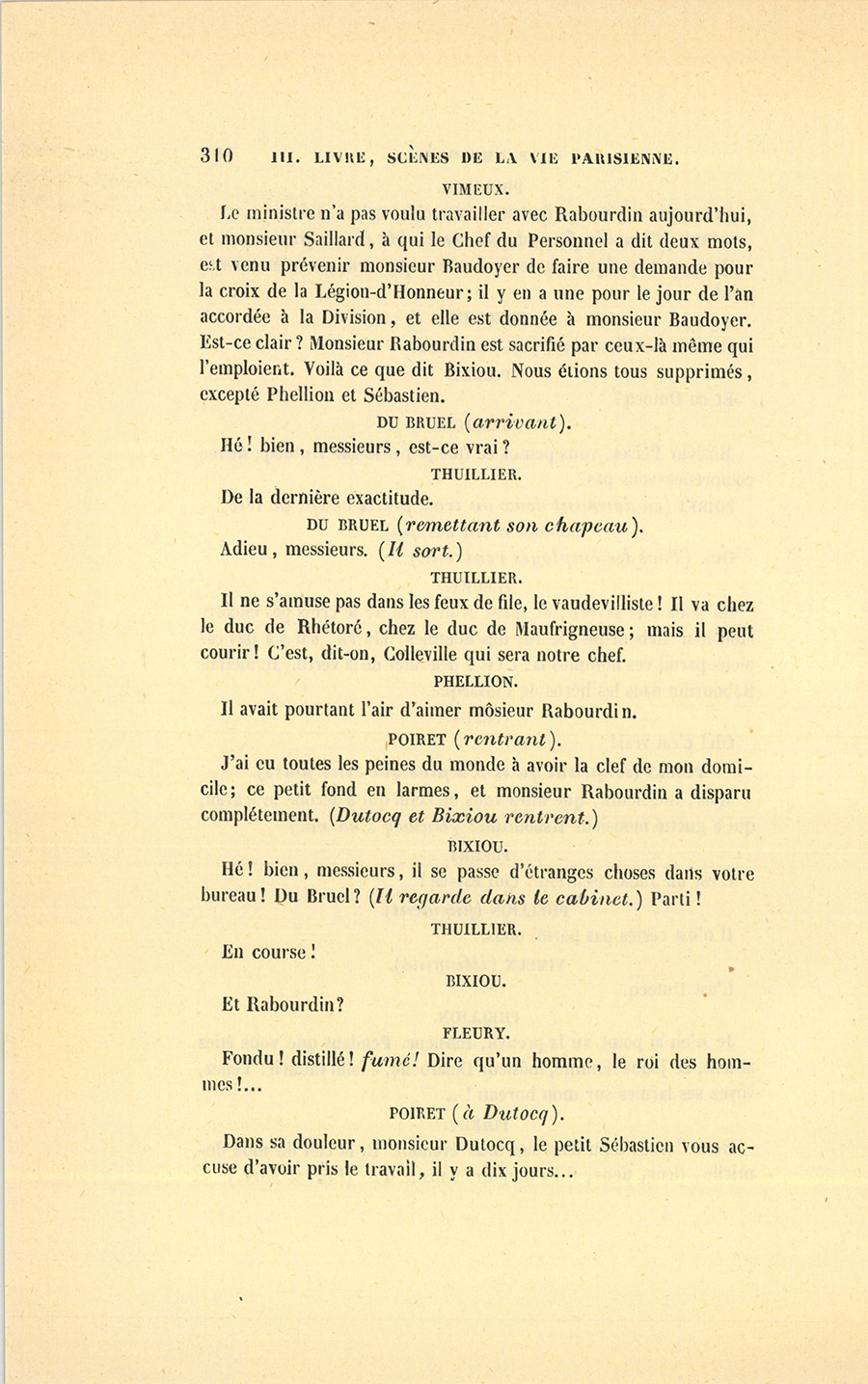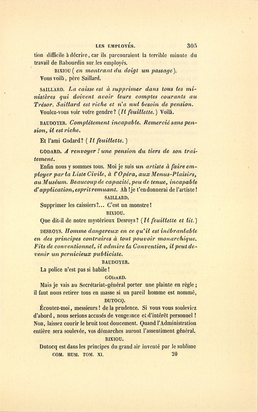 Vieillard ! vous vous trompez. J’ai voulu graver dans votre cerveau la plus vivante image possible du Gouvernement constitutionnel (tous les employés regardent Bixiou, Poiret stupéfait le contemple dans une sorte d’inquiétude) et vous tenir ainsi ma parole. J’ai pris la manière parabolique des Sauvages. (Écoutez !) Pendant que les ministres établissent à la Chambre des colloques à peu près aussi concluants, aussi utiles que le nôtre, l’Administration coupe des boutons aux contribuables.