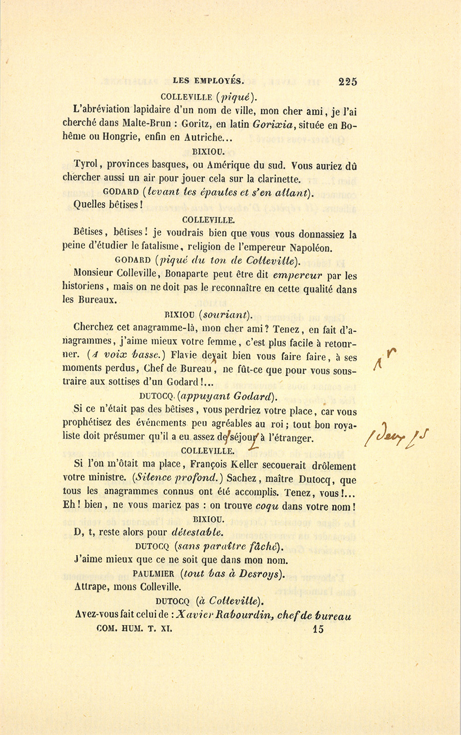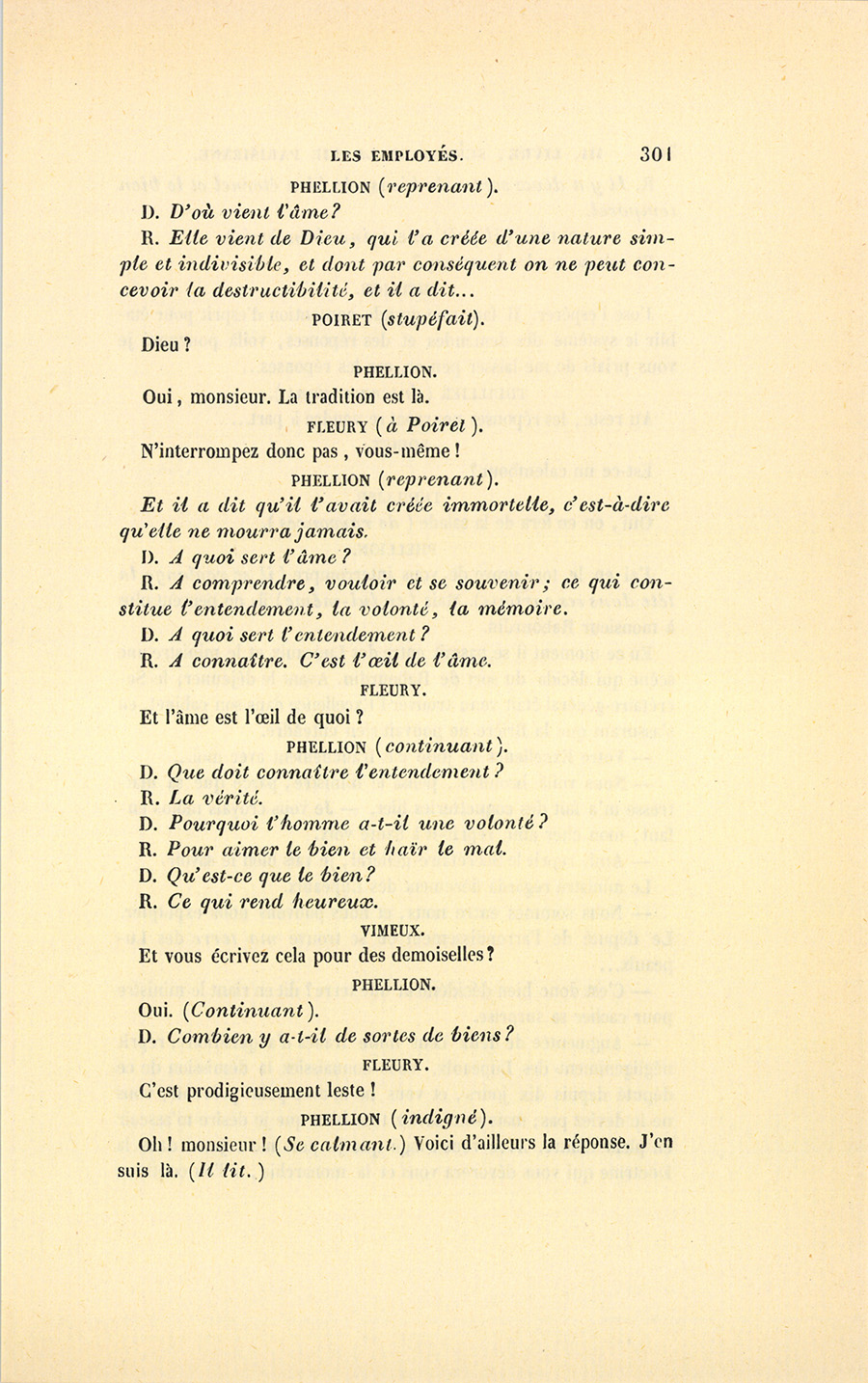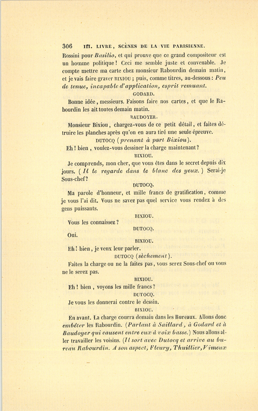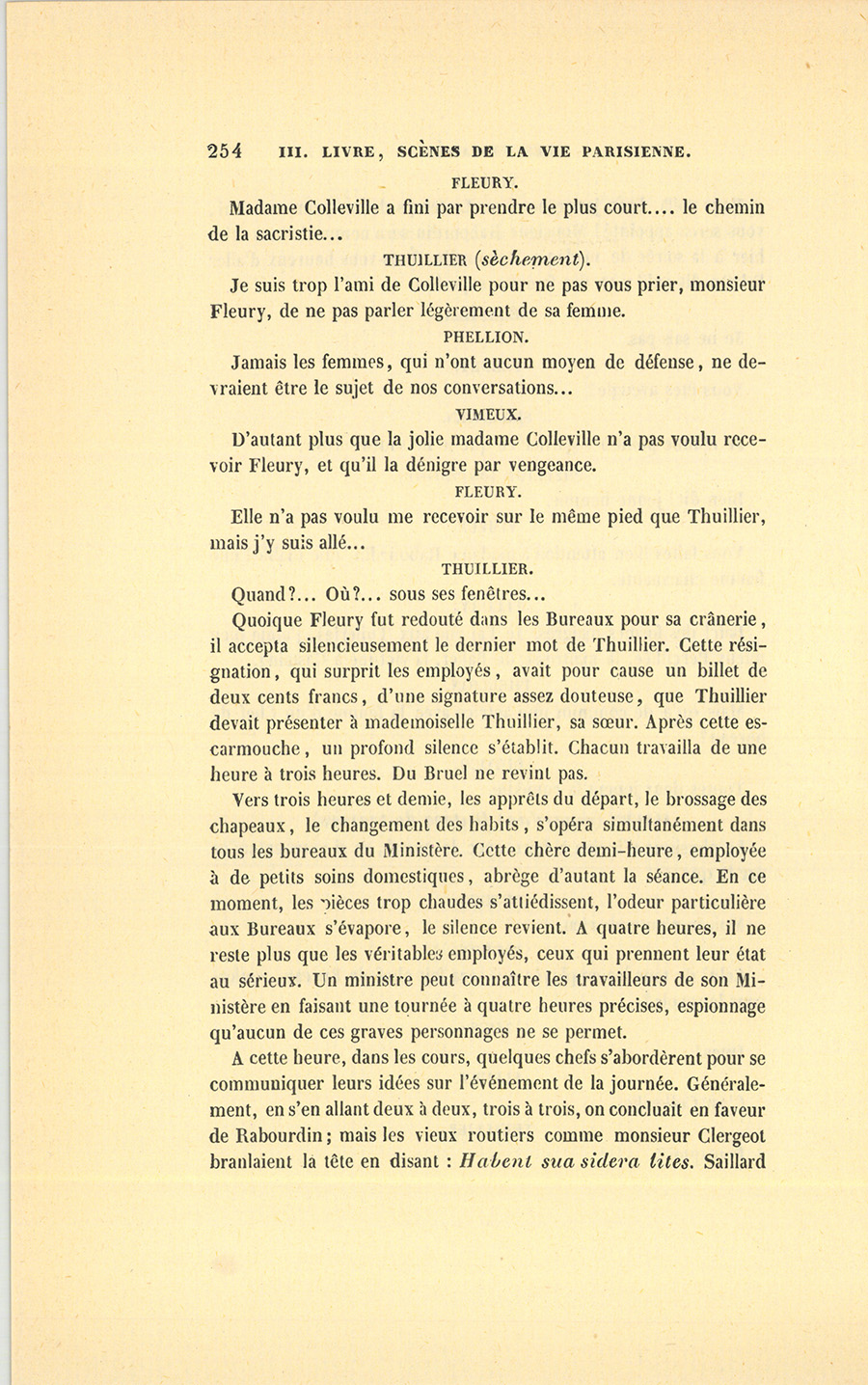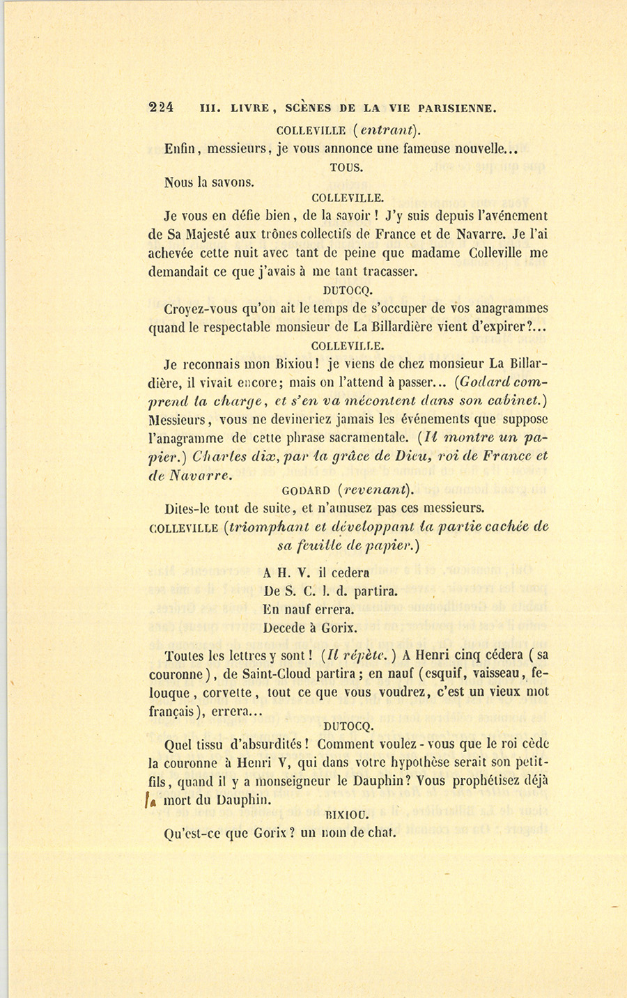 Vieillard ! vous vous trompez. J’ai voulu graver dans votre cerveau la plus vivante image possible du Gouvernement constitutionnel (tous les employés regardent Bixiou, Poiret stupéfait le contemple dans une sorte d’inquiétude) et vous tenir ainsi ma parole. J’ai pris la manière parabolique des Sauvages. (Écoutez !) Pendant que les ministres établissent à la Chambre des colloques à peu près aussi concluants, aussi utiles que le nôtre, l’Administration coupe des boutons aux contribuables.