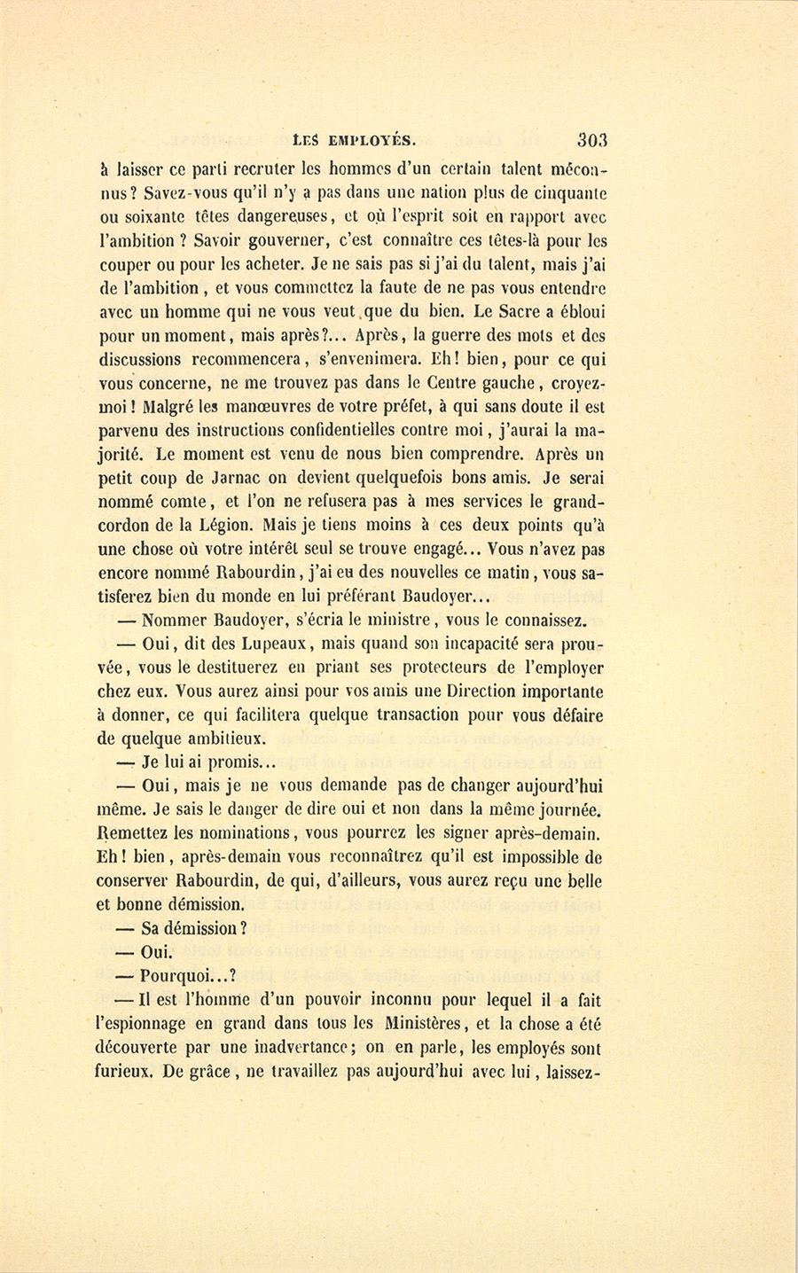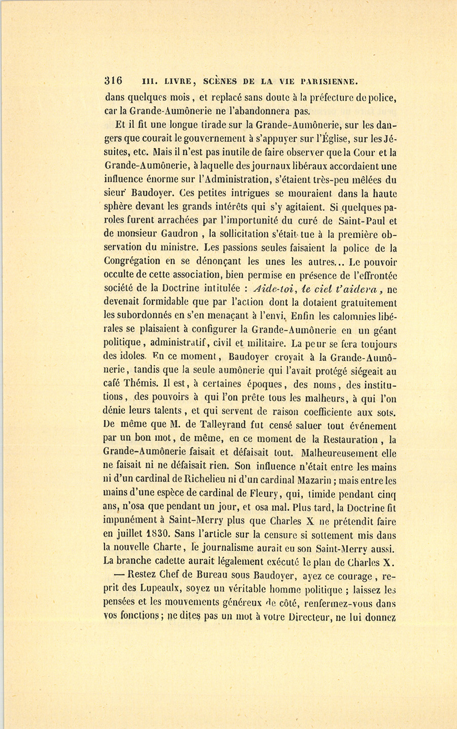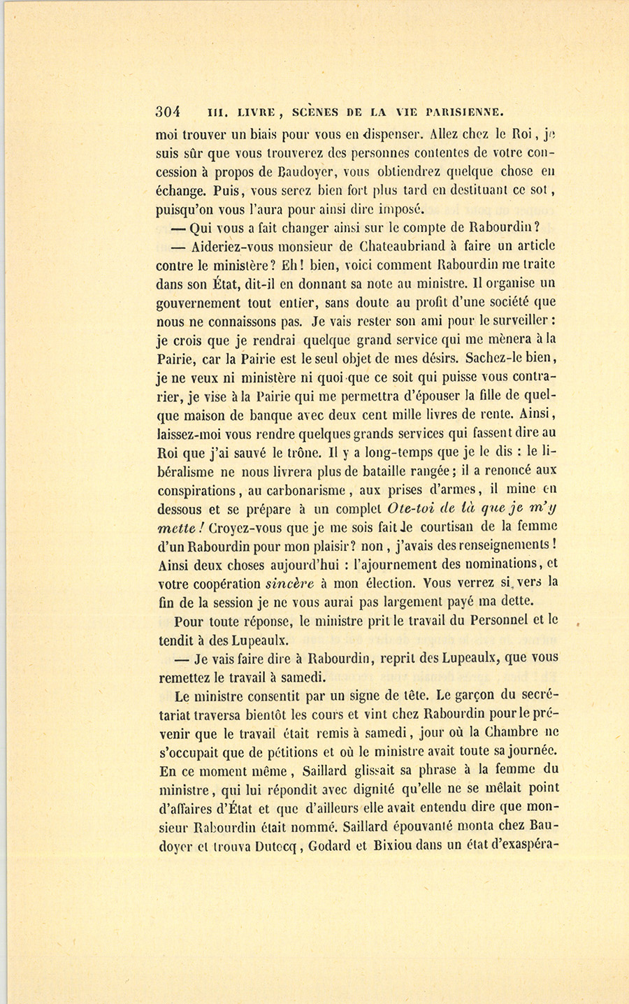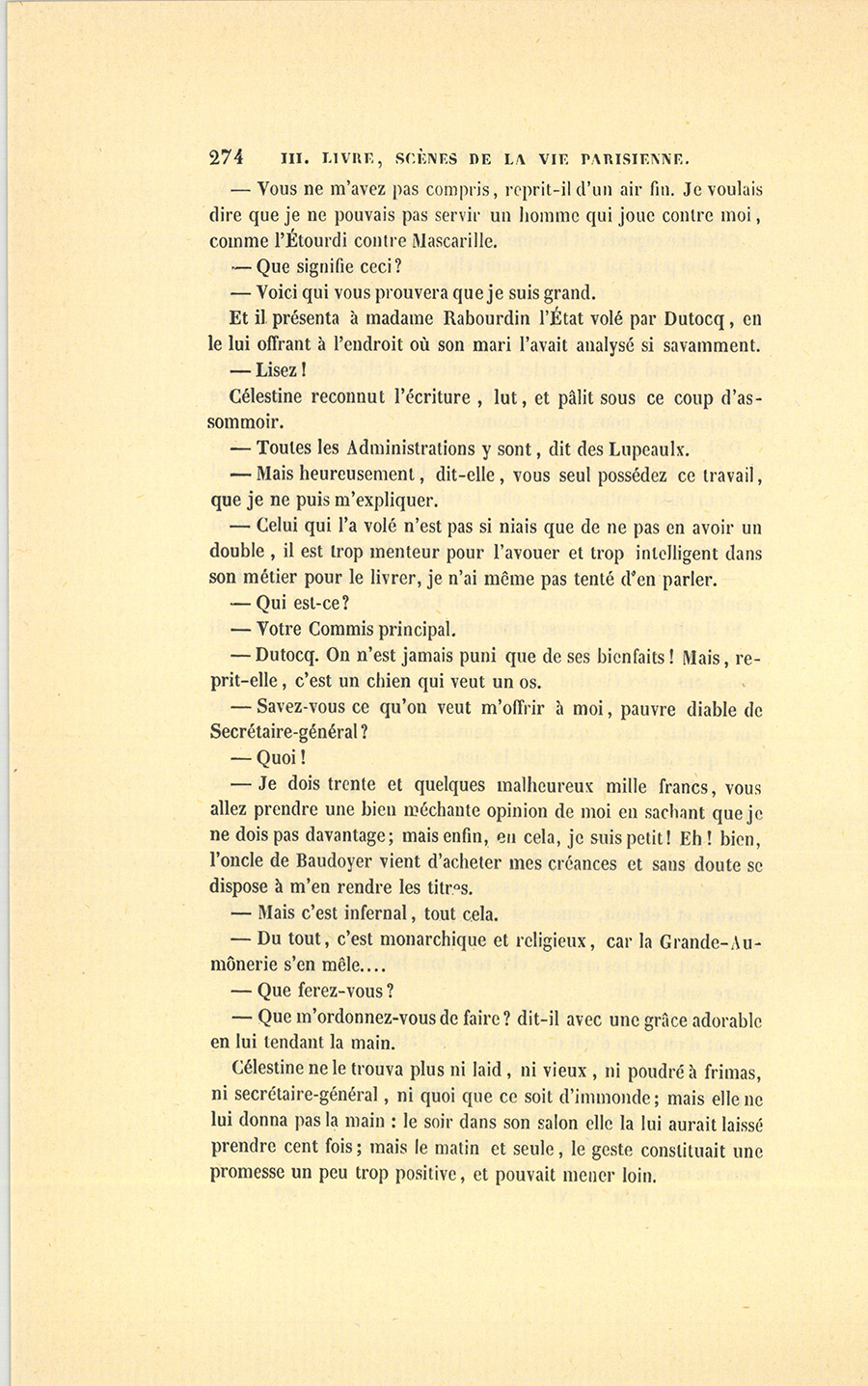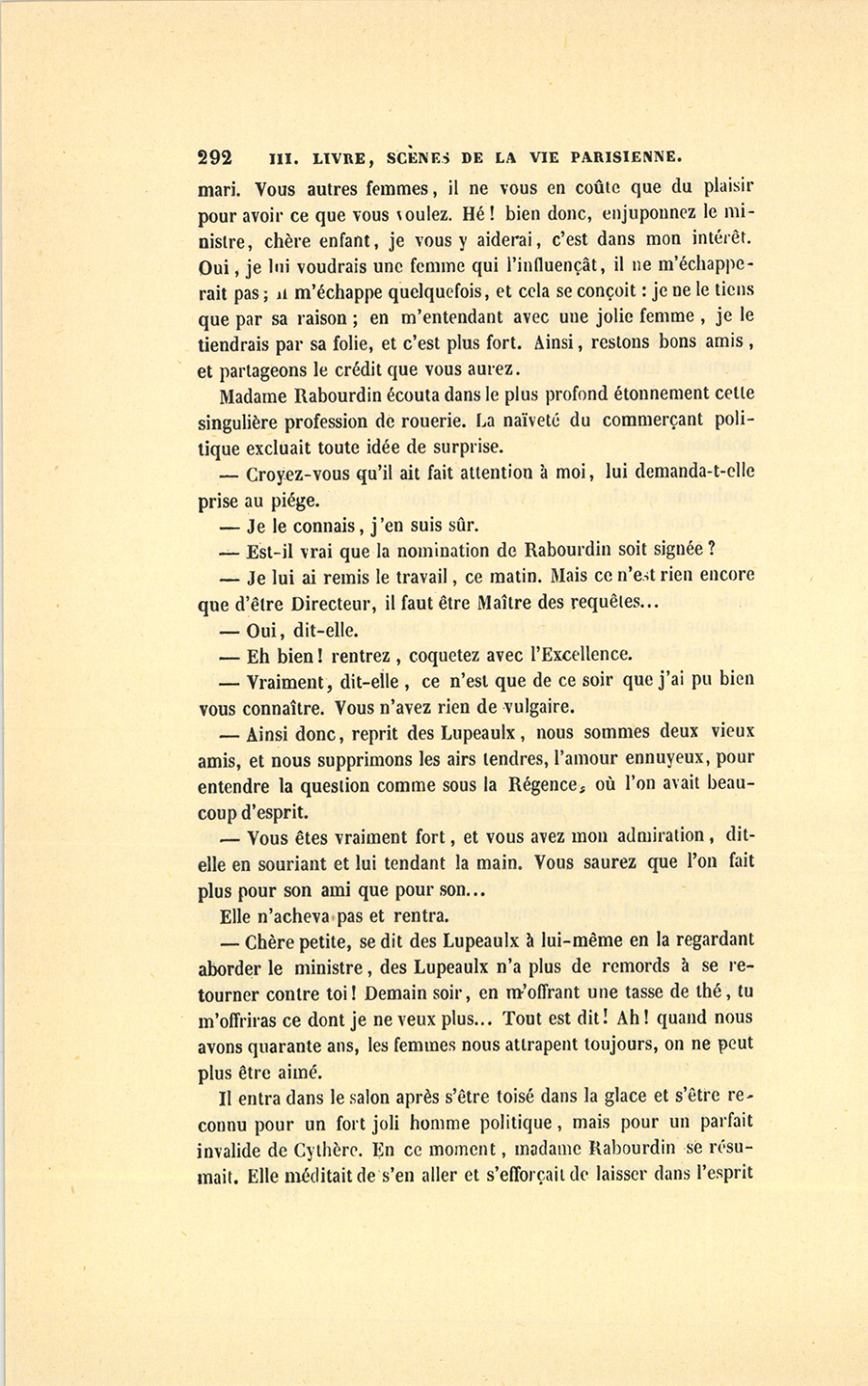 – Attendez ! dit l’Excellence en laissant son secrétaire particulier et prenant le bras de des Lupeaulx avec qui il alla dans l’embrasure de la fenêtre. Mon cher, laissez-moi cet arrondissement, vous serez nommé comte, et je paie vos dettes… Enfin, si, après {p. 334} le renouvellement de la Chambre, je reste aux affaires, je trouverai l’occasion de vous faire nommer pair de France dans une fournée.