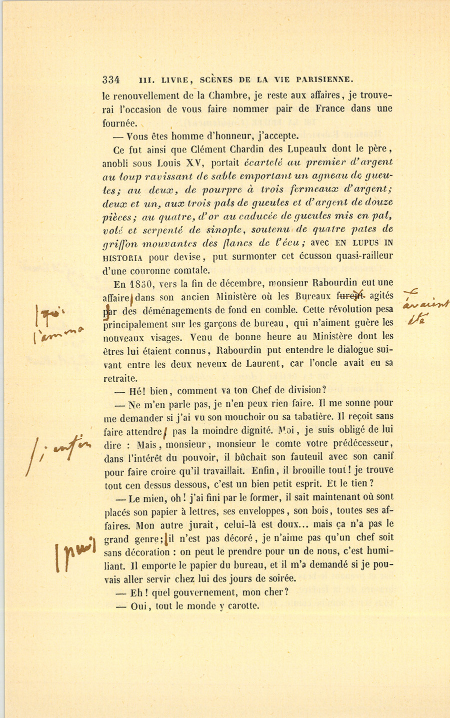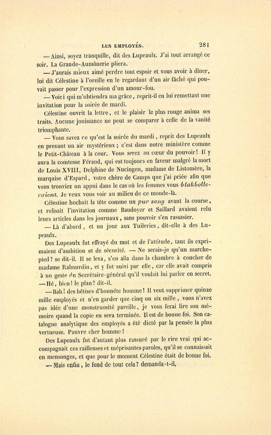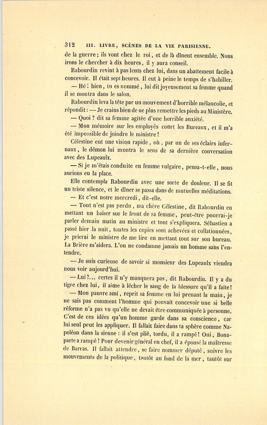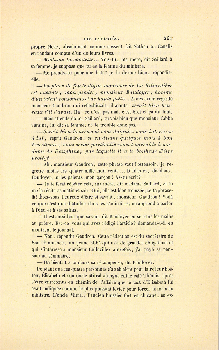 – Attendez ! dit l’Excellence en laissant son secrétaire particulier et prenant le bras de des Lupeaulx avec qui il alla dans l’embrasure de la fenêtre. Mon cher, laissez-moi cet arrondissement, vous serez nommé comte, et je paie vos dettes… Enfin, si, après {p. 334} le renouvellement de la Chambre, je reste aux affaires, je trouverai l’occasion de vous faire nommer pair de France dans une fournée.