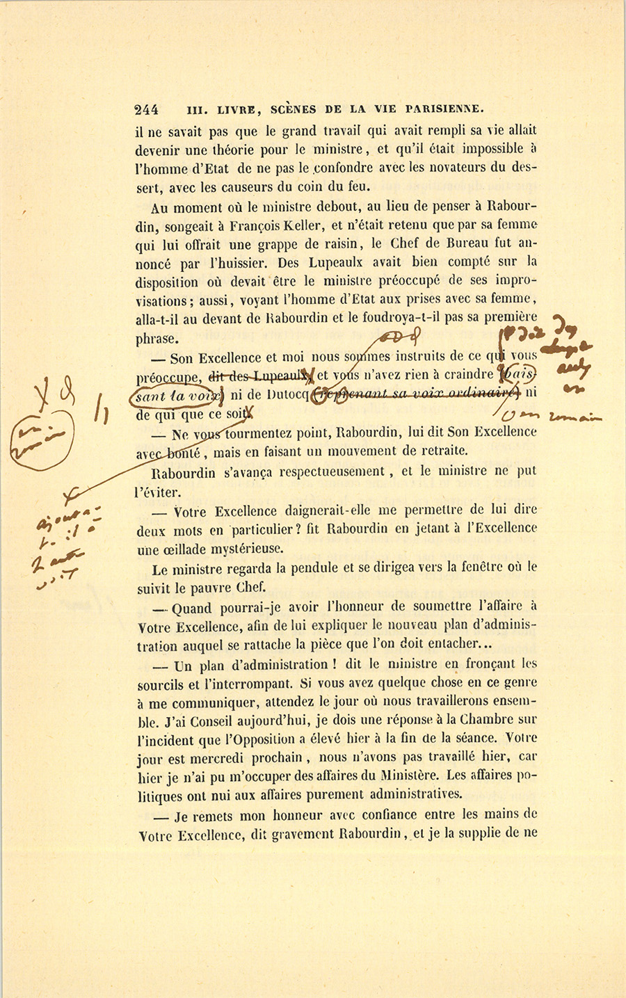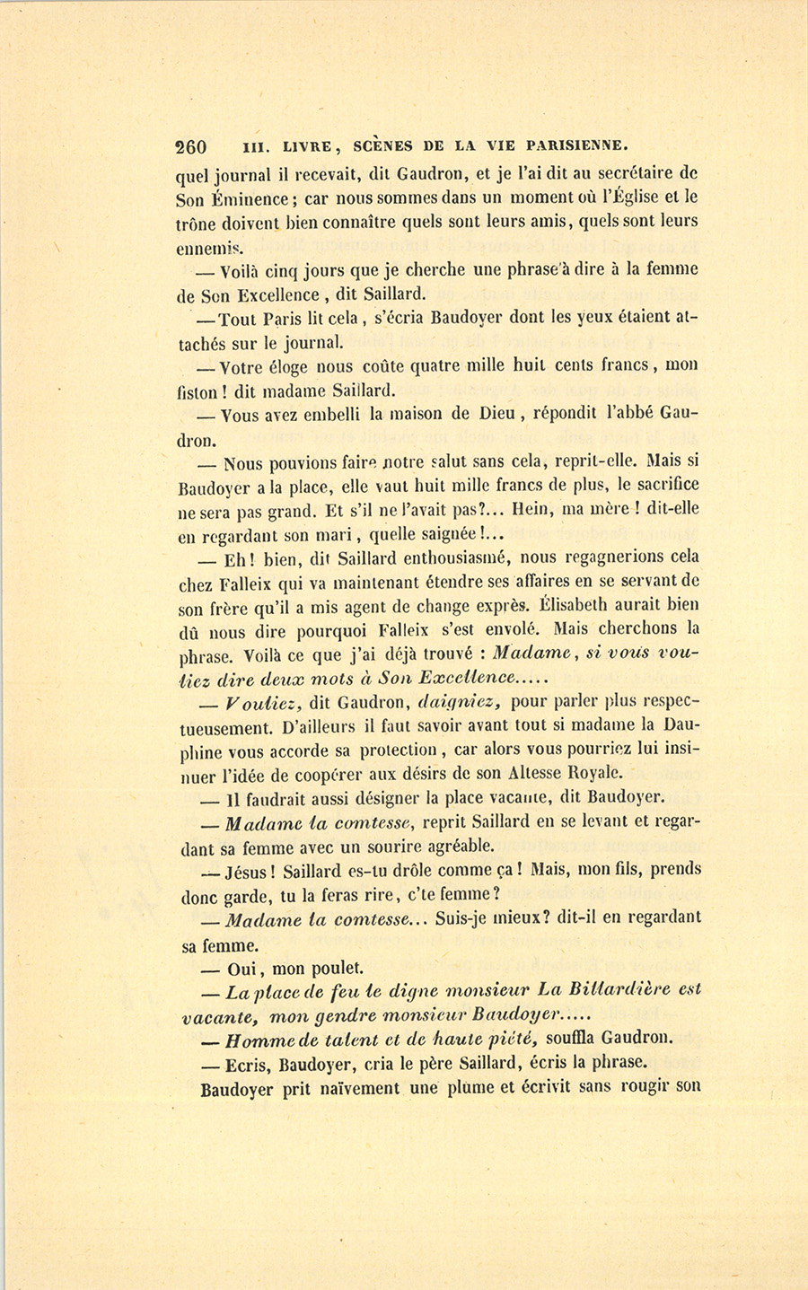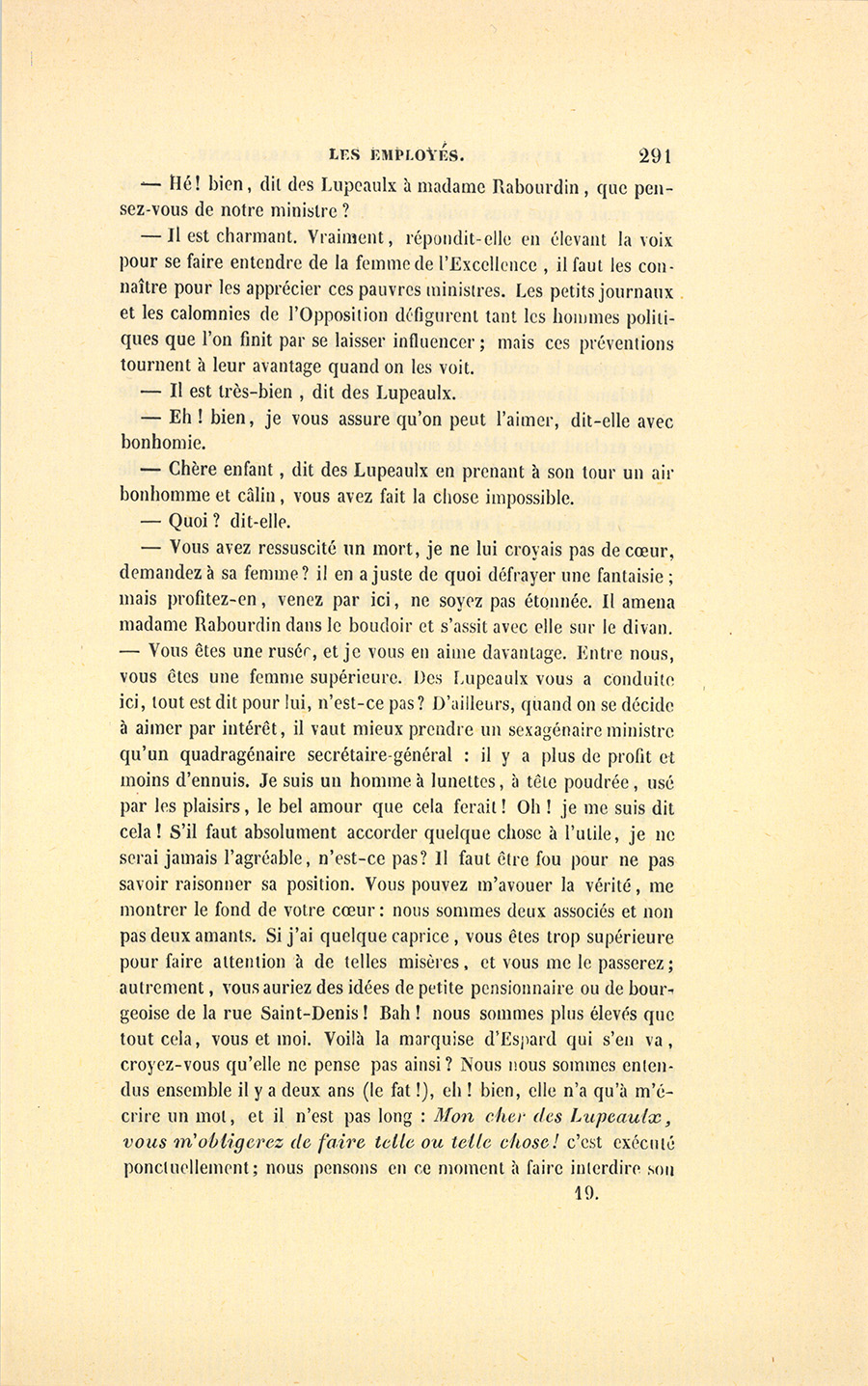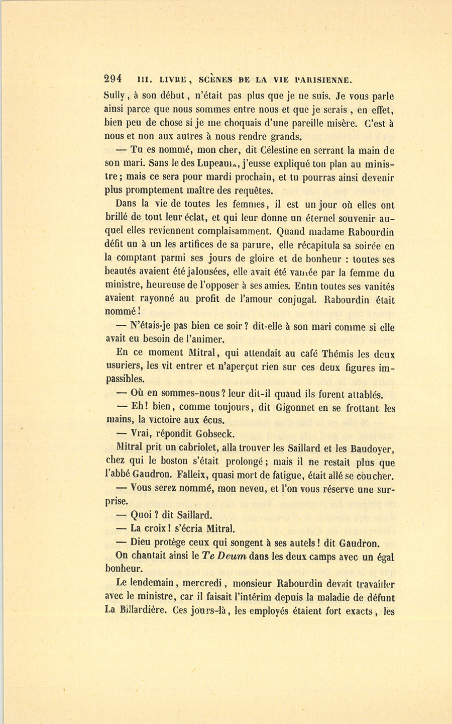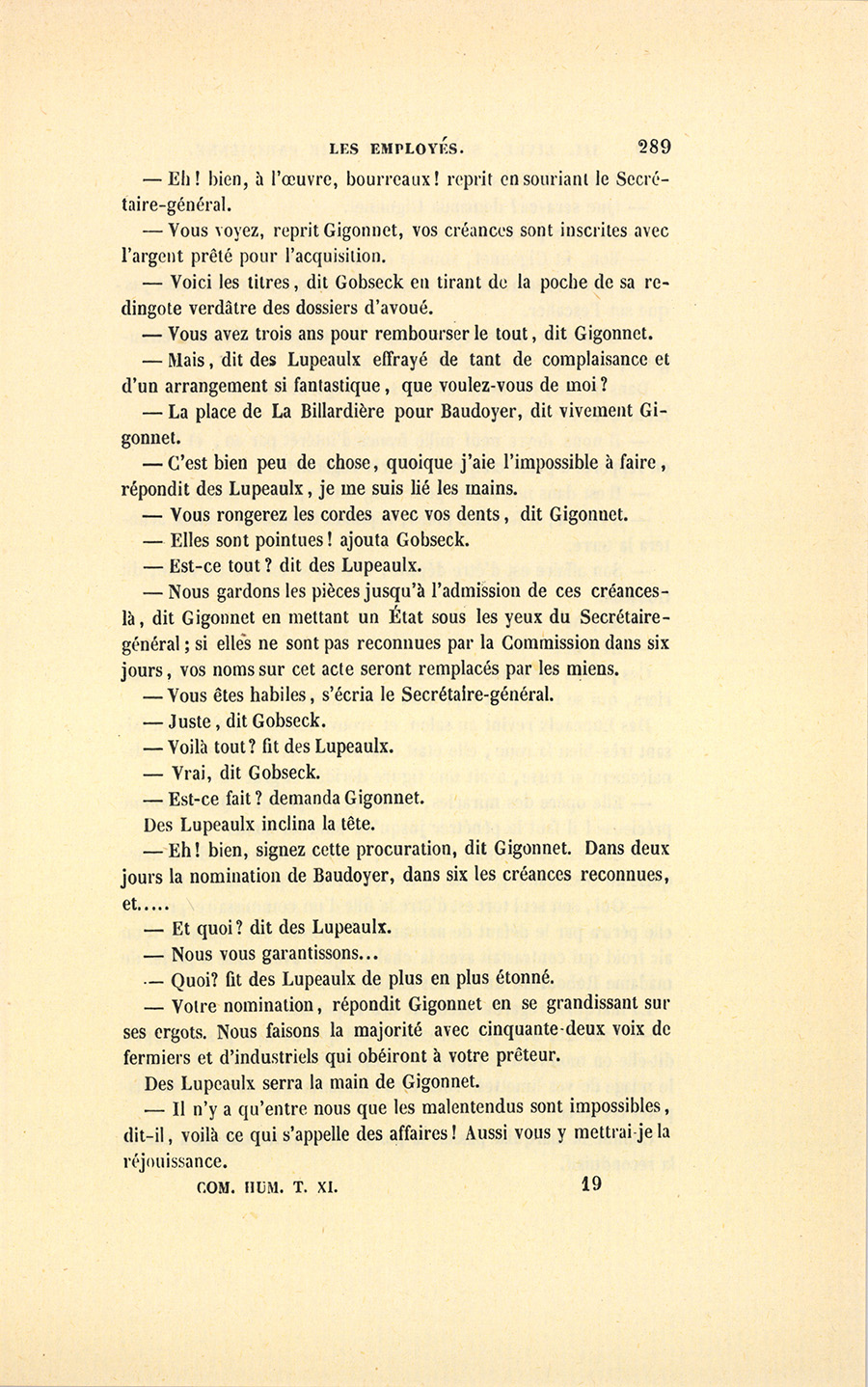 – Attendez ! dit l’Excellence en laissant son secrétaire particulier et prenant le bras de des Lupeaulx avec qui il alla dans l’embrasure de la fenêtre. Mon cher, laissez-moi cet arrondissement, vous serez nommé comte, et je paie vos dettes… Enfin, si, après {p. 334} le renouvellement de la Chambre, je reste aux affaires, je trouverai l’occasion de vous faire nommer pair de France dans une fournée.