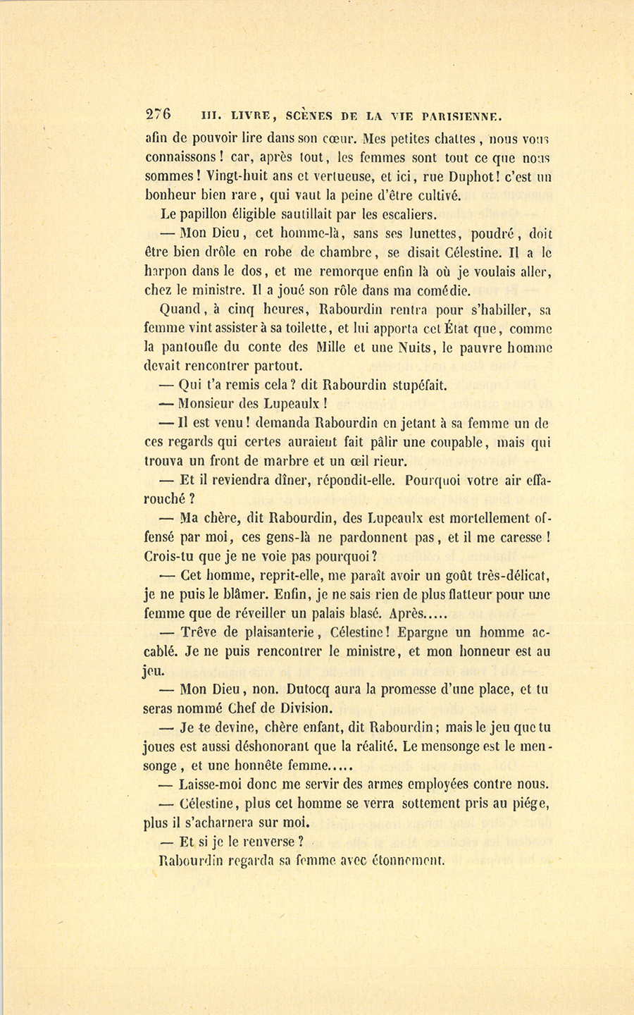 – Si la place de La Billardière est acquise à Rabourdin, je puis être cru quand je vante la supériorité de sa femme, répliqua des Lupeaulx en sentant l’ironie du ministre ; mais si madame la comtesse veut en juger par elle-même…