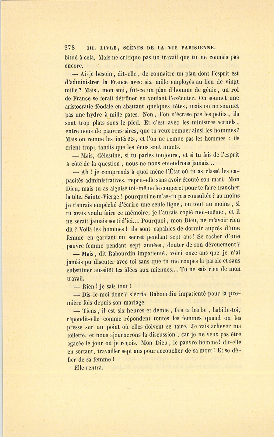Quand les rois eurent des ministres, ce qui n’a commencé que sous Louis XV, ils se firent faire des rapports sur les questions importantes, au lieu de tenir, comme autrefois, conseil avec les grands {p. 143} de l’État. Insensiblement, les ministres furent amenés par leurs Bureaux à imiter les rois. Occupés de se défendre devant les deux Chambres et devant la Cour, ils se laissèrent mener par les lisières du rapport. Il ne se présenta rien d’important dans l’administration, que le ministre, à la chose la plus urgente, ne répondît : – J’ai demandé un rapport. Le rapport devint ainsi, pour l’affaire et pour le ministre, ce qu’est le rapport à la Chambre des Députés pour les lois : une consultation où sont traitées les raisons contre et pour avec plus ou moins de partialité. Le ministre, de même que la Chambre, se trouve tout aussi avancé avant qu’après le rapport. Toute espèce de parti se prend en un instant. Quoi qu’on fasse, il faut arriver au moment où l’on se décide. Plus on met en bataille de raisons pour et de raisons contre, moins le jugement est sain. Les plus belles choses de la France se sont accomplies quand il n’existait pas de rapport et que les décisions étaient spontanées. La loi suprême de l’homme d’état est d’appliquer des formules précises à tous les cas, à la manière des juges et des médecins. Rabourdin, qui se disait : – « On est ministre pour avoir de la décision, connaître les affaires et les faire marcher », vit le rapport régnant en France depuis le colonel jusqu’au maréchal, depuis le commissaire de police jusqu’au roi, depuis les préfets jusqu’aux ministres, depuis la Chambre jusqu’à la loi. Dès 1818, tout commençait à se discuter, se balancer et se contre-balancer de vive voix et par écrit, tout prenait la forme littéraire. La France allait se ruiner malgré de si beaux rapports, et disserter au lieu d’agir. Il se faisait alors en France un million de rapports écrits par année ! Aussi la bureaucratie régnait-elle ! Les dossiers, les cartons, les paperasses à l’appui des pièces sans lesquelles la France serait perdue, la circulaire sans laquelle elle n’irait pas, s’accrurent et embellirent. La bureaucratie entretint dès lors à son profit la méfiance entre la recette et la dépense, elle calomnia l’administration pour le salut de l’administrateur. Enfin elle inventa les fils lilliputiens qui enchaînent la France à la centralisation parisienne, comme si, de 1500 à 1800, la France n’avait rien pu entreprendre sans trente mille commis. En s’attachant à la chose publique, comme le guy au poirier, l’employé s’en désintéressa complétement, et voici comme.