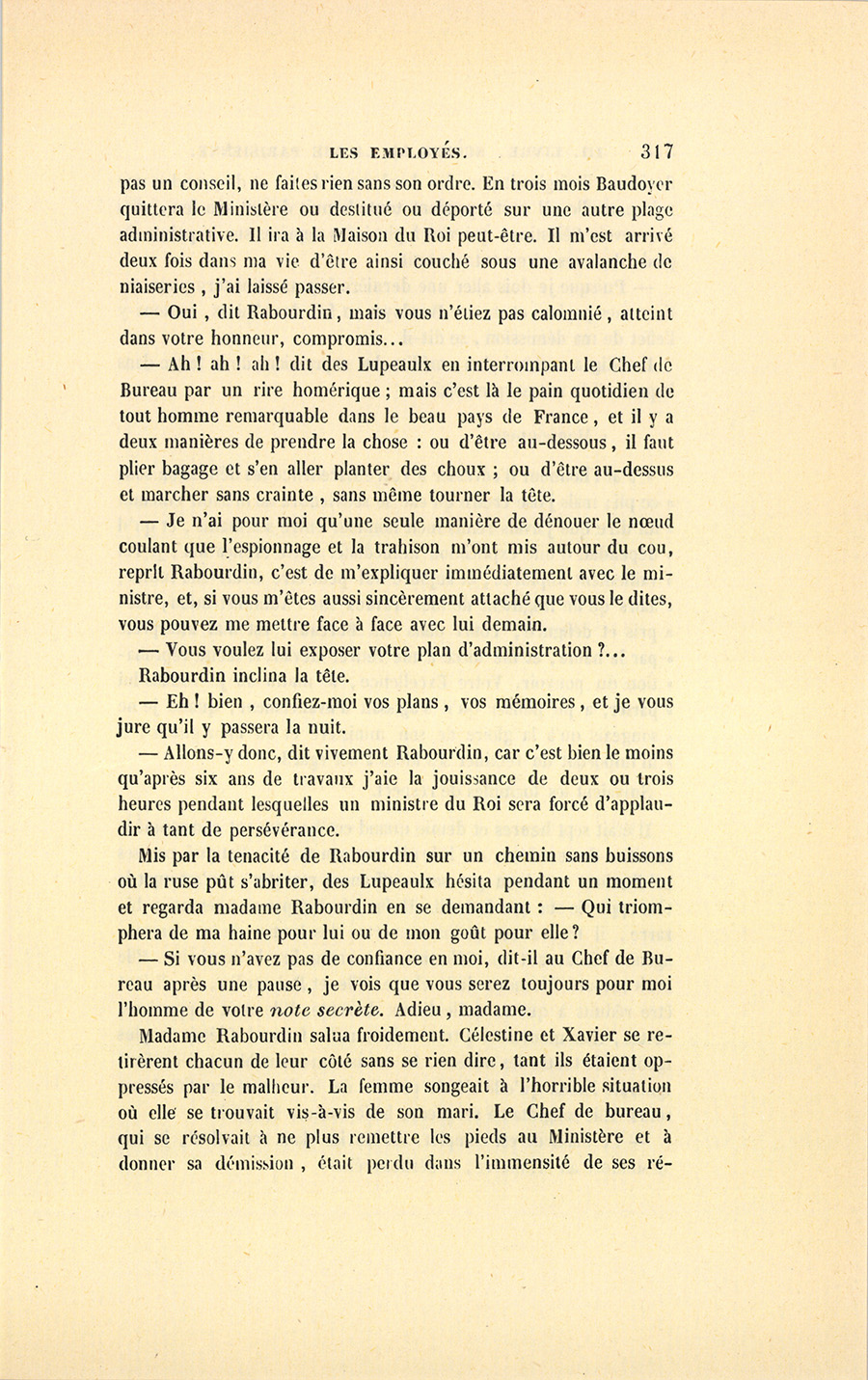 Il a tout brûlé, vous l’avez laissé déshonorer, il quitte l’Administration. Ne croyez pas, monseigneur, qu’il ait eu la sotte pensée, comme des Lupeaulx veut le faire croire, de rien changer à l’admirable centralisation du pouvoir.