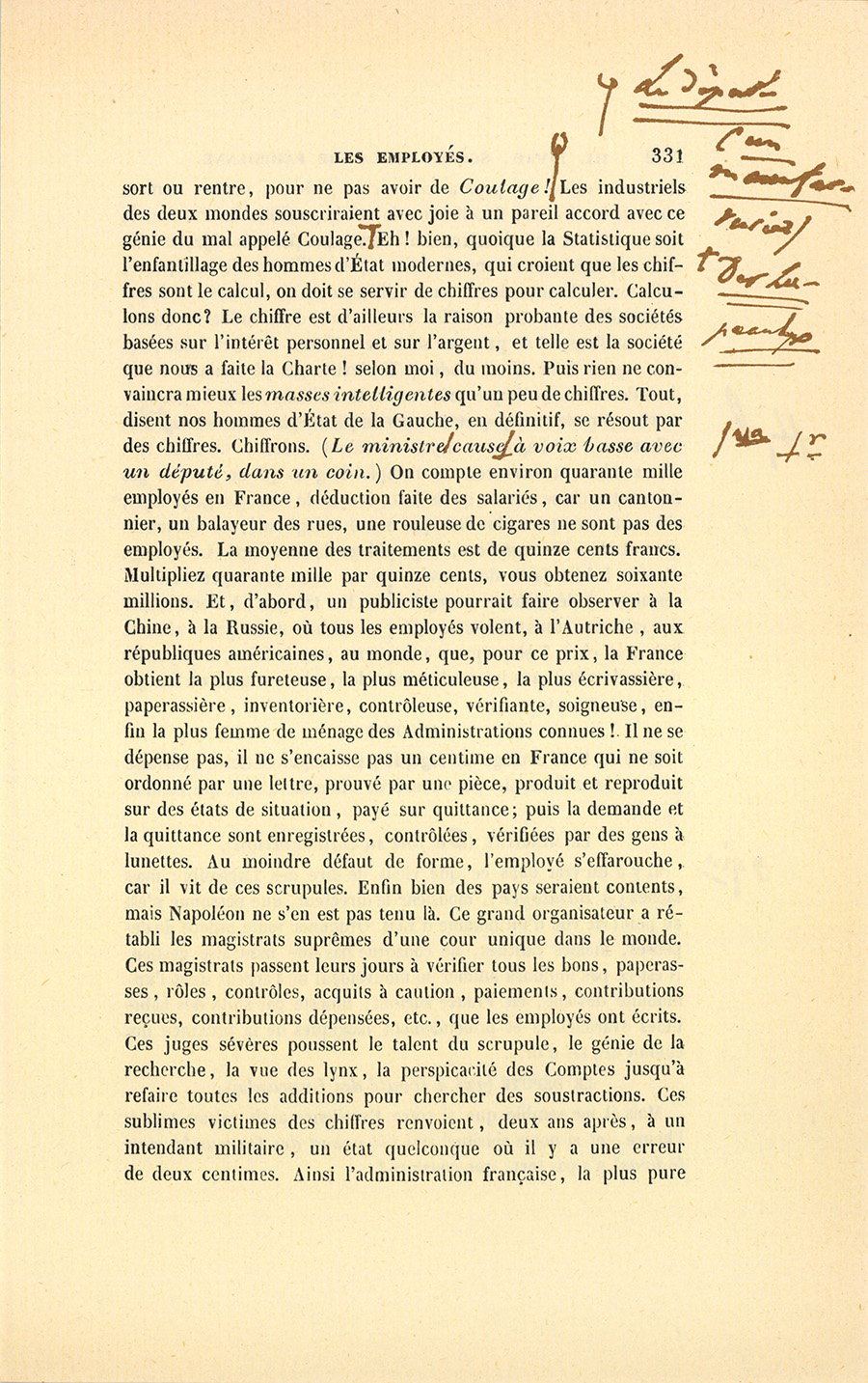 Eh ! bien, quoique la Statistique soit l’enfantillage des hommes d’État modernes, qui croient que les chiffres sont le calcul, on doit se servir de chiffres pour calculer. Calculons donc ? Le chiffre est d’ailleurs la raison probante des sociétés basées sur l’intérêt personnel et sur l’argent, et telle est la société que nous a faite la Charte ! selon moi, du moins. Puis rien ne convaincra mieux les masses intelligentes qu’un peu de chiffres. Tout, disent nos hommes d’État de la Gauche, en définitif, se résout par des chiffres. Chiffrons. (Le ministre va causer à voix basse avec un député, dans un coin.) On compte environ quarante mille employés en France, déduction faite des salariés, car un cantonnier, un balayeur des rues, une rouleuse de cigares ne sont pas des employés. La moyenne des traitements est de quinze cents francs. Multipliez quarante mille par quinze cents, vous obtenez soixante millions. Et, d’abord, un publiciste pourrait faire observer à la Chine, à la Russie, où tous les employés volent, à l’Autriche, aux républiques américaines, au monde, que, pour ce prix, la France obtient la plus fureteuse, la plus méticuleuse, la plus écrivassière, paperassière, inventorière, contrôleuse, vérifiante, soigneuse, enfin la plus femme de ménage des Administrations connues ! Il ne se dépense pas, il ne s’encaisse pas un centime en France qui ne soit ordonné par une lettre, prouvé par une pièce, produit et reproduit sur des états de situation, payé sur quittance ; puis la demande et la quittance sont enregistrées, contrôlées, vérifiées par des gens à lunettes. Au moindre défaut de forme, l’employé s’effarouche, car il vit de ces scrupules. Enfin bien des pays seraient contents, mais Napoléon ne s’en est pas tenu là. Ce grand organisateur a rétabli les magistrats suprêmes d’une cour unique dans le monde. Ces magistrats passent leurs jours à vérifier tous les bons, paperasses, rôles, contrôles, acquits à caution, paiements, contributions reçues, contributions dépensées, etc., que les employés ont écrits. Ces juges sévères poussent le talent du scrupule, le génie de la recherche, la vue des lynx, la perspicacité des Comptes jusqu’à refaire toutes les additions pour chercher des soustractions. Ces sublimes victimes des chiffres renvoient, deux ans après, à un intendant militaire, un état quelconque où il y a une erreur de deux centimes. Ainsi l’administration française, la plus pure {p. 332} de toutes celles qui paperassent sur le globe, a rendu, comme vient de le dire Son Excellence, le vol impossible. En France, la concussion est une chimère. Eh ! bien, que peut-on objecter ? La France possède un revenu de douze cents millions, elle le dépense, voilà tout. Il entre douze cents millions dans ses caisses, et douze cents millions en sortent. Elle manie donc deux milliards quatre cents millions, et ne paie que soixante millions, deux et demi pour cent, pour avoir la certitude qu’il n’existe pas de coulage. Notre livre de cuisine politique coûte soixante millions, mais la gendarmerie, les tribunaux, les bagnes et la police coûtent autant et ne nous font rien rendre. Et nous trouvons l’emploi de gens qui ne peuvent pas faire autre chose que ce qu’ils font, croyez-le bien. Le gaspillage, s’il y en a, ne peut plus être que moral et législatif, les Chambres en sont alors les complices, le gaspillage devient légal. Le coulage consiste à faire faire des travaux qui ne sont pas urgents ou nécessaires, à dégalonner et regalonner les troupes, à commander des vaisseaux sans s’inquiéter s’il y a du bois et de payer alors le bois trop cher, à se préparer à la guerre sans la faire, à payer les dettes d’un État sans lui en demander le remboursement ou des garanties, etc., etc.