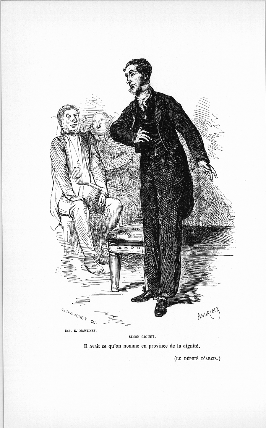 Ce jeune homme maigre, au teint bilieux, d’une taille assez élevée pour justifier sa nullité sonore, car il est rare qu’un homme de haute taille ait de grandes capacités, outrait le puritanisme des gens de l’extrême-gauche, déjà tous si affectés à la manière des prudes qui ont des intrigues à cacher. Toujours vêtu de noir, il portait une cravate blanche qu’il laissait descendre au bas de son cou. Aussi sa figure semblait-elle être dans un cornet de papier blanc, car il conservait ce col de chemise haut et empesé que la mode a fort heureusement proscrit. Son pantalon, ses habits paraissaient toujours être trop larges. [ill.] Il avait ce qu’on nomme en province de la dignité, c’est-à-dire qu’il se tenait roide et qu’il était ennuyeux ; Antonin Goulard, son ami, l’accusait de singer monsieur Dupin. En effet, [F02-g] l’avocat se chaussait un peu trop de souliers et de gros bas en filoselle noire.
