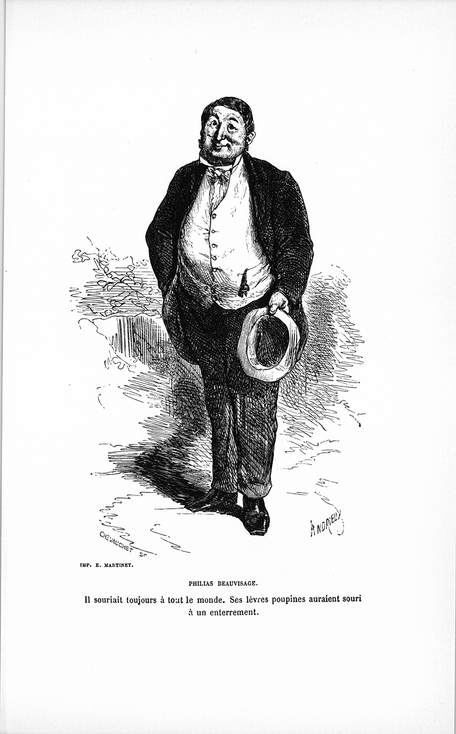 Philéas Beauvisage était doué d’un si grand contentement de lui-même, qu’il souriait toujours à tout le monde, dans toutes les circonstances. Ses lèvres poupines auraient souri à un enterrement. La vie qui abondait dans ses yeux bleus et enfantins ne démentait pas ce perpétuel et insupportable sourire. [ill.]