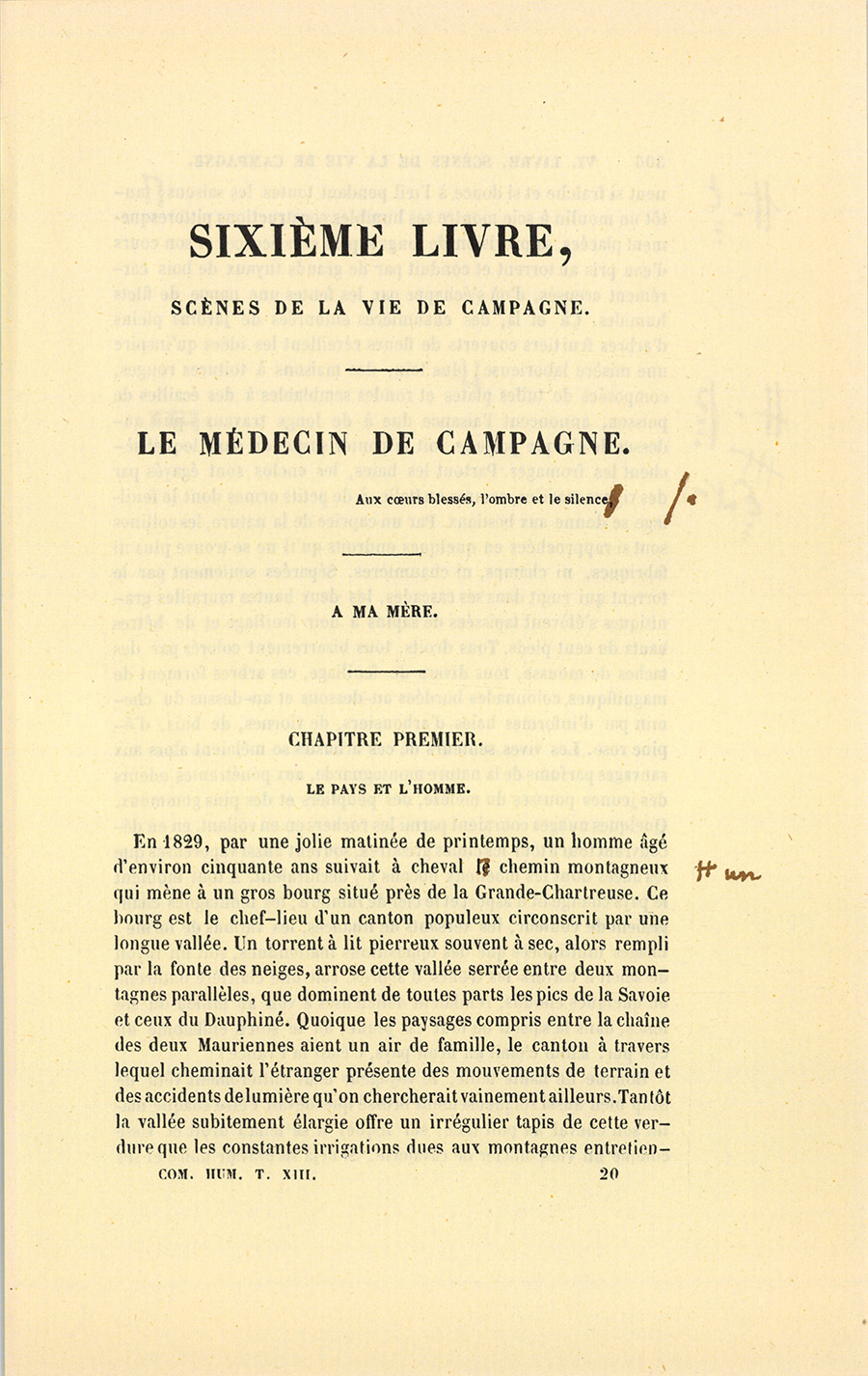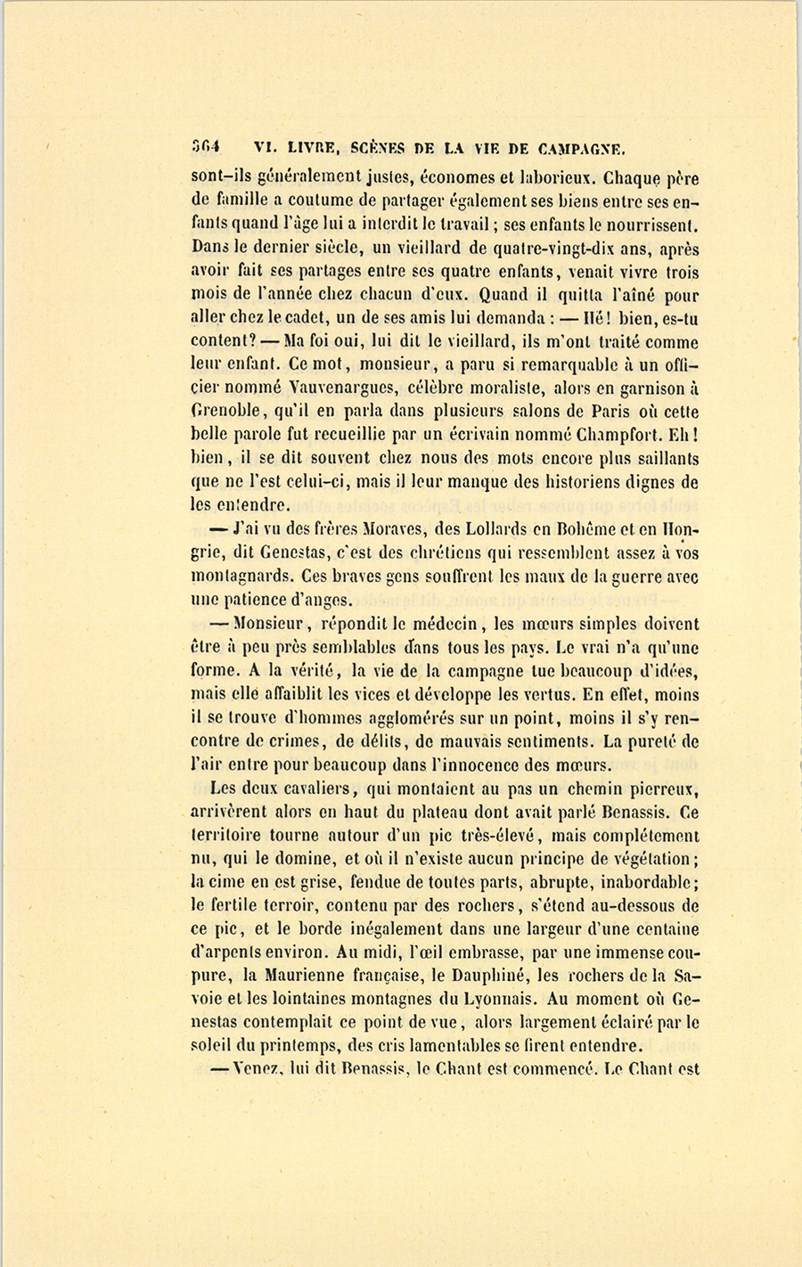 En 1829, par une jolie matinée de printemps, un homme âgé d’environ cinquante ans suivait à cheval un chemin montagneux qui mène à un gros bourg situé près de la Grande-Chartreuse. Ce bourg est le chef-lieu d’un canton populeux circonscrit par une longue vallée. Un torrent à lit pierreux souvent à sec, alors rempli par la fonte des neiges, arrose cette vallée serrée entre deux montagnes parallèles, que dominent de toutes parts les pics de la Savoie et ceux du Dauphiné. Quoique les paysages compris entre la chaîne des deux Mauriennes aient un air de famille, le canton à travers lequel cheminait l’étranger présente des mouvements de terrain et des accidents de lumière qu’on chercherait vainement ailleurs. Tantôt la vallée subitement élargie offre un irrégulier tapis de cette verdure que les constantes irrigations dues aux montagnes {p. 306} entretiennent si fraîche et si douce à l’œil pendant toutes les saisons. Tantôt un moulin à scie montre ses humbles constructions pittoresquement placées, sa provision de longs sapins sans écorce, et son cours d’eau pris au torrent et conduit par de grands tuyaux de bois carrément creusés, d’où s’échappe par les fentes une nappe de filets humides. Çà et là, des chaumières entourées de jardins pleins d’arbres fruitiers couverts de fleurs réveillent les idées qu’inspire une misère laborieuse. Plus loin, des maisons à toitures rouges, composées de tuiles plates et rondes semblables à des écailles de poisson, annoncent l’aisance due à de longs travaux. Enfin au-dessus de chaque porte se voit le panier suspendu dans lequel sèchent les fromages. Partout les haies, les enclos sont égayés par des vignes mariées, comme en Italie, à de petits ormes dont le feuillage se donne aux bestiaux. Par un caprice de la nature, les collines sont si rapprochées en quelques endroits qu’il ne se trouve plus ni fabriques, ni champs, ni chaumières. Séparées seulement par le torrent qui rugit dans ses cascades, les deux hautes murailles granitiques s’élèvent tapissées de sapins à noir feuillage et de hêtres hauts de cent pieds. Tous droits, tous bizarrement colorés par des taches de mousse, tous divers de feuillage, ces arbres forment de magnifiques colonnades bordées au-dessous et au-dessus du chemin par d’informes haies d’arbousiers, de viornes, de buis, d’épine rose. Les vives senteurs de ces arbustes se mêlaient alors aux sauvages parfums de la nature montagnarde, aux pénétrantes odeurs des jeunes pousses du mélèze, des peupliers et des pins gommeux. Quelques nuages couraient parmi les rochers en en voilant, en en découvrant tour à tour les cimes grisâtres, souvent aussi vaporeuses que les nuées dont les moelleux flocons s’y déchiraient. À tout moment le pays changeait d’aspect et le ciel de lumière ; les montagnes changeaient de couleur, les versants de nuances, les vallons de forme : images multipliées que des oppositions inattendues, soit un rayon de soleil à travers les troncs d’arbres, soit une clairière naturelle ou quelques éboulis, rendaient délicieuses à voir au milieu du silence, dans la saison où tout est jeune, où le soleil enflamme un ciel pur. Enfin c’était un beau pays, c’était la France !