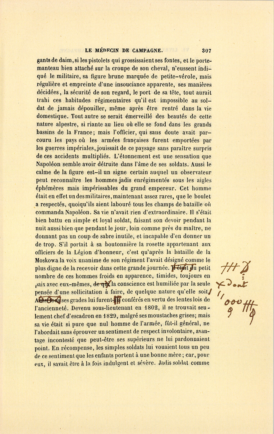 Homme de haute taille, le voyageur était entièrement vêtu de drap bleu aussi soigneusement brossé que devait l’être chaque matin son cheval au poil lisse, sur lequel il se tenait droit et vissé comme un vieil officier de cavalerie. Si déjà sa cravate noire et ses {p. 307} gants de daim, si les pistolets qui grossissaient ses fontes, et le portemanteau bien attaché sur la croupe de son cheval, n’eussent indiqué le militaire, sa figure brune marquée de petite-vérole, mais régulière et empreinte d’une insouciance apparente, ses manières décidées, la sécurité de son regard, le port de sa tête, tout aurait trahi ces habitudes régimentaires qu’il est impossible au soldat de jamais dépouiller, même après être rentré dans la vie domestique. Tout autre se serait émerveillé des beautés de cette nature alpestre, si riante au lieu où elle se fond dans les grands bassins de la France ; mais l’officier, qui sans doute avait parcouru les pays où les armées françaises furent emportées par les guerres impériales, jouissait de ce paysage sans paraître surpris de ces accidents multipliés. L’étonnement est une sensation que Napoléon semble avoir détruite dans l’âme de ses soldats. Aussi le calme de la figure est-il un signe certain auquel un observateur peut reconnaître les hommes jadis enrégimentés sous les aigles éphémères mais impérissables du grand empereur. Cet homme était en effet un des militaires, maintenant assez rares, que le boulet a respectés, quoiqu’ils aient labouré tous les champs de bataille où commanda Napoléon. Sa vie n’avait rien d’extraordinaire. Il s’était bien battu en simple et loyal soldat, faisant son devoir pendant la nuit aussi bien que pendant le jour, loin comme près du maître, ne donnant pas un coup de sabre inutile, et incapable d’en donner un de trop. S’il portait à sa boutonnière la rosette appartenant aux officiers de la Légion d’honneur, c’est qu’après la bataille de la Moskowa la voix unanime de son régiment l’avait désigné comme le plus digne de la recevoir dans cette grande journée. Du petit nombre de ces hommes froids en apparence, timides, toujours en paix avec eux-mêmes, dont la conscience est humiliée par la seule pensée d’une sollicitation à faire, de quelque nature qu’elle soit, ses grades lui furent conférés en vertu des lentes lois de l’ancienneté. Devenu sous-lieutenant en 1802, il se trouvait seulement chef d’escadron en 1829, malgré ses moustaches grises ; mais sa vie était si pure que nul homme de l’armée, fût-il général, ne l’abordait sans éprouver un sentiment de respect involontaire, avantage incontesté que peut-être ses supérieurs ne lui pardonnaient point. En récompense, les simples soldats lui vouaient tous un peu de ce sentiment que les enfants portent à une bonne mère ; car, pour eux, il savait être à la fois indulgent et sévère. Jadis soldat comme {p. 308} eux, il connaissait les joies malheureuses et les joyeuses misères, les écarts pardonnables ou punissables des soldats qu’il appelait toujours ses enfants, et auxquels il laissait volontiers prendre en campagne des vivres ou des fourrages chez les bourgeois. Quant à son histoire intime, elle était ensevelie dans le plus profond silence. Comme presque tous les militaires de l’époque, il n’avait vu le monde qu’à travers la fumée des canons, ou pendant les moments de paix si rares au milieu de la lutte européenne soutenue par l’empereur. S’était-il ou non soucié du mariage ? la question restait indécise. Quoique personne ne mît en doute que le commandant Genestas n’eût eu des bonnes fortunes en séjournant de ville en ville, de pays en pays, en assistant aux fêtes données et reçues par les régiments, cependant personne n’en avait la moindre certitude. Sans être prude, sans refuser une partie de plaisir, sans froisser les mœurs militaires, il se taisait ou répondait en riant lorsqu’il était questionné sur ses amours. À ces mots : – Et vous, mon commandant ? adressés par un officier après boire, il répliquait : – Buvons, messieurs !