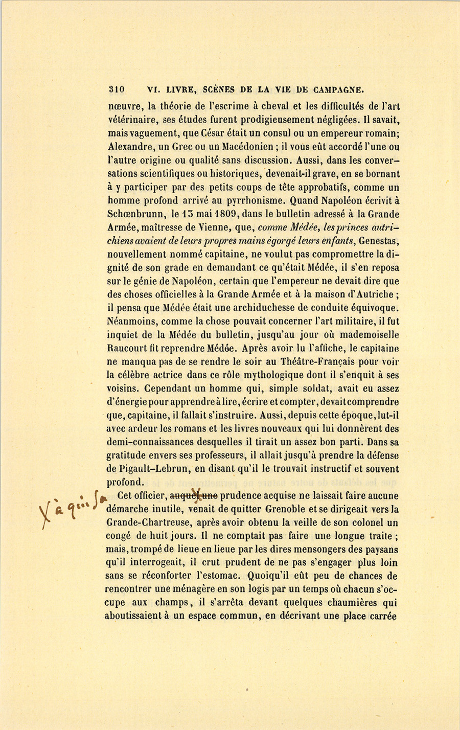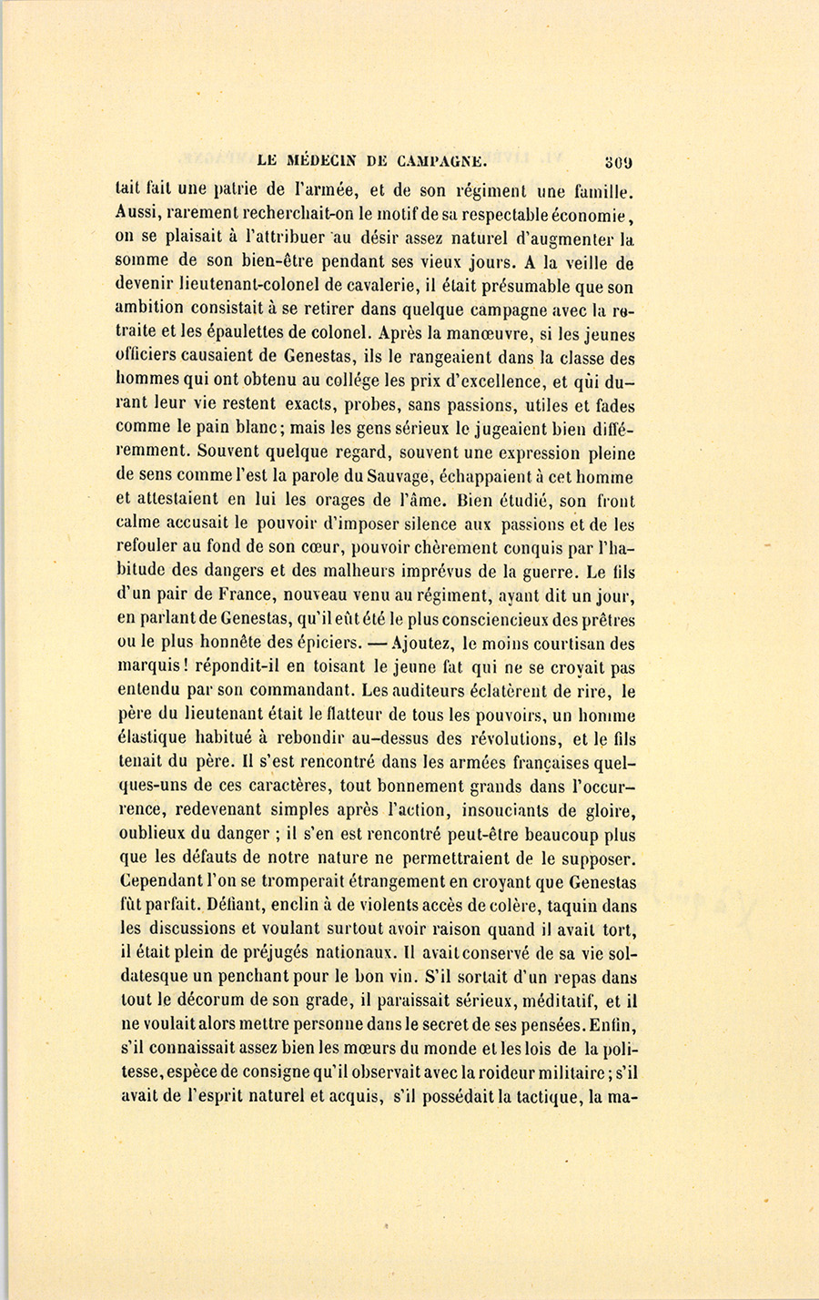 Espèce de Bayard sans faste, monsieur Pierre-Joseph Genestas n’offrait donc en lui rien de poétique ni rien de romanesque, tant il paraissait vulgaire. Sa tenue était celle d’un homme cossu. Quoiqu’il n’eût que sa solde pour fortune, et que sa retraite fût tout son avenir ; néanmoins, semblable aux vieux loups du commerce auxquels les malheurs ont fait une expérience qui avoisine l’entêtement, le chef d’escadron gardait toujours devant lui deux années de solde et ne dépensait jamais ses appointements. Il était si peu joueur, qu’il regardait sa botte quand en compagnie on demandait un rentrant ou quelque supplément de pari pour l’écarté. Mais s’il ne se permettait rien d’extraordinaire, il ne manquait à aucune chose d’usage. Ses uniformes lui duraient plus longtemps qu’à tout autre officier du régiment, par suite des soins qu’inspire la médiocrité de fortune, et dont l’habitude était devenue chez lui machinale. Peut-être l’eût-on soupçonné d’avarice sans l’admirable désintéressement, sans la facilité fraternelle avec lesquels il ouvrait sa bourse à quelque jeune étourdi ruiné par un coup de carte ou par toute autre folie. Il semblait avoir perdu jadis de grosses sommes au jeu, tant il mettait de délicatesse à obliger ; il ne se croyait point le droit de contrôler les actions de son débiteur et ne lui parlait jamais de sa créance. Enfant de troupe, seul dans le monde, il {p. 309} s’était fait une patrie de l’armée, et de son régiment une famille. Aussi, rarement recherchait-on le motif de sa respectable économie, on se plaisait à l’attribuer au désir assez naturel d’augmenter la somme de son bien-être pendant ses vieux jours. À la veille de devenir lieutenant-colonel de cavalerie, il était présumable que son ambition consistait à se retirer dans quelque campagne avec la retraite et les épaulettes de colonel. Après la manœuvre, si les jeunes officiers causaient de Genestas, ils le rangeaient dans la classe des hommes qui ont obtenu au collége les prix d’excellence, et qui durant leur vie restent exacts, probes, sans passions, utiles et fades comme le pain blanc ; mais les gens sérieux le jugeaient bien différemment. Souvent quelque regard, souvent une expression pleine de sens comme l’est la parole du Sauvage, échappaient à cet homme et attestaient en lui les orages de l’âme. Bien étudié, son front calme accusait le pouvoir d’imposer silence aux passions et de les refouler au fond de son cœur, pouvoir chèrement conquis par l’habitude des dangers et des malheurs imprévus de la guerre. Le fils d’un pair de France, nouveau venu au régiment, ayant dit un jour, en parlant de Genestas, qu’il eût été le plus consciencieux des prêtres ou le plus honnête des épiciers. – Ajoutez, le moins courtisan des marquis ! répondit-il en toisant le jeune fat qui ne se croyait pas entendu par son commandant. Les auditeurs éclatèrent de rire, le père du lieutenant était le flatteur de tous les pouvoirs, un homme élastique habitué à rebondir au-dessus des révolutions, et le fils tenait du père. Il s’est rencontré dans les armées françaises quelques-uns de ces caractères, tout bonnement grands dans l’occurrence, redevenant simples après l’action, insouciants de gloire, oublieux du danger ; il s’en est rencontré peut-être beaucoup plus que les défauts de notre nature ne permettraient de le supposer. Cependant l’on se tromperait étrangement en croyant que Genestas fût parfait. Défiant, enclin à de violents accès de colère, taquin dans les discussions et voulant surtout avoir raison quand il avait tort, il était plein de préjugés nationaux. Il avait conservé de sa vie soldatesque un penchant pour le bon vin. S’il sortait d’un repas dans tout le décorum de son grade, il paraissait sérieux, méditatif, et il ne voulait alors mettre personne dans le secret de ses pensées. Enfin, s’il connaissait assez bien les mœurs du monde et les lois de la politesse, espèce de consigne qu’il observait avec la roideur militaire ; s’il avait de l’esprit naturel et acquis, s’il possédait la tactique, la {p. 310} manœuvre, la théorie de l’escrime à cheval et les difficultés de l’art vétérinaire, ses études furent prodigieusement négligées. Il savait, mais vaguement, que César était un consul ou un empereur romain ; Alexandre, un Grec ou un Macédonien ; il vous eût accordé l’une ou l’autre origine ou qualité sans discussion. Aussi, dans les conversations scientifiques ou historiques, devenait-il grave, en se bornant à y participer par des petits coups de tête approbatifs, comme un homme profond arrivé au pyrrhonisme. Quand Napoléon écrivit à Schœnbrunn, le 13 mai 1809, dans le bulletin adressé à la Grande Armée, maîtresse de Vienne, que, comme Médée, les princes autrichiens avaient de leurs propres mains égorgé leurs enfants, Genestas, nouvellement nommé capitaine, ne voulut pas compromettre la dignité de son grade en demandant ce qu’était Médée, il s’en reposa sur le génie de Napoléon, certain que l’empereur ne devait dire que des choses officielles à la Grande Armée et à la maison d’Autriche ; il pensa que Médée était une archiduchesse de conduite équivoque. Néanmoins, comme la chose pouvait concerner l’art militaire, il fut inquiet de la Médée du bulletin, jusqu’au jour où mademoiselle Raucourt fit reprendre Médée. Après avoir lu l’affiche, le capitaine ne manqua pas de se rendre le soir au Théâtre-Français pour voir la célèbre actrice dans ce rôle mythologique dont il s’enquit à ses voisins. Cependant un homme qui, simple soldat, avait eu assez d’énergie pour apprendre à lire, écrire et compter, devait comprendre que, capitaine, il fallait s’instruire. Aussi, depuis cette époque, lut-il avec ardeur les romans et les livres nouveaux qui lui donnèrent des demi-connaiss