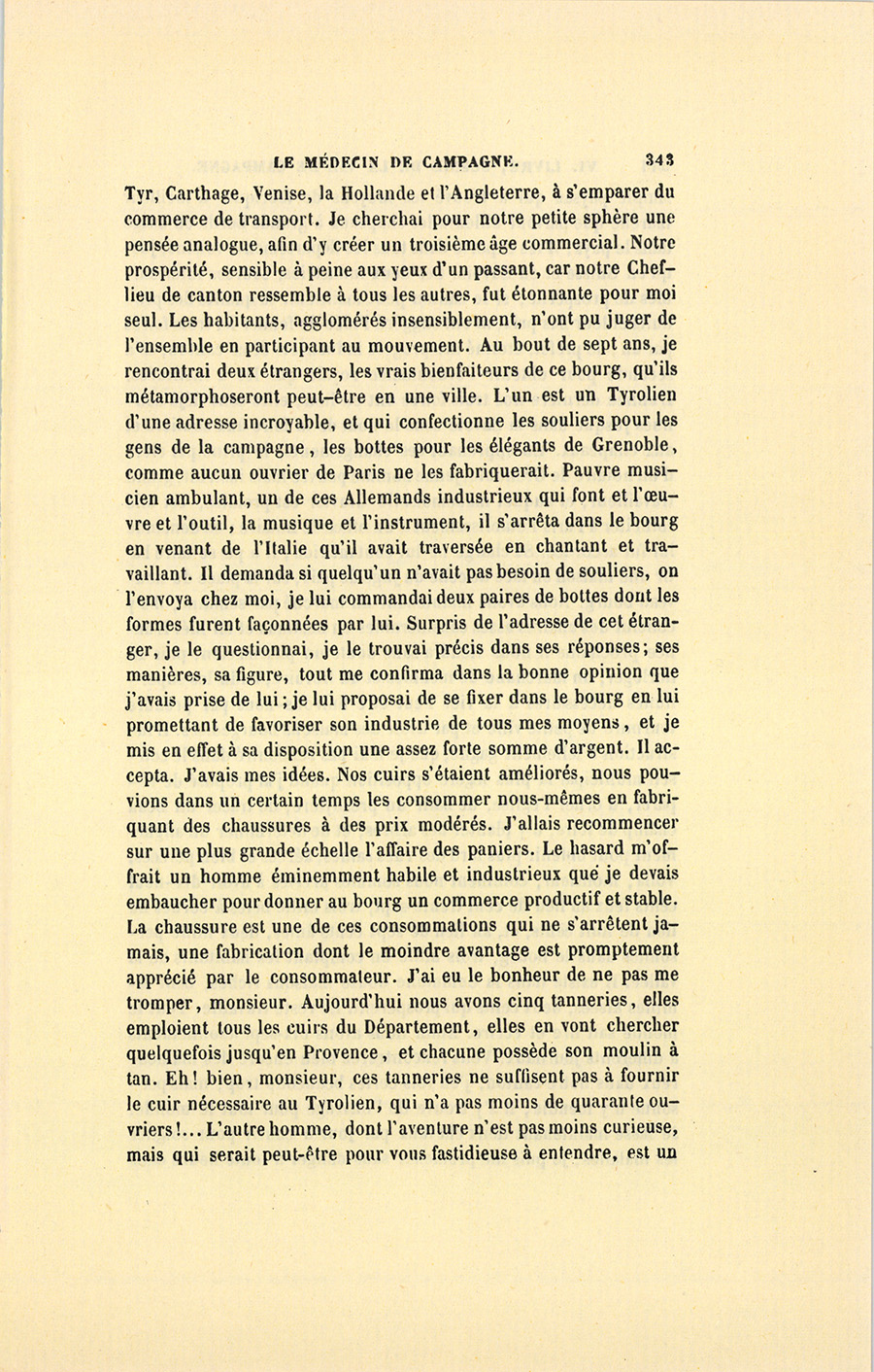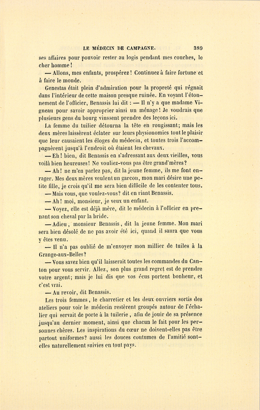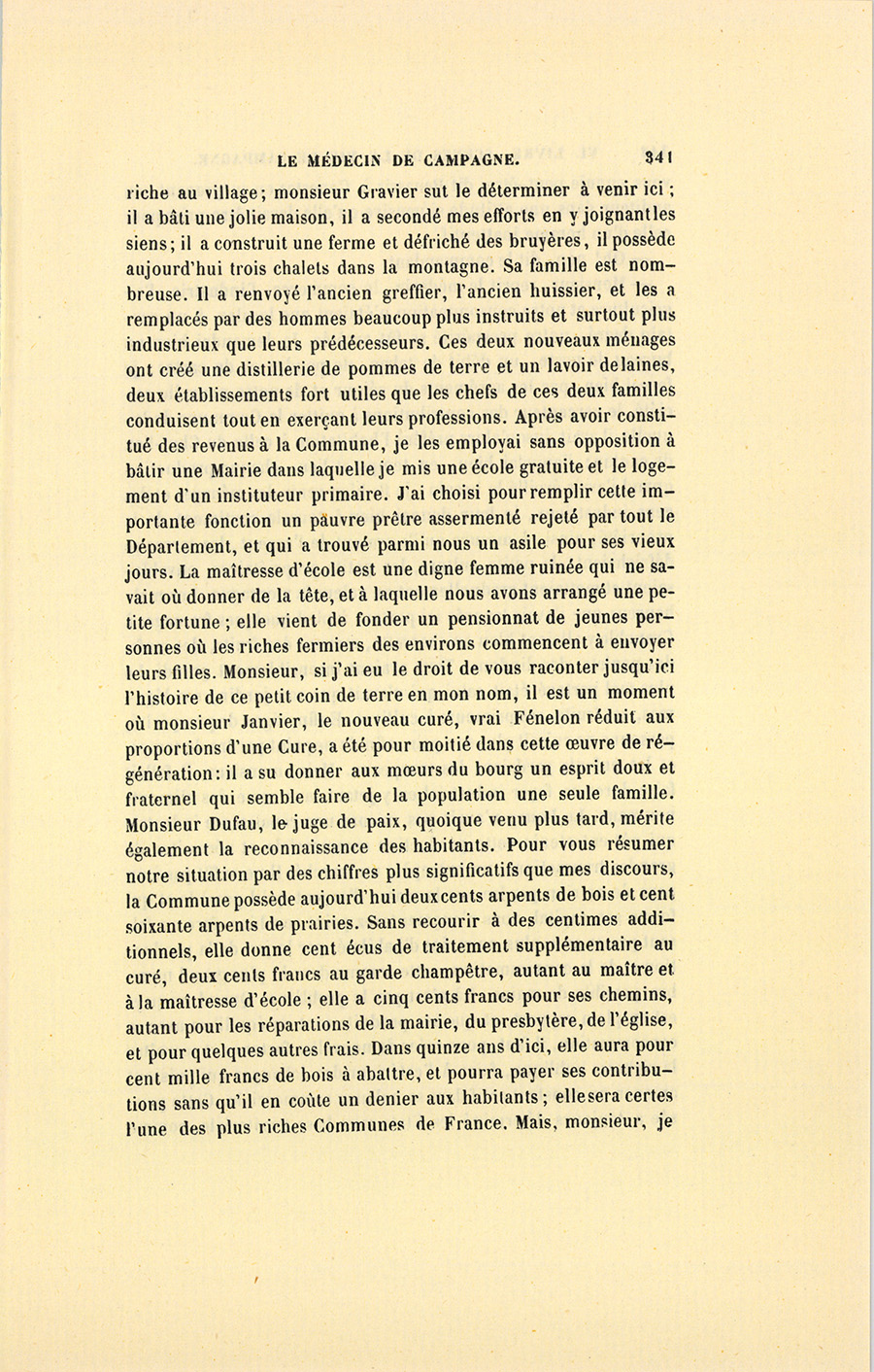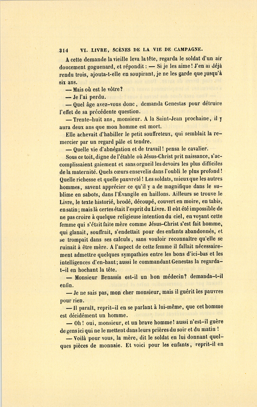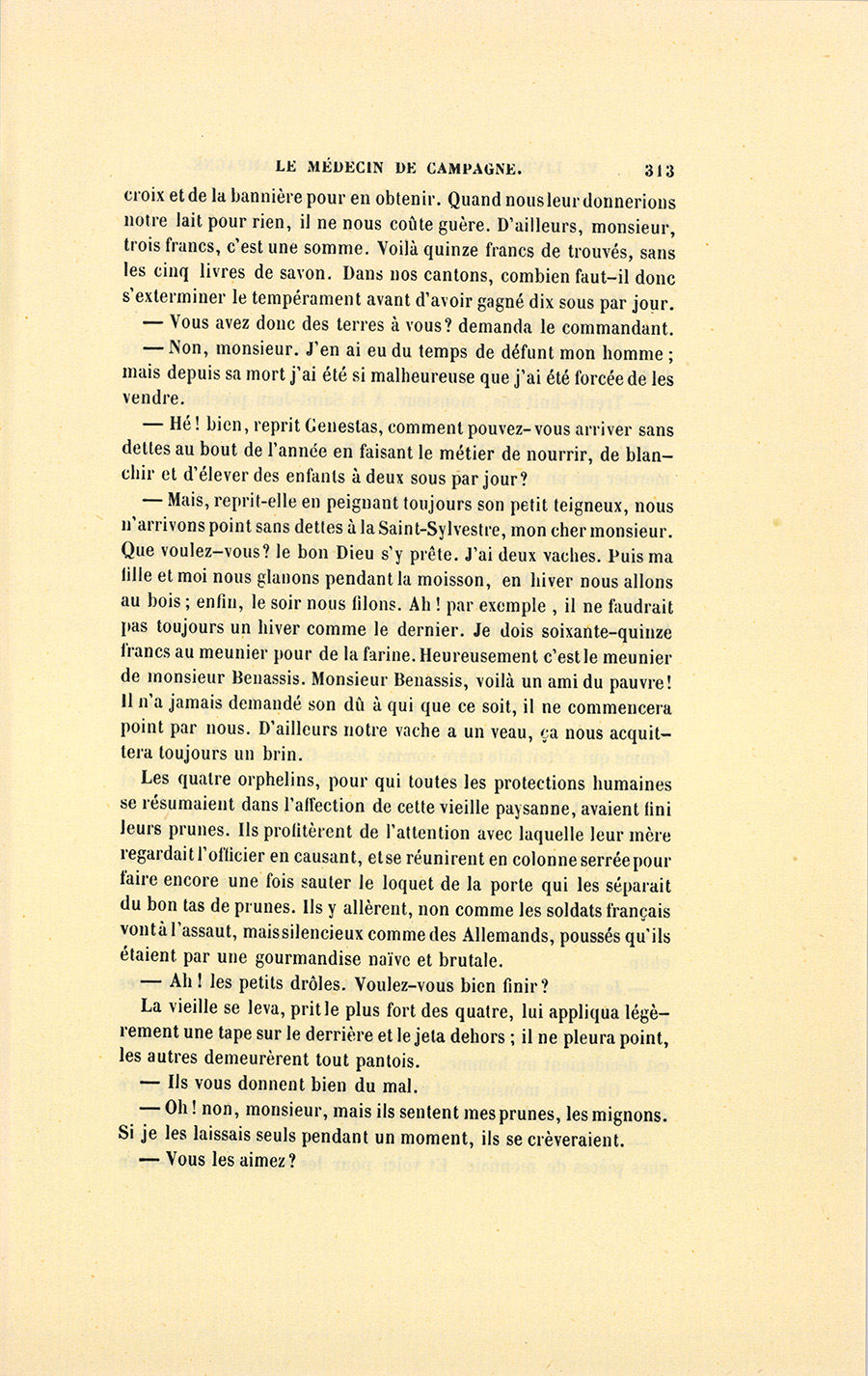 – Monsieur, voilà bien ce que nous dit monsieur Benassis ; mais si d’autres prennent les enfants au même prix, faut bien en passer par là. N’en a pas qui veut des enfants ! On a encore besoin de la {p. 313} croix et de la bannière pour en obtenir. Quand nous leur donnerions notre lait pour rien, il ne nous coûte guère. D’ailleurs, monsieur, trois francs, c’est une somme. Voilà quinze francs de trouvés, sans les cinq livres de savon. Dans nos cantons, combien faut-il donc s’exterminer le tempérament avant d’avoir gagné dix sous par jour.
