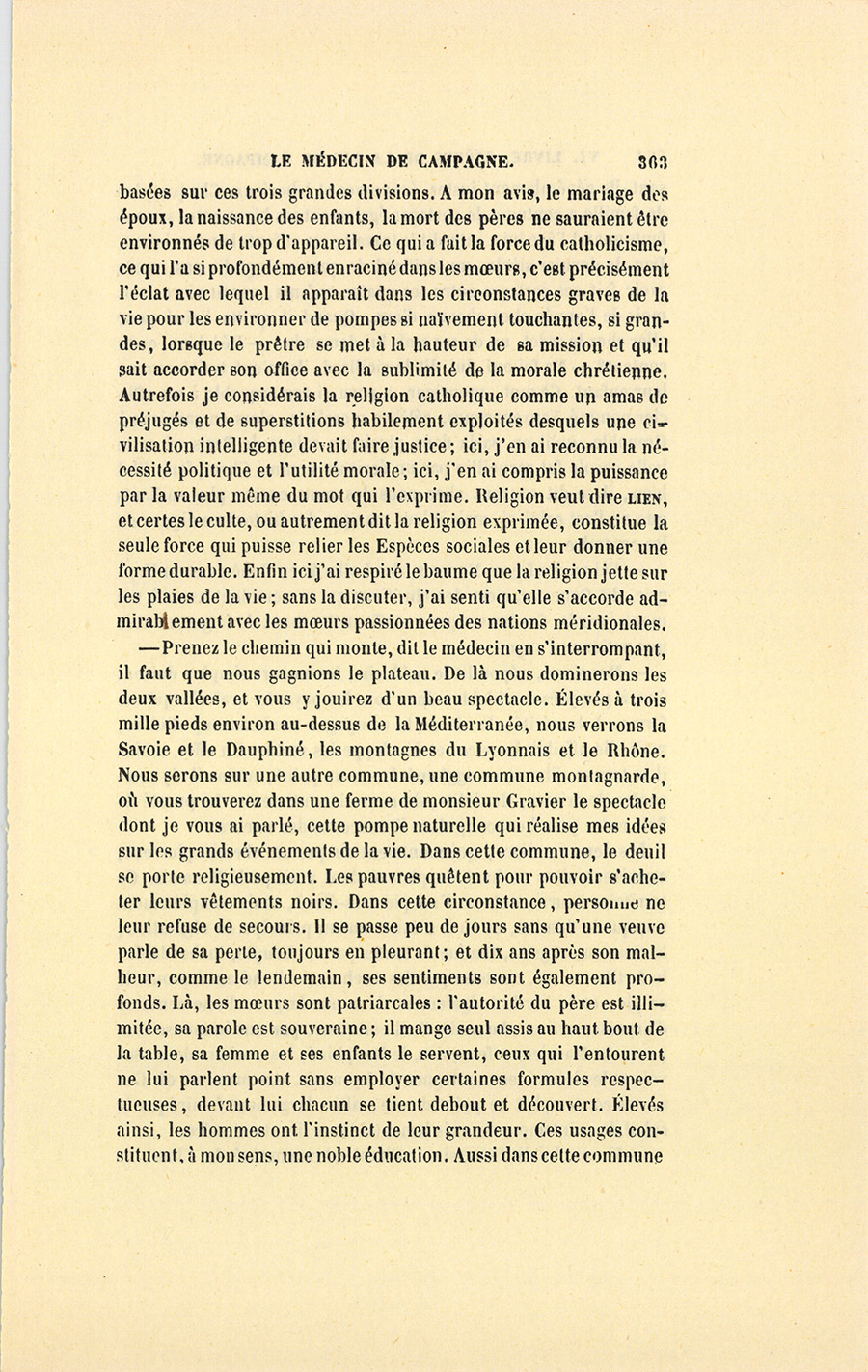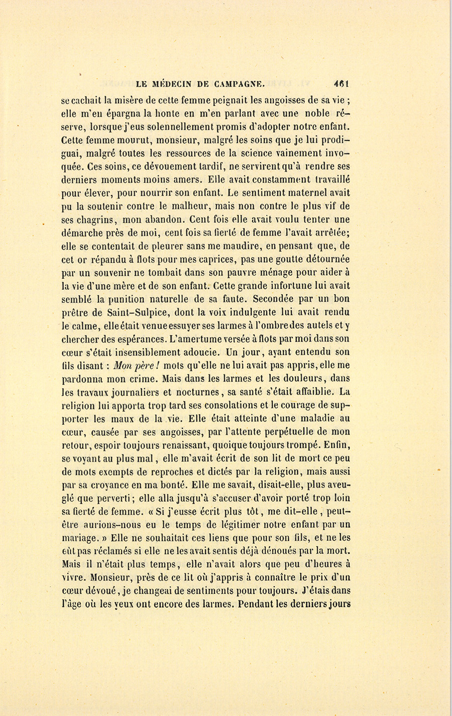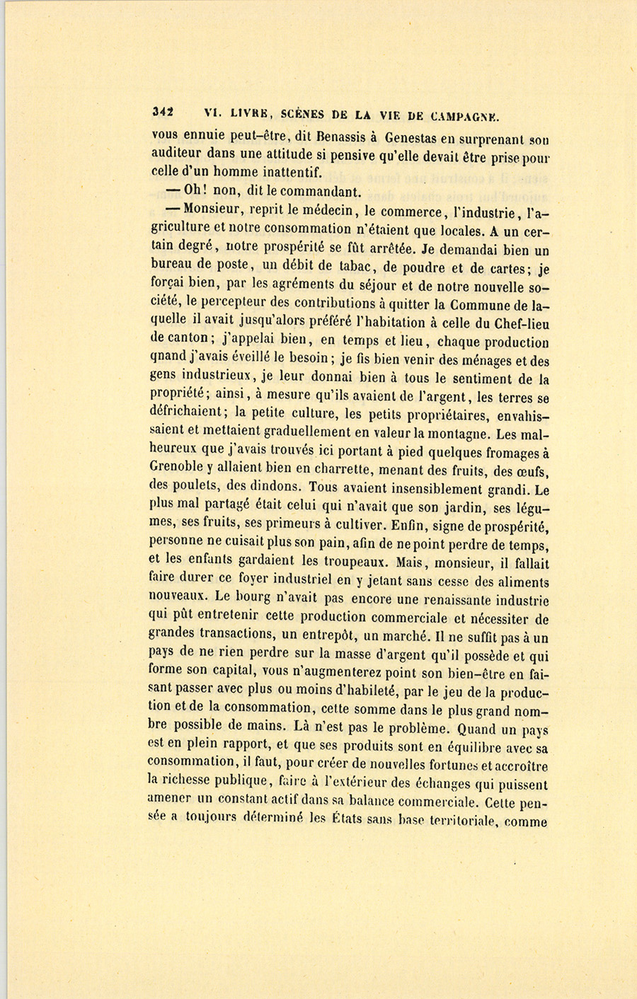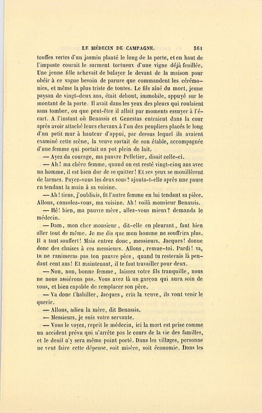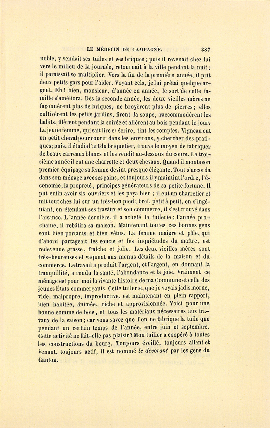 – Monsieur, voilà bien ce que nous dit monsieur Benassis ; mais si d’autres prennent les enfants au même prix, faut bien en passer par là. N’en a pas qui veut des enfants ! On a encore besoin de la {p. 313} croix et de la bannière pour en obtenir. Quand nous leur donnerions notre lait pour rien, il ne nous coûte guère. D’ailleurs, monsieur, trois francs, c’est une somme. Voilà quinze francs de trouvés, sans les cinq livres de savon. Dans nos cantons, combien faut-il donc s’exterminer le tempérament avant d’avoir gagné dix sous par jour.