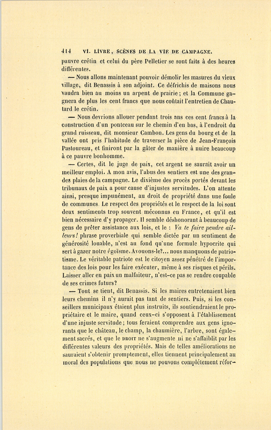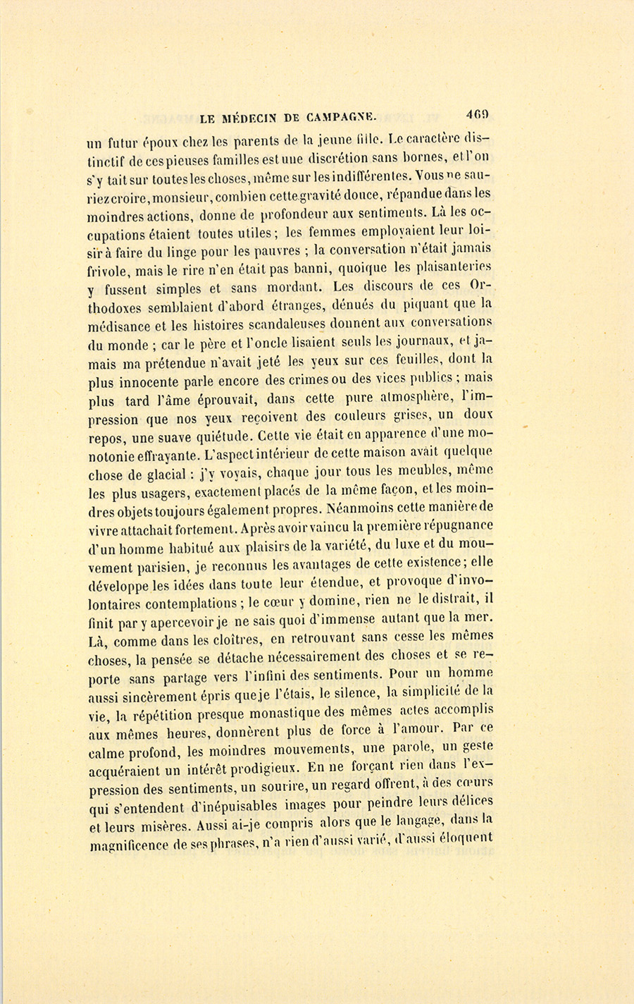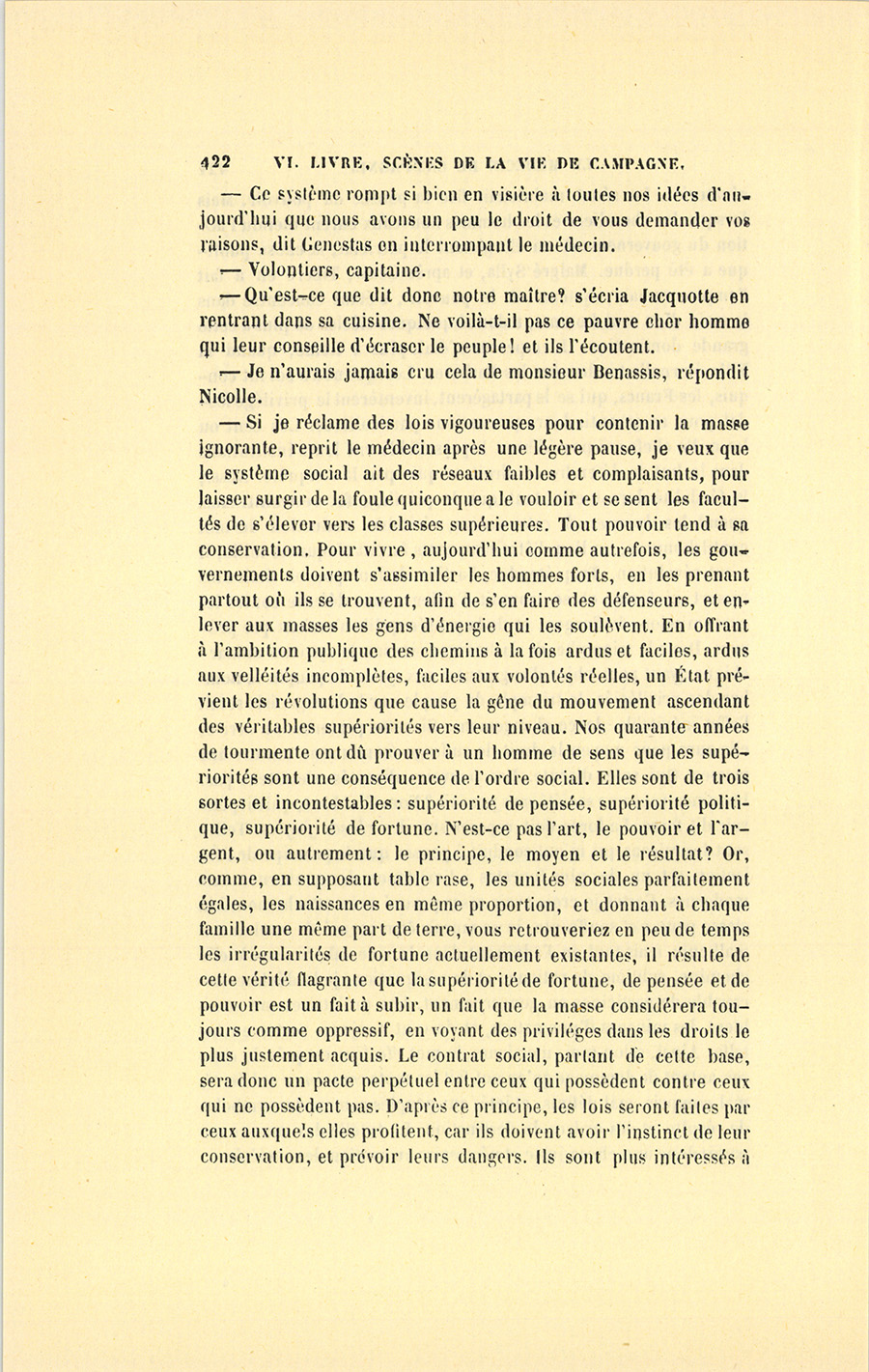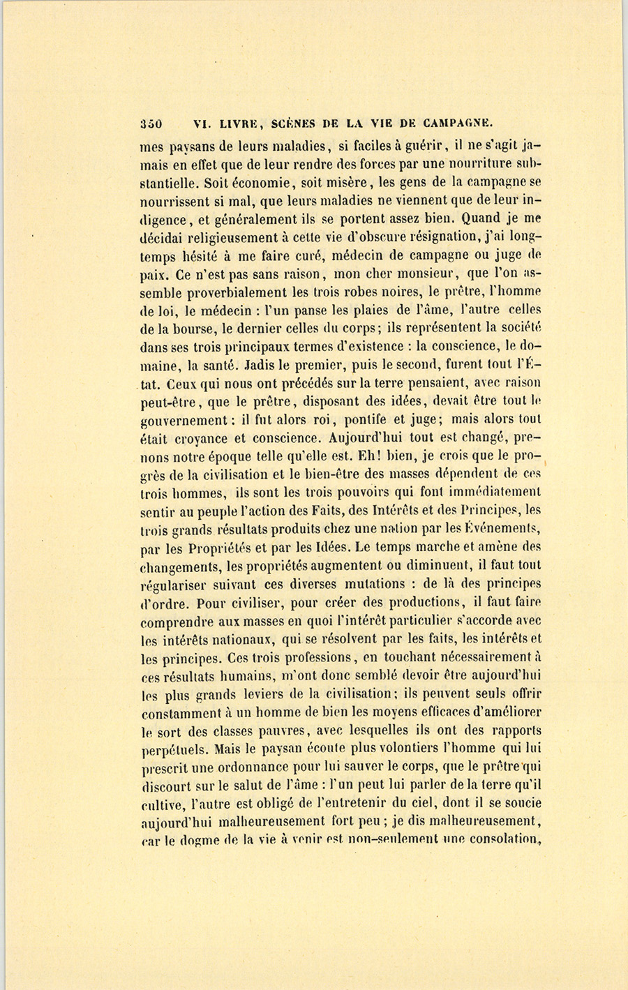 – Monsieur, voilà bien ce que nous dit monsieur Benassis ; mais si d’autres prennent les enfants au même prix, faut bien en passer par là. N’en a pas qui veut des enfants ! On a encore besoin de la {p. 313} croix et de la bannière pour en obtenir. Quand nous leur donnerions notre lait pour rien, il ne nous coûte guère. D’ailleurs, monsieur, trois francs, c’est une somme. Voilà quinze francs de trouvés, sans les cinq livres de savon. Dans nos cantons, combien faut-il donc s’exterminer le tempérament avant d’avoir gagné dix sous par jour.