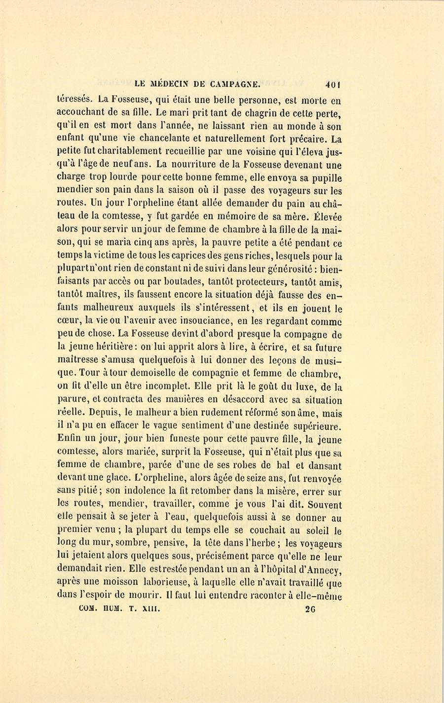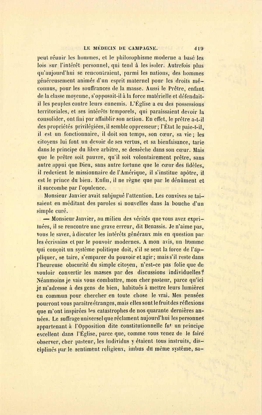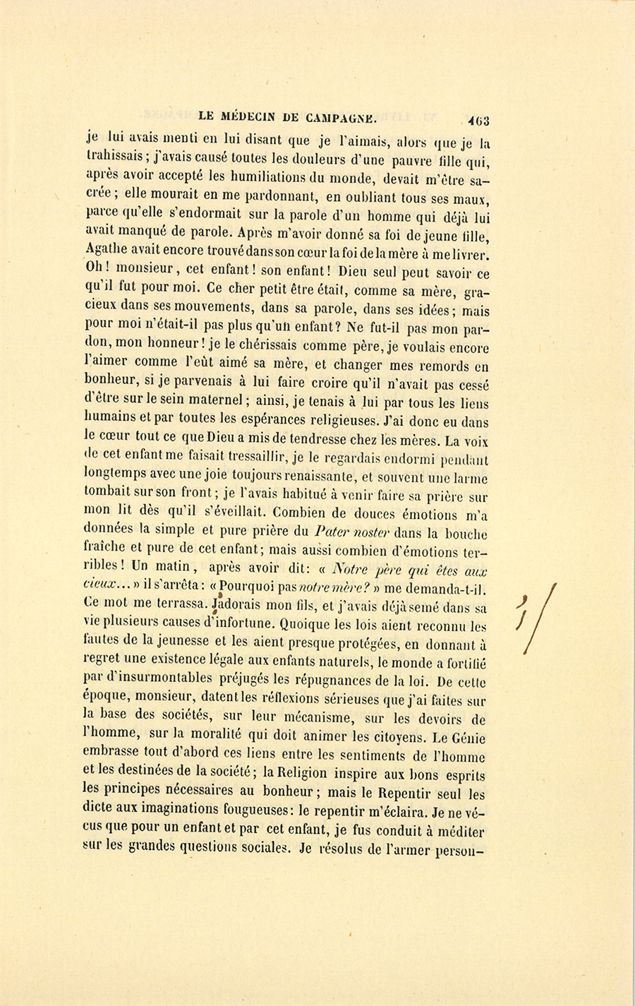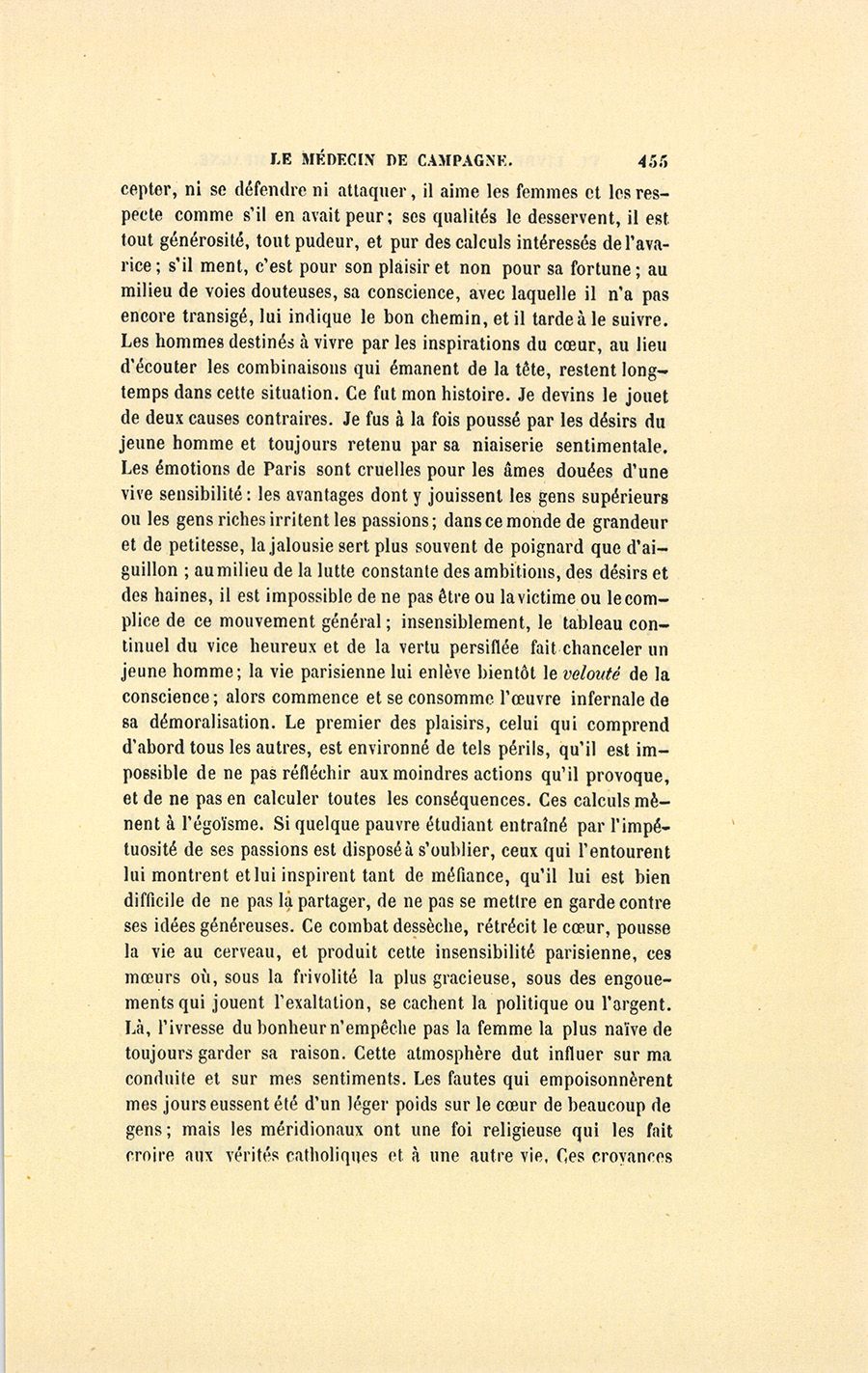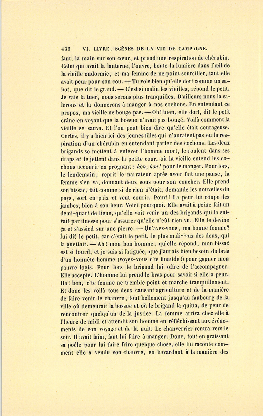 – Monsieur, voilà bien ce que nous dit monsieur Benassis ; mais si d’autres prennent les enfants au même prix, faut bien en passer par là. N’en a pas qui veut des enfants ! On a encore besoin de la {p. 313} croix et de la bannière pour en obtenir. Quand nous leur donnerions notre lait pour rien, il ne nous coûte guère. D’ailleurs, monsieur, trois francs, c’est une somme. Voilà quinze francs de trouvés, sans les cinq livres de savon. Dans nos cantons, combien faut-il donc s’exterminer le tempérament avant d’avoir gagné dix sous par jour.