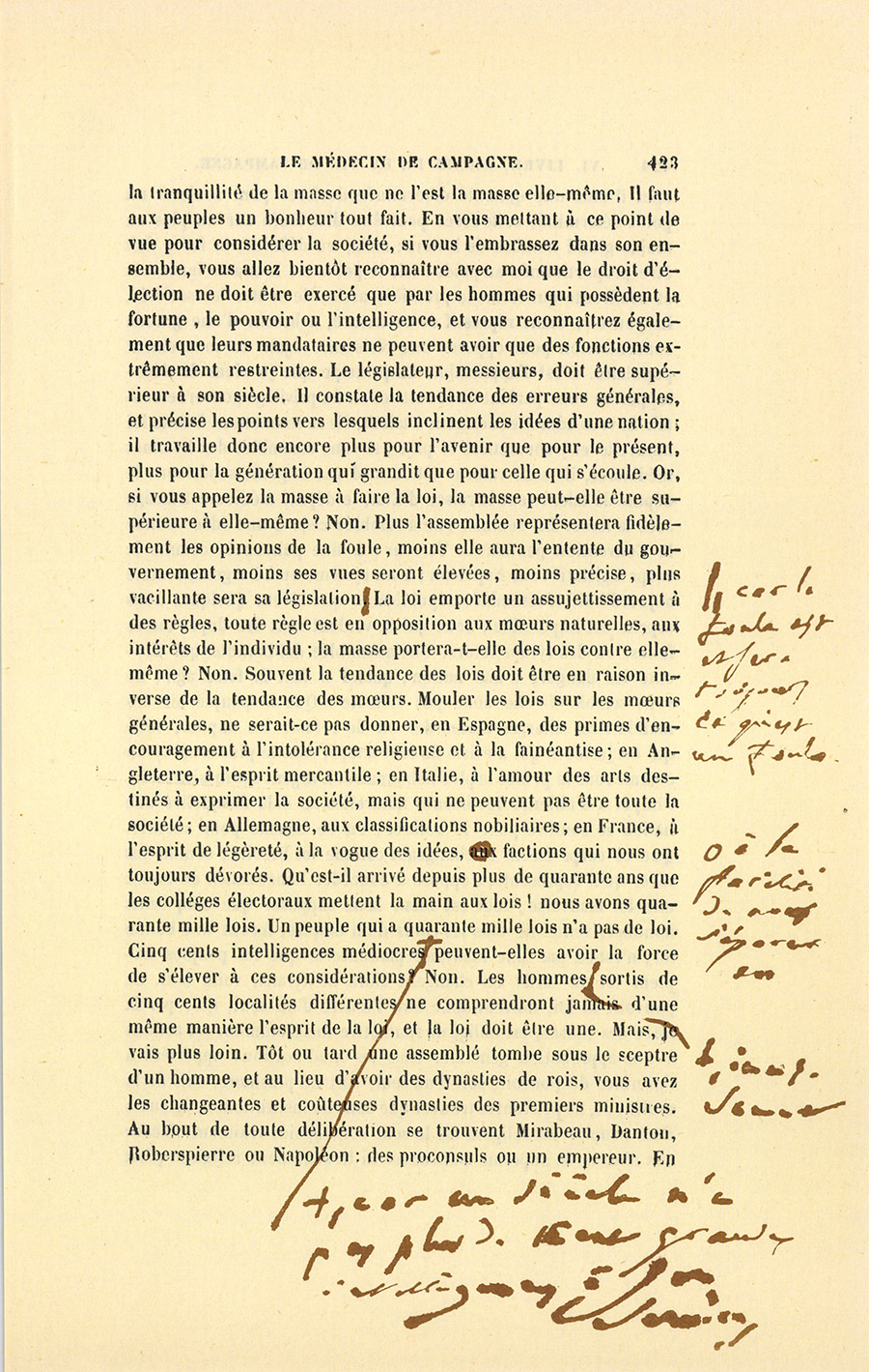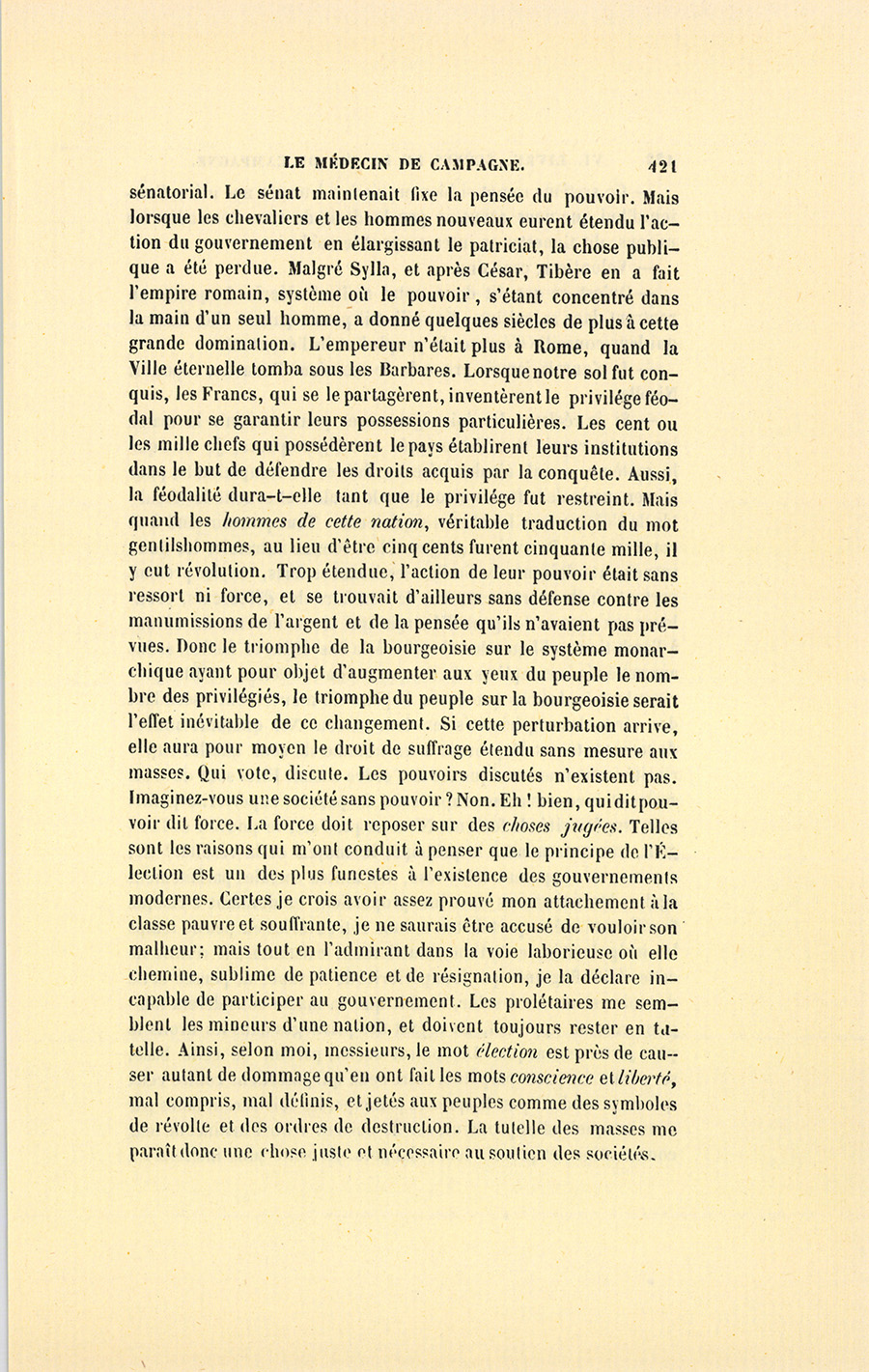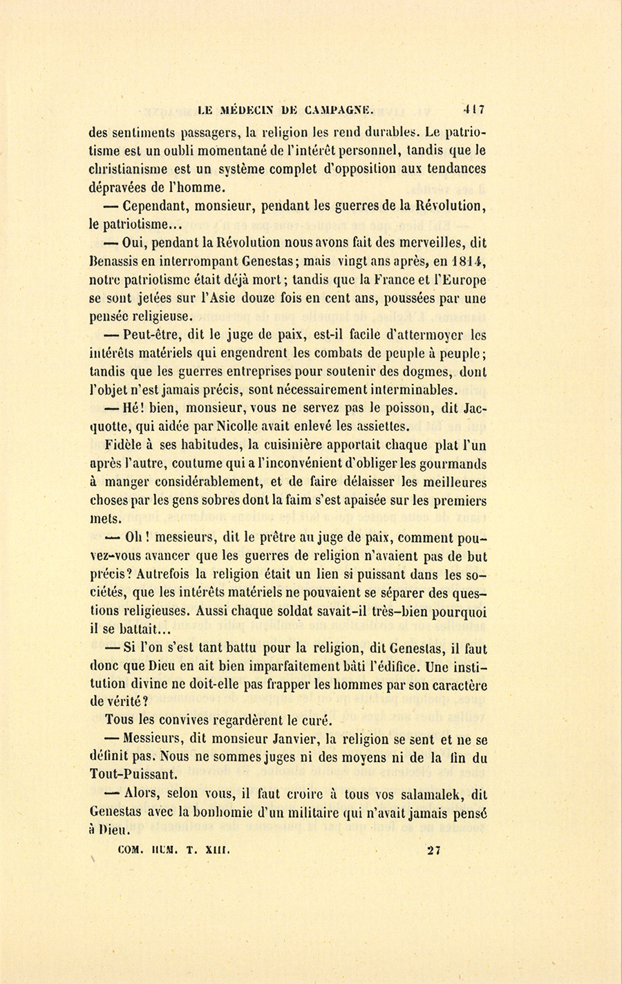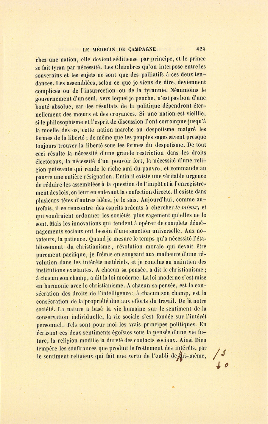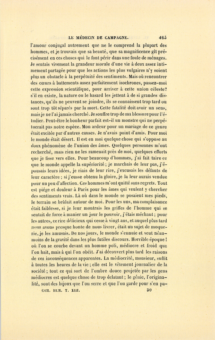 – Monsieur, voilà bien ce que nous dit monsieur Benassis ; mais si d’autres prennent les enfants au même prix, faut bien en passer par là. N’en a pas qui veut des enfants ! On a encore besoin de la {p. 313} croix et de la bannière pour en obtenir. Quand nous leur donnerions notre lait pour rien, il ne nous coûte guère. D’ailleurs, monsieur, trois francs, c’est une somme. Voilà quinze francs de trouvés, sans les cinq livres de savon. Dans nos cantons, combien faut-il donc s’exterminer le tempérament avant d’avoir gagné dix sous par jour.