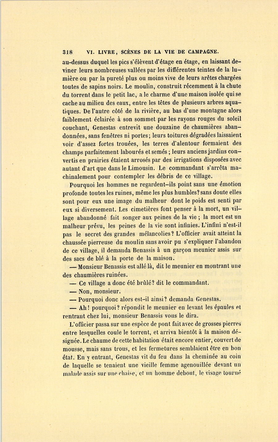 Arrêtée par la base des montagnes, la rivière forme un petit lac {p. 318} au-dessus duquel les pics s’élèvent d’étage en étage, en laissant deviner leurs nombreuses vallées par les différentes teintes de la lumière ou par la pureté plus ou moins vive de leurs arêtes chargées toutes de sapins noirs. Le moulin, construit récemment à la chute du torrent dans le petit lac, a le charme d’une maison isolée qui se cache au milieu des eaux, entre les têtes de plusieurs arbres aquatiques. De l’autre côté de la rivière, au bas d’une montagne alors faiblement éclairée à son sommet par les rayons rouges du soleil couchant, Genestas entrevit une douzaine de chaumières abandonnées, sans fenêtres ni portes ; leurs toitures dégradées laissaient voir d’assez fortes trouées, les terres d’alentour formaient des champs parfaitement labourés et semés ; leurs anciens jardins convertis en prairies étaient arrosés par des irrigations disposées avec autant d’art que dans le Limousin. Le commandant s’arrêta machinalement pour contempler les débris de ce village.