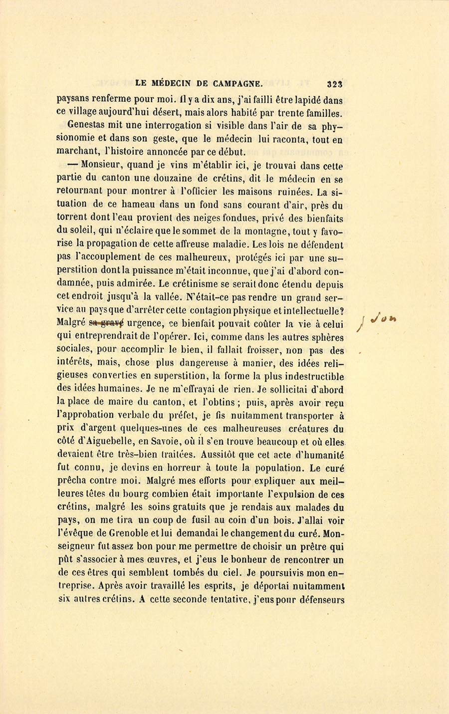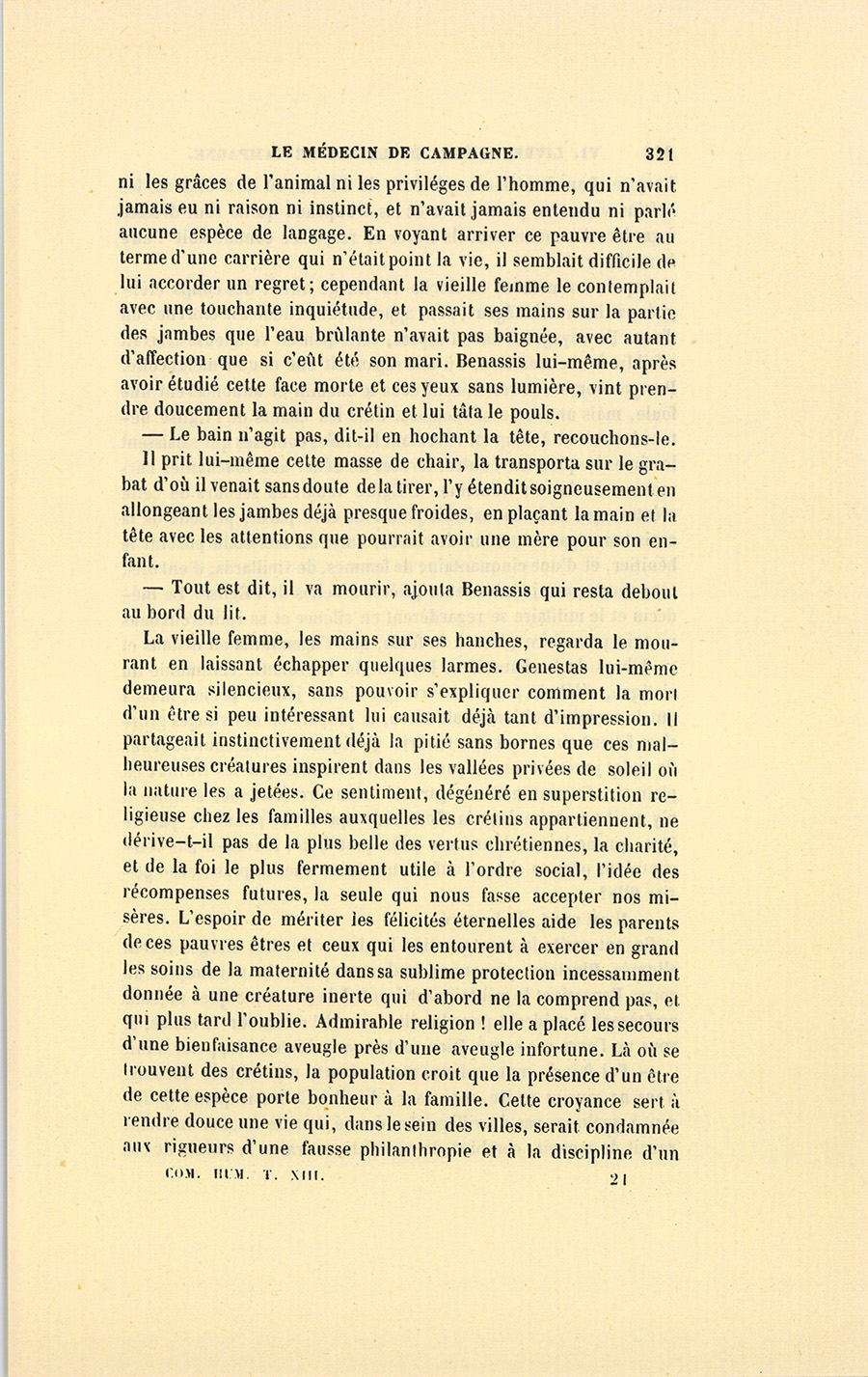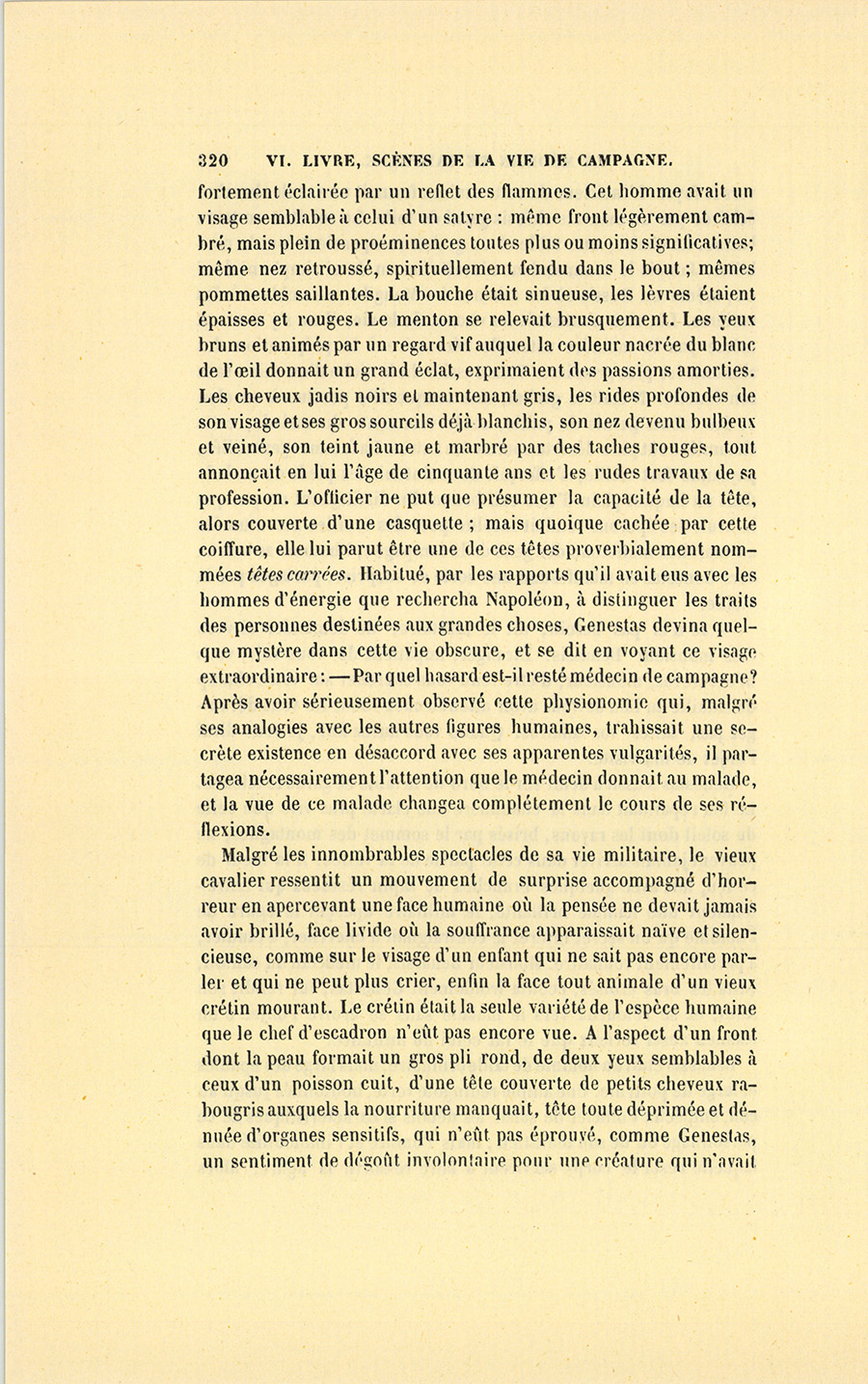 Malgré les innombrables spectacles de sa vie militaire, le vieux cavalier ressentit un mouvement de surprise accompagné d’horreur en apercevant une face humaine où la pensée ne devait jamais avoir brillé, face livide où la souffrance apparaissait naïve et silencieuse, comme sur le visage d’un enfant qui ne sait pas encore parler et qui ne peut plus crier, enfin la face tout animale d’un vieux crétin mourant. Le crétin était la seule variété de l’espèce humaine que le chef d’escadron n’eût pas encore vue. À l’aspect d’un front dont la peau formait un gros pli rond, de deux yeux semblables à ceux d’un poisson cuit, d’une tête couverte de petits cheveux rabougris auxquels la nourriture manquait, tête toute déprimée et dénuée d’organes sensitifs, qui n’eût pas éprouvé, comme Genestas, un sentiment de dégoût involontaire pour une créature qui n’avait {p. 321} ni les grâces de l’animal ni les priviléges de l’homme, qui n’avait jamais eu ni raison ni instinct, et n’avait jamais entendu ni parlé aucune espèce de langage. En voyant arriver ce pauvre être au terme d’une carrière qui n’était point la vie, il semblait difficile de lui accorder un regret ; cependant la vieille femme le contemplait avec une touchante inquiétude, et passait ses mains sur la partie des jambes que l’eau brûlante n’avait pas baignée, avec autant d’affection que si c’eût été son mari. Benassis lui-même, après avoir étudié cette face morte et ces yeux sans lumière, vint prendre doucement la main du crétin et lui tâta le pouls.