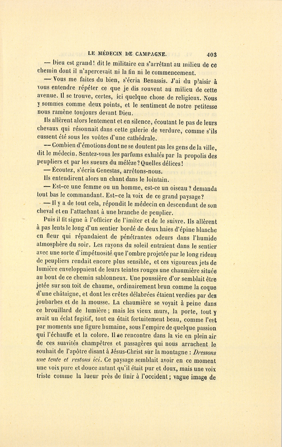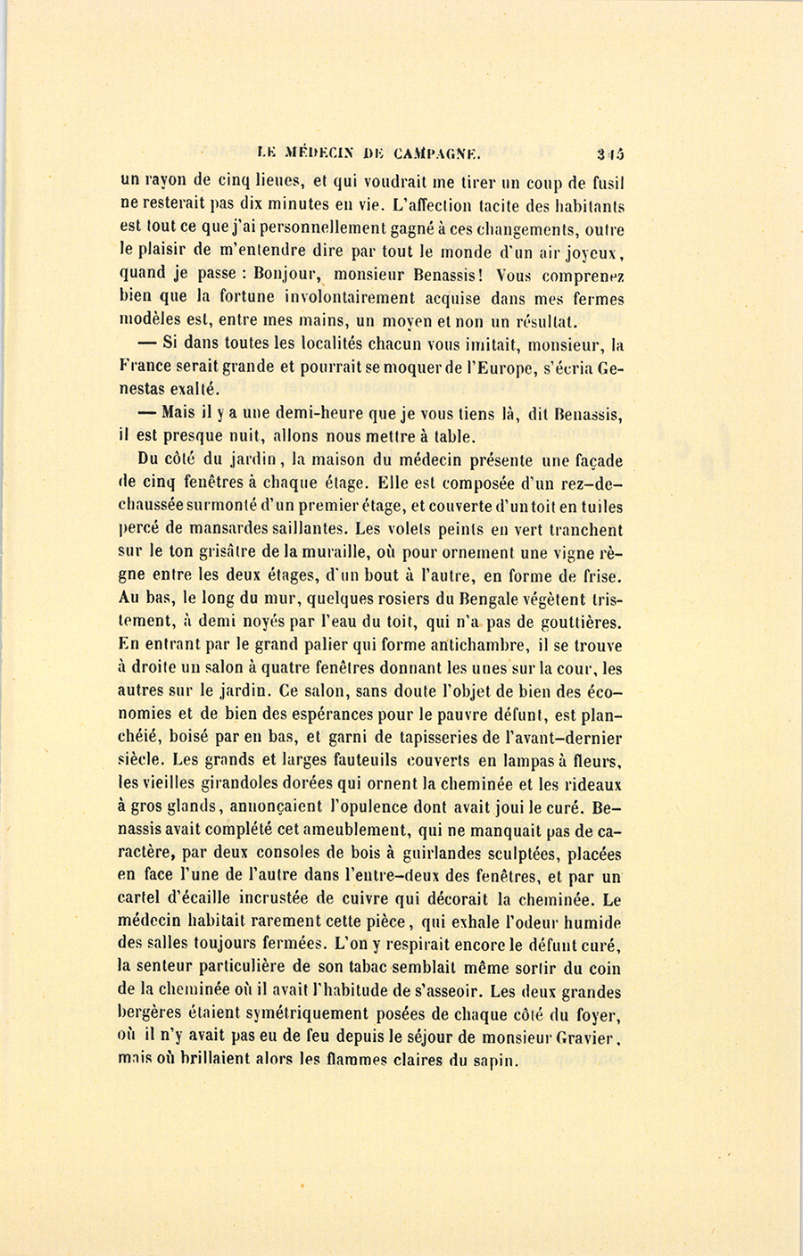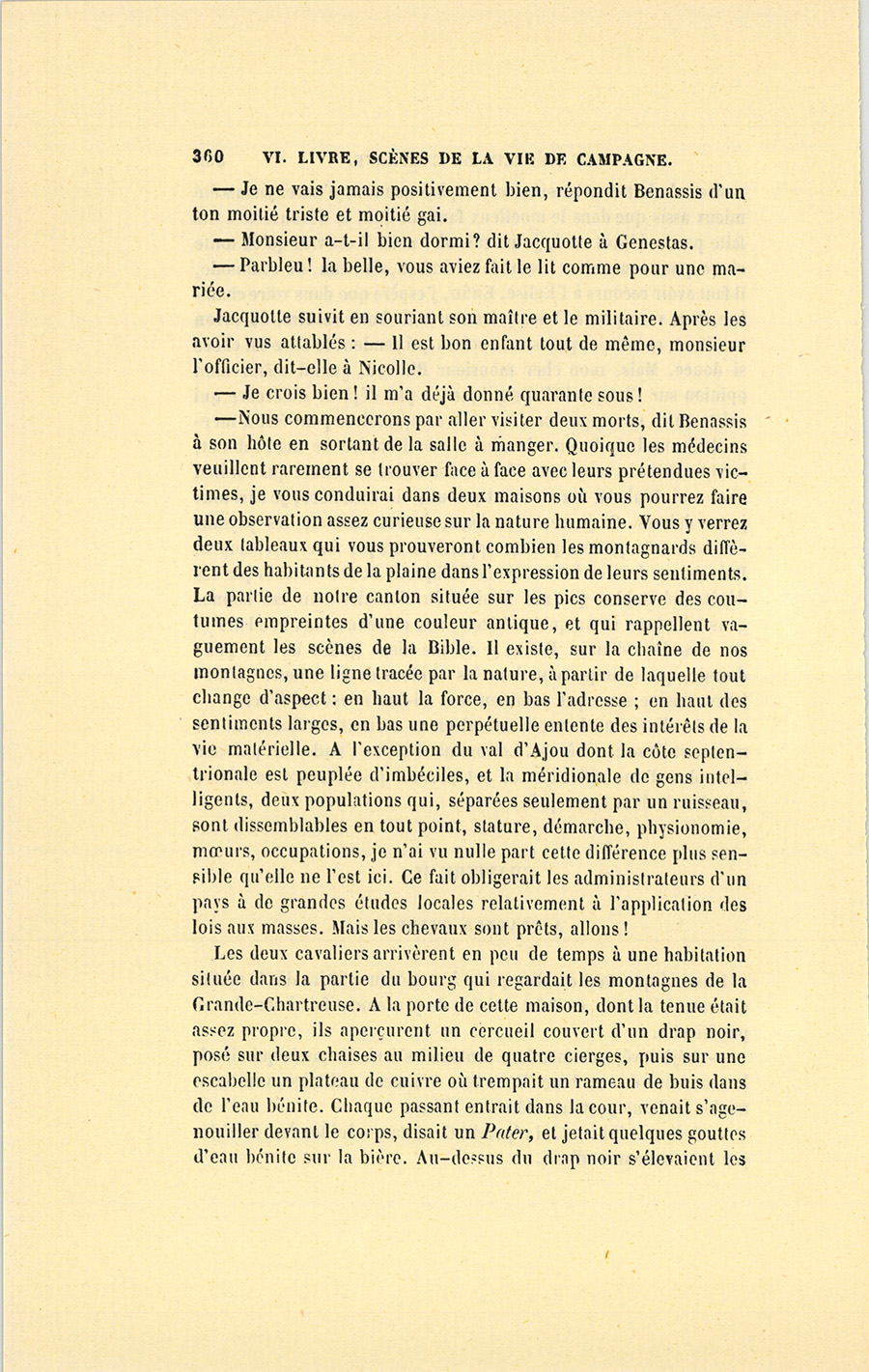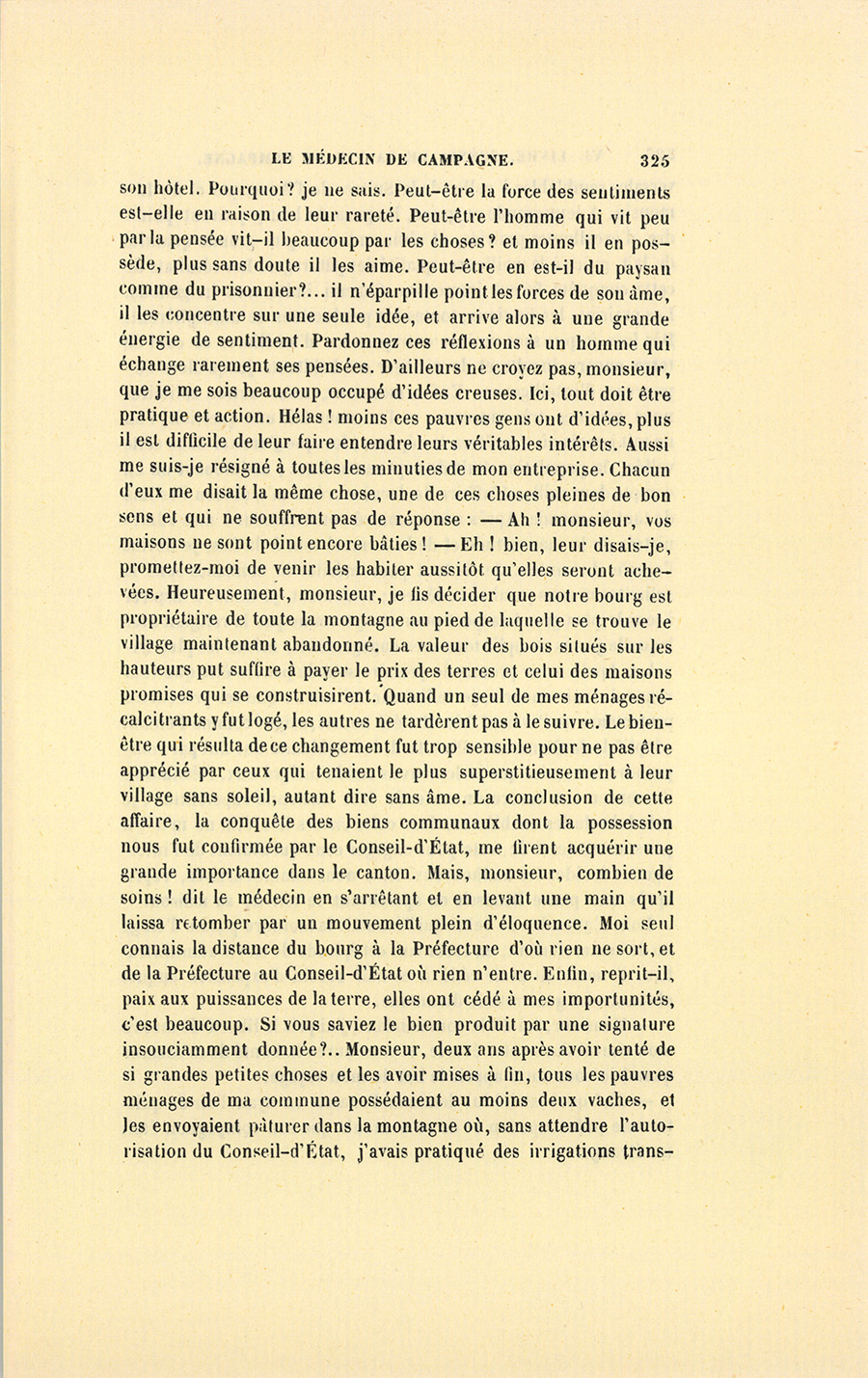 – J’ai fait de mon mieux, mes enfants, répondit le docteur. Vous ne sauriez croire, monsieur, dit-il à Genestas quand ils furent à quelques pas du village abandonné dont le dernier habitant venait de mourir, combien de consolations vraies la parole de ces {p. 323} paysans renferme pour moi. Il y a dix ans, j’ai failli être lapidé dans ce village aujourd’hui désert, mais alors habité par trente familles.