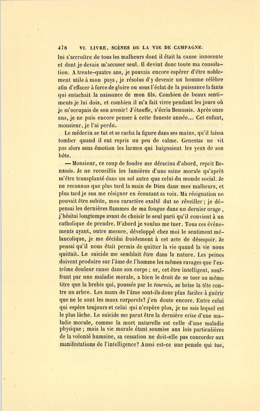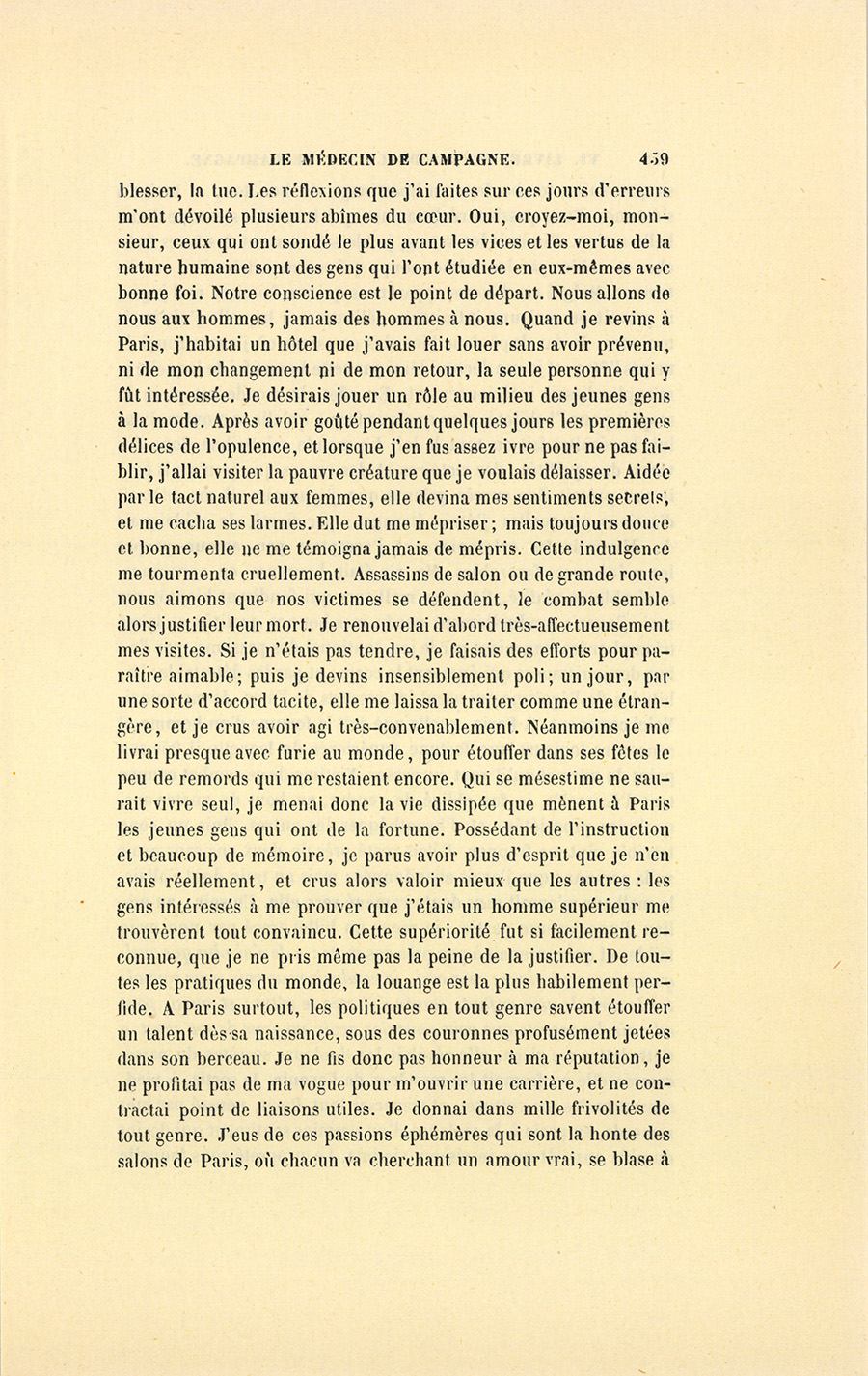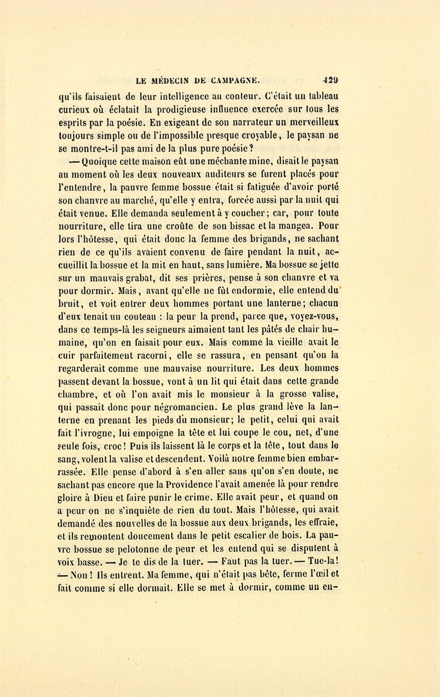 – J’ai fait de mon mieux, mes enfants, répondit le docteur. Vous ne sauriez croire, monsieur, dit-il à Genestas quand ils furent à quelques pas du village abandonné dont le dernier habitant venait de mourir, combien de consolations vraies la parole de ces {p. 323} paysans renferme pour moi. Il y a dix ans, j’ai failli être lapidé dans ce village aujourd’hui désert, mais alors habité par trente familles.