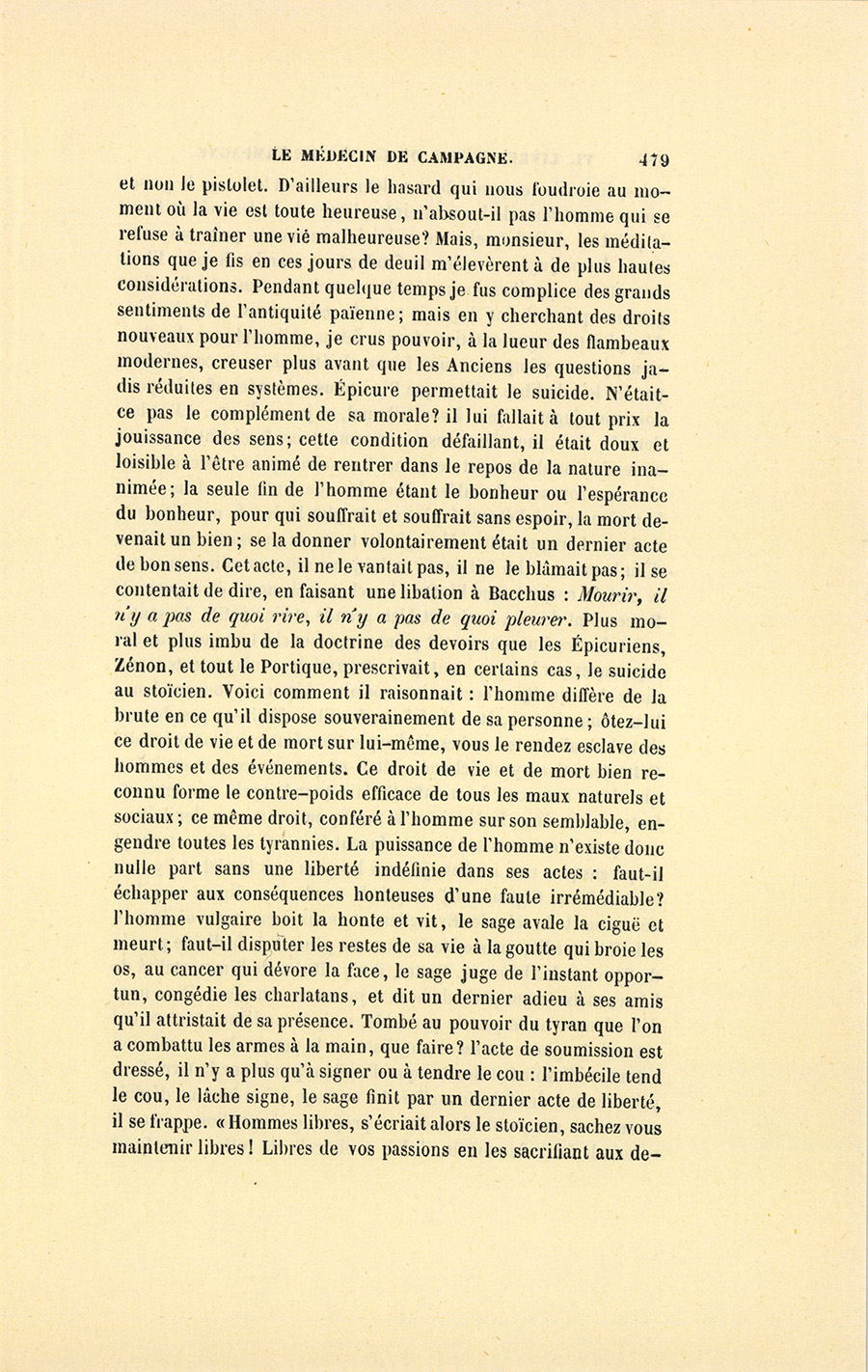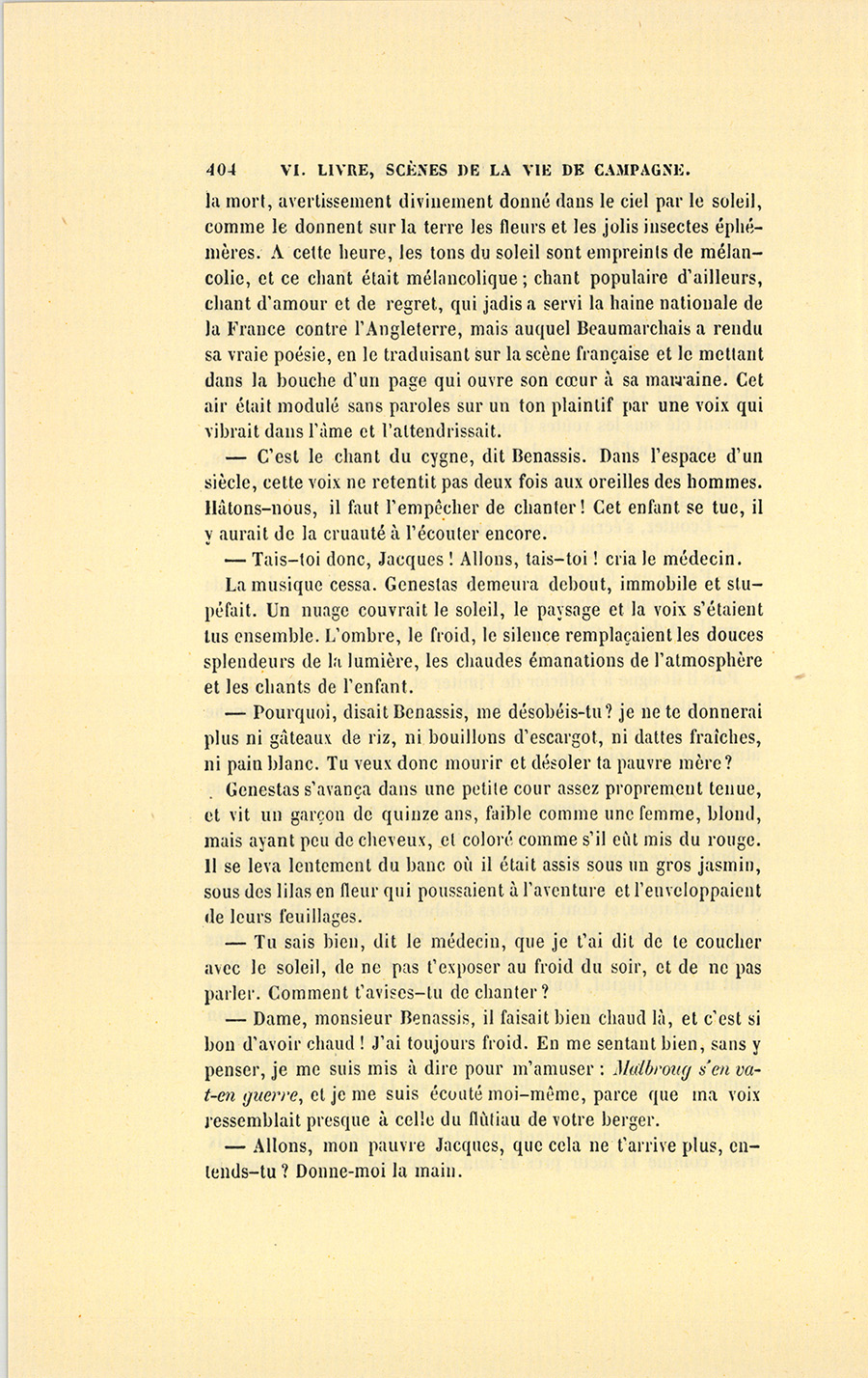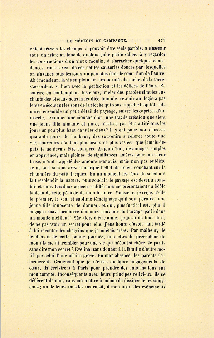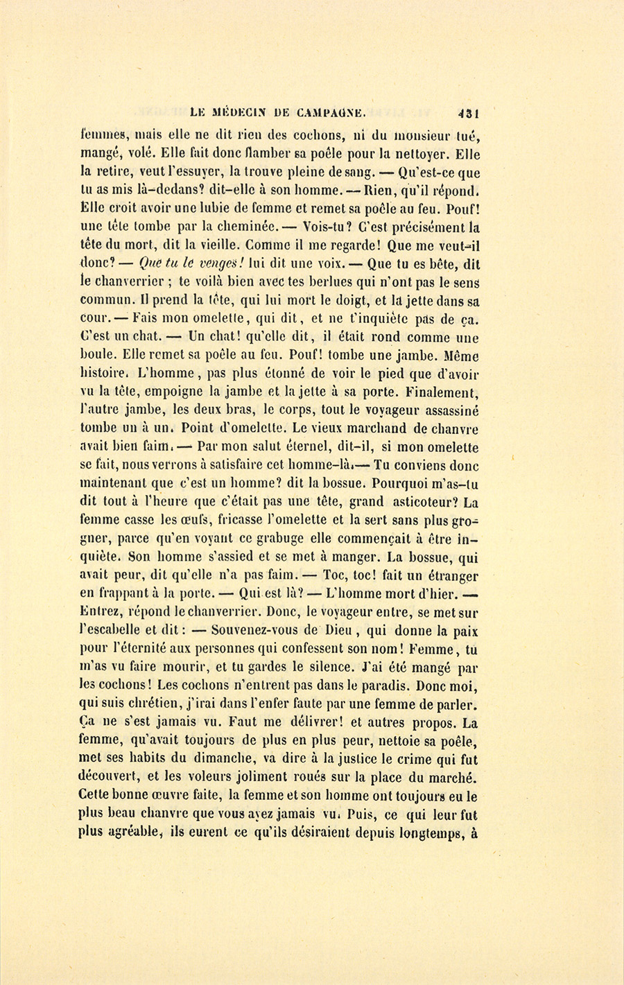 – J’ai fait de mon mieux, mes enfants, répondit le docteur. Vous ne sauriez croire, monsieur, dit-il à Genestas quand ils furent à quelques pas du village abandonné dont le dernier habitant venait de mourir, combien de consolations vraies la parole de ces {p. 323} paysans renferme pour moi. Il y a dix ans, j’ai failli être lapidé dans ce village aujourd’hui désert, mais alors habité par trente familles.
