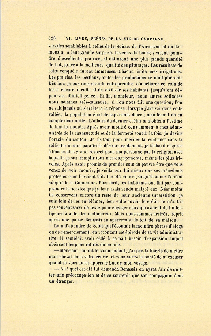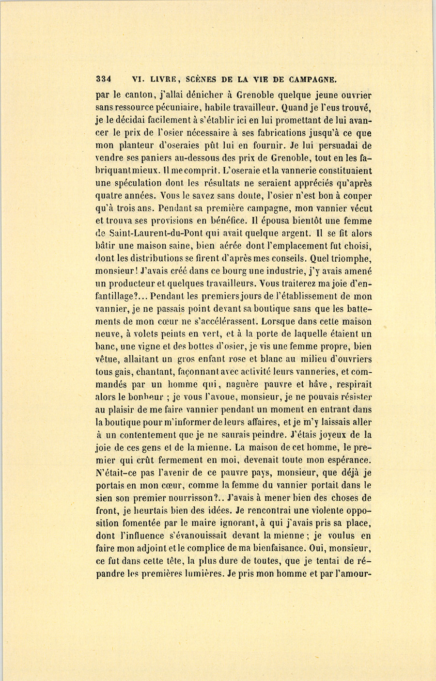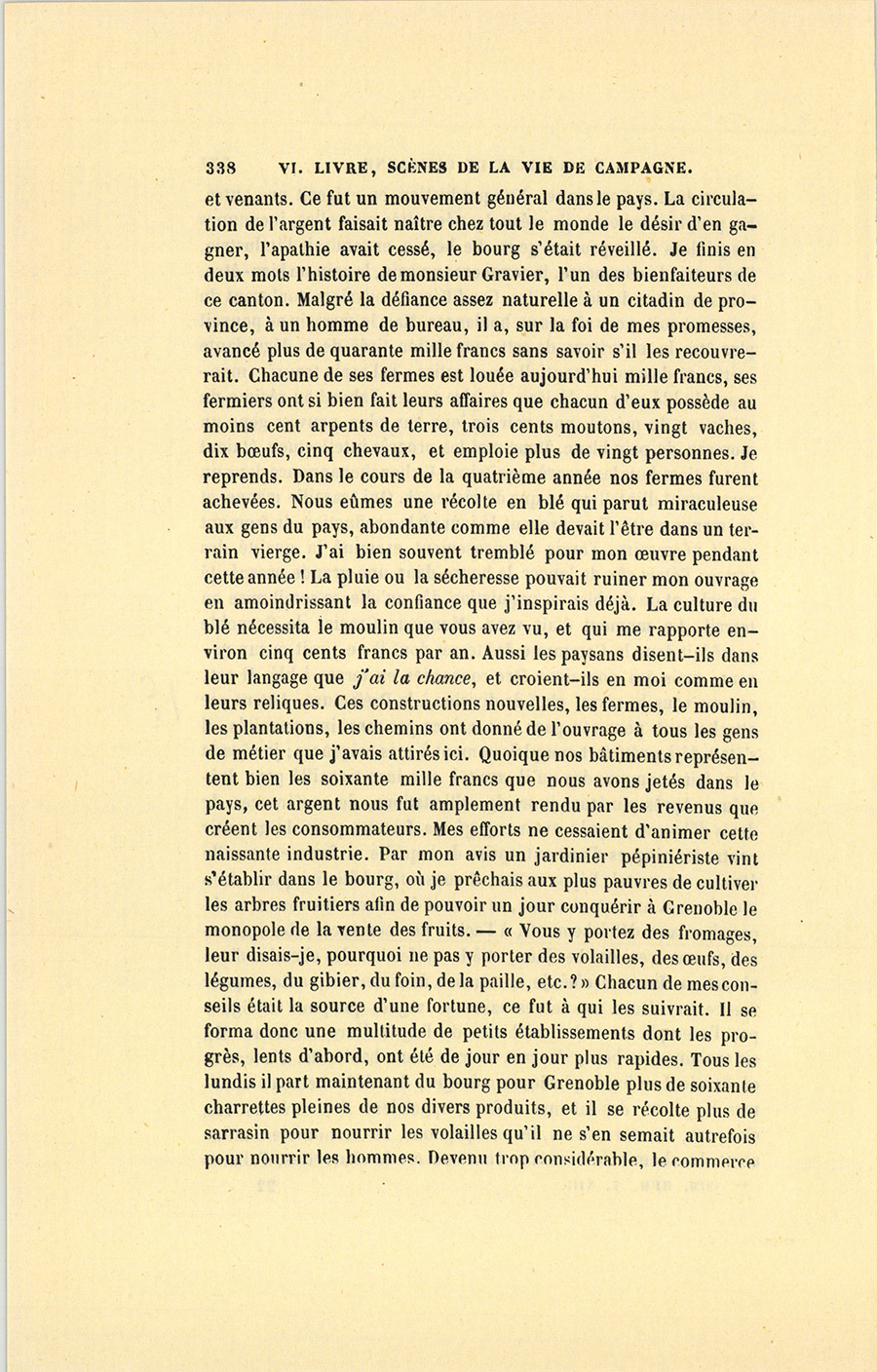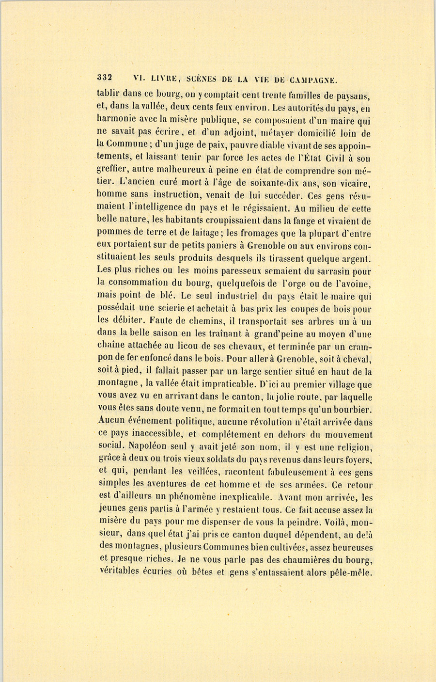 – Comment cela s’est fait, mon cher monsieur ? reprit-il, mais naturellement et en vertu d’une loi sociale d’attraction entre les nécessités que nous nous créons et les moyens de les satisfaire. Tout est là. Les peuples sans besoins sont pauvres. Quand je vins {p. 332} m’établir dans ce bourg, on y comptait cent trente familles de paysans, et, dans la vallée, deux cents feux environ. Les autorités du pays, en harmonie avec la misère publique, se composaient d’un maire qui ne savait pas écrire, et d’un adjoint, métayer domicilié loin de la Commune ; d’un juge de paix, pauvre diable vivant de ses appointements, et laissant tenir par force les actes de l’État Civil à son greffier, autre malheureux à peine en état de comprendre son métier. L’ancien curé mort à l’âge de soixante-dix ans, son vicaire, homme sans instruction, venait de lui succéder. Ces gens résumaient l’intelligence du pays et le régissaient. Au milieu de cette belle nature, les habitants croupissaient dans la fange et vivaient de pommes de terre et de laitage ; les fromages que la plupart d’entre eux portaient sur de petits paniers à Grenoble ou aux environs constituaient les seuls produits desquels ils tirassent quelque argent. Les plus riches ou les moins paresseux semaient du sarrasin pour la consommation du bourg, quelquefois de l’orge ou de l’avoine, mais point de blé. Le seul industriel du pays était le maire qui possédait une scierie et achetait à bas prix les coupes de bois pour les débiter. Faute de chemins, il transportait ses arbres un à un dans la belle saison en les traînant à grand’peine au moyen d’une chaîne attachée au licou de ses chevaux, et terminée par un crampon de fer enfoncé dans le bois. Pour aller à Grenoble, soit à cheval, soit à pied, il fallait passer par un large sentier situé en haut de la montagne, la vallée était impraticable. D’ici au premier village que vous avez vu en arrivant dans le canton, la jolie route, par laquelle vous êtes sans doute venu, ne formait en tout temps qu’un bourbier. Aucun événement politique, aucune révolution n’était arrivée dans ce pays inaccessible, et complétement en dehors du mouvement social. Napoléon seul y avait jeté son nom, il y est une religion, grâce à deux ou trois vieux soldats du pays revenus dans leurs foyers, et qui, pendant les veillées, racontent fabuleusement à ces gens simples les aventures de cet homme et de ses armées. Ce retour est d’ailleurs un phénomène inexplicable. Avant mon arrivée, les jeunes gens partis à l’armée y restaient tous. Ce fait accuse assez la misère du pays pour me dispenser de vous la peindre. Voilà, monsieur, dans quel état j’ai pris ce canton duquel dépendent, au delà des montagnes, plusieurs Communes bien cultivées, assez heureuses et presque riches. Je ne vous parle pas des chaumières du bourg, véritables écuries où bêtes et gens s’entassaient alors pêle-mêle.