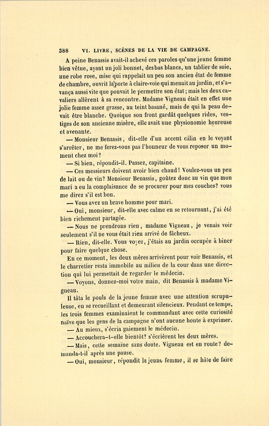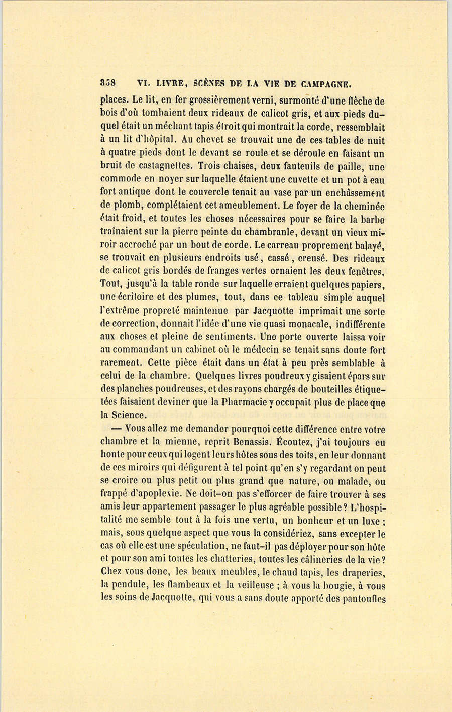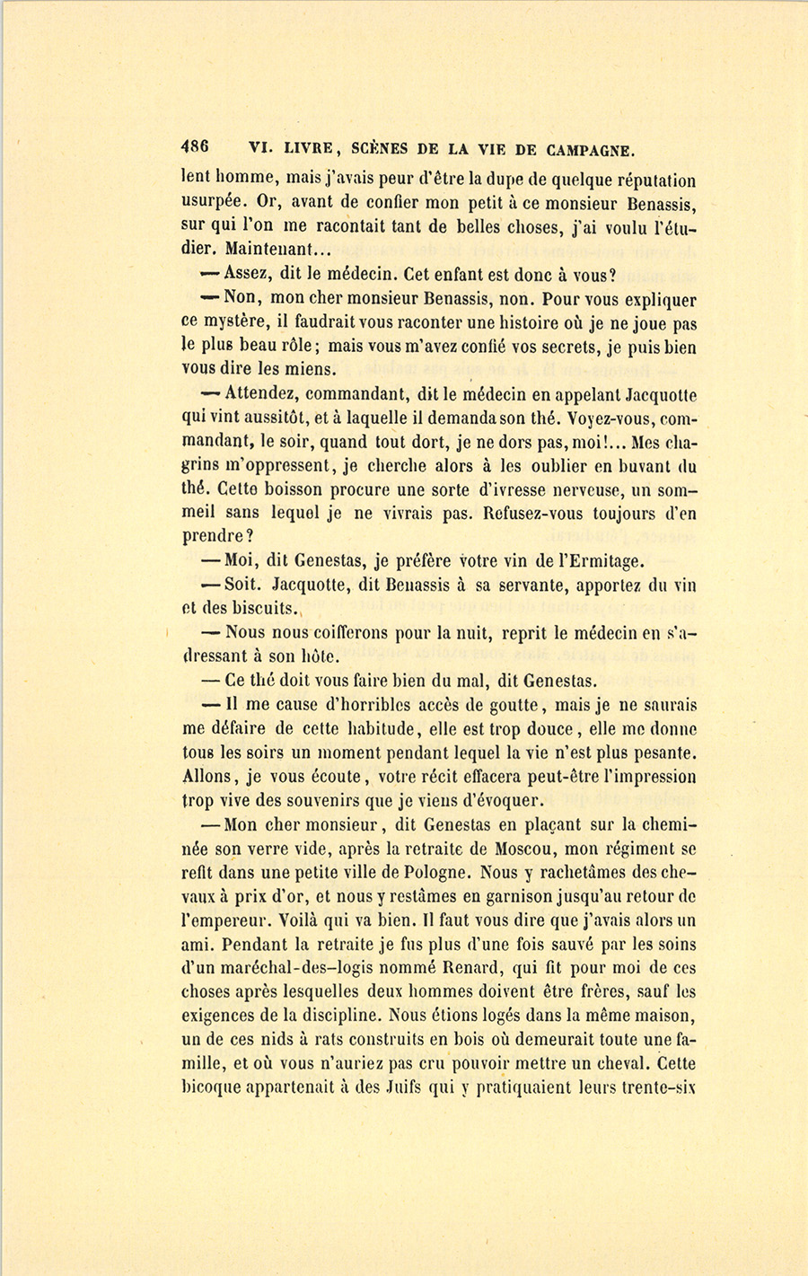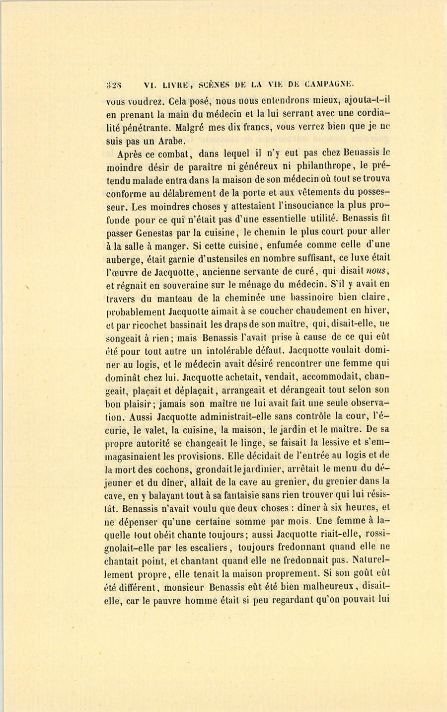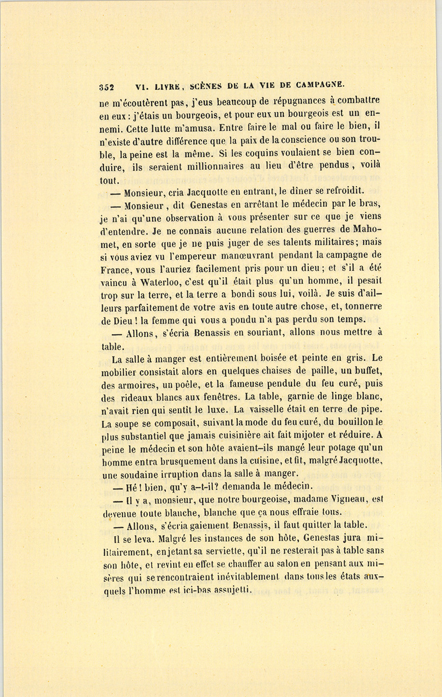 À ce nom, proféré presque impérieusement, une voix de femme répondit dans l’intérieur de la maison. Un moment après, Jacquotte prit l’offensive en appelant à son tour Benassis, qui vint promptement dans la salle à manger.