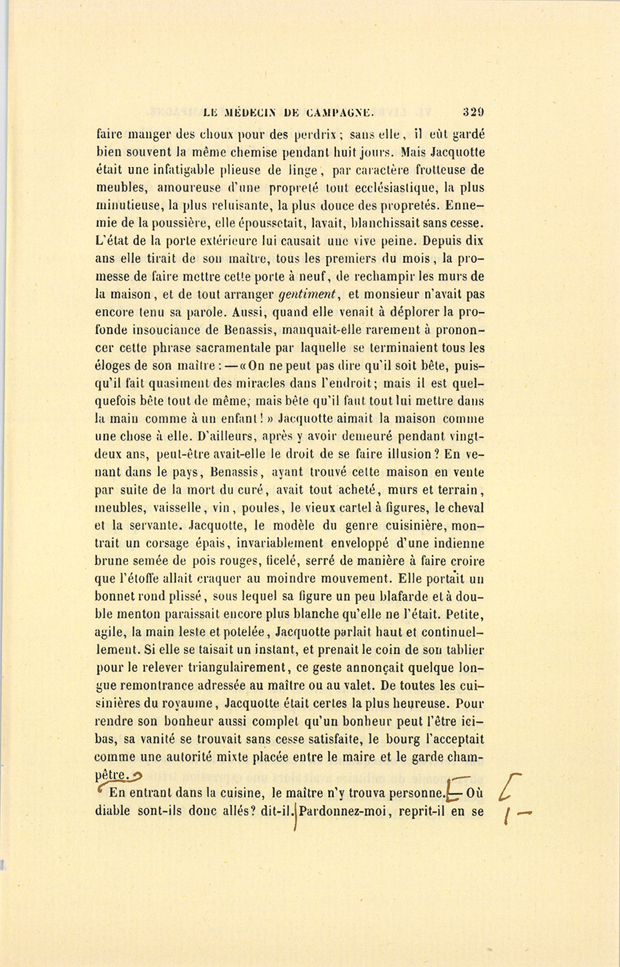 Après ce combat, dans lequel il n’y eut pas chez Benassis le moindre désir de paraître ni généreux ni philanthrope, le prétendu malade entra dans la maison de son médecin où tout se trouva conforme au délabrement de la porte et aux vêtements du possesseur. Les moindres choses y attestaient l’insouciance la plus profonde pour ce qui n’était pas d’une essentielle utilité. Benassis fit passer Genestas par la cuisine, le chemin le plus court pour aller à la salle à manger. Si cette cuisine, enfumée comme celle d’une auberge, était garnie d’ustensiles en nombre suffisant, ce luxe était l’œuvre de Jacquotte, ancienne servante de curé, qui disait nous, et régnait en souveraine sur le ménage du médecin. S’il y avait en travers du manteau de la cheminée une bassinoire bien claire, probablement Jacquotte aimait à se coucher chaudement en hiver, et par ricochet bassinait les draps de son maître, qui, disait-elle, ne songeait à rien ; mais Benassis l’avait prise à cause de ce qui eût été pour tout autre un intolérable défaut. Jacquotte voulait dominer au logis, et le médecin avait désiré rencontrer une femme qui dominât chez lui. Jacquotte achetait, vendait, accommodait, changeait, plaçait et déplaçait, arrangeait et dérangeait tout selon son bon plaisir ; jamais son maître ne lui avait fait une seule observation. Aussi Jacquotte administrait-elle sans contrôle la cour, l’écurie, le valet, la cuisine, la maison, le jardin et le maître. De sa propre autorité se changeait le linge, se faisait la lessive et s’emmagasinaient les provisions. Elle décidait de l’entrée au logis et de la mort des cochons, grondait le jardinier, arrêtait le menu du déjeuner et du dîner, allait de la cave au grenier, du grenier dans la cave, en y balayant tout à sa fantaisie sans rien trouver qui lui résistât. Benassis n’avait voulu que deux choses : dîner à six heures, et ne dépenser qu’une certaine somme par mois. Une femme à laquelle tout obéit chante toujours ; aussi Jacquotte riait-elle, rossignolait-elle par les escaliers, toujours fredonnant quand elle ne chantait point, et chantant quand elle ne fredonnait pas. Naturellement propre, elle tenait la maison proprement. Si son goût eût été différent, monsieur Benassis eût été bien malheureux, disait-elle, car le pauvre homme était si peu regardant qu’on pouvait lui {p. 329} faire manger des choux pour des perdrix ; sans elle, il eût gardé bien souvent la même chemise pendant huit jours. Mais Jacquotte était une infatigable plieuse de linge, par caractère frotteuse de meubles, amoureuse d’une propreté tout ecclésiastique, la plus minutieuse, la plus reluisante, la plus douce des propretés. Ennemie de la poussière, elle époussetait, lavait, blanchissait sans cesse. L’état de la porte extérieure lui causait une vive peine. Depuis dix ans elle tirait de son maître, tous les premiers du mois, la promesse de faire mettre cette porte à neuf, de rechampir les murs de la maison, et de tout arranger gentiment, et monsieur n’avait pas encore tenu sa parole. Aussi, quand elle venait à déplorer la profonde insouciance de Benassis, manquait-elle rarement à prononcer cette phrase sacramentale par laquelle se terminaient tous les éloges de son maître : – « On ne peut pas dire qu’il soit bête, puisqu’il fait quasiment des miracles dans l’endroit ; mais il est quelquefois bête tout de même, mais bête qu’il faut tout lui mettre dans la main comme à un enfant ! » Jacquotte aimait la maison comme une chose à elle. D’ailleurs, après y avoir demeuré pendant vingt-deux ans, peut-être avait-elle le droit de se faire illusion ? En venant dans le pays, Benassis, ayant trouvé cette maison en vente par suite de la mort du curé, avait tout acheté, murs et terrain, meubles, vaisselle, vin, poules, le vieux cartel à figures, le cheval et la servante. Jacquotte, le modèle du genre cuisinière, montrait un corsage épais, invariablement enveloppé d’une indienne brune semée de pois rouges, ficelé, serré de manière à faire croire que l’étoffe allait craquer au moindre mouvement. Elle portait un bonnet rond plissé, sous lequel sa figure un peu blafarde et à double menton paraissait encore plus blanche qu’elle ne l’était. Petite, agile, la main leste et potelée, Jacquotte parlait haut et continuellement. Si elle se taisait un instant, et prenait le coin de son tablier pour le relever triangulairement, ce geste annonçait quelque longue remontrance adressée au maître ou au valet. [ill.] De toutes les cuisinières du royaume, Jacquotte était certes la plus heureuse. Pour rendre son bonheur aussi complet qu’un bonheur peut l’être ici-bas, sa vanité se trouvait sans cesse satisfaite, le bourg l’acceptait comme une autorité mixte placée entre le maire et le garde champêtre. En entrant dans la cuisine, le maître n’y trouva personne.
